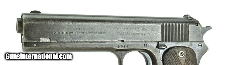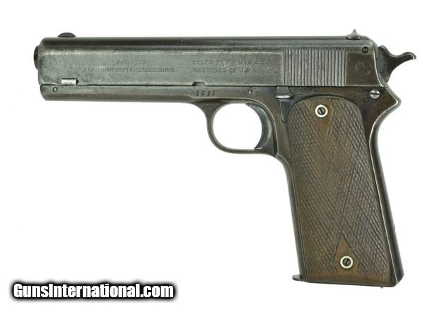 Colt 1905 .45 Auto caliber pistol. Manufactured in 1911. Metal has a brown patina. Pistol has carry wear, otherwise good overall condition. An early .45 caliber Colt Auto.