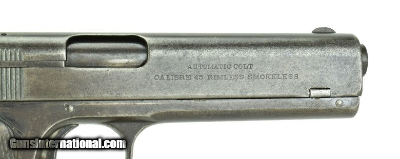 Description: Colt 1905 .45 Auto caliber pistol. Manufactured in 1911. Metal has a brown patina. Pistol has carry wear, otherwise good overall condition. An early .45 caliber Colt Auto.