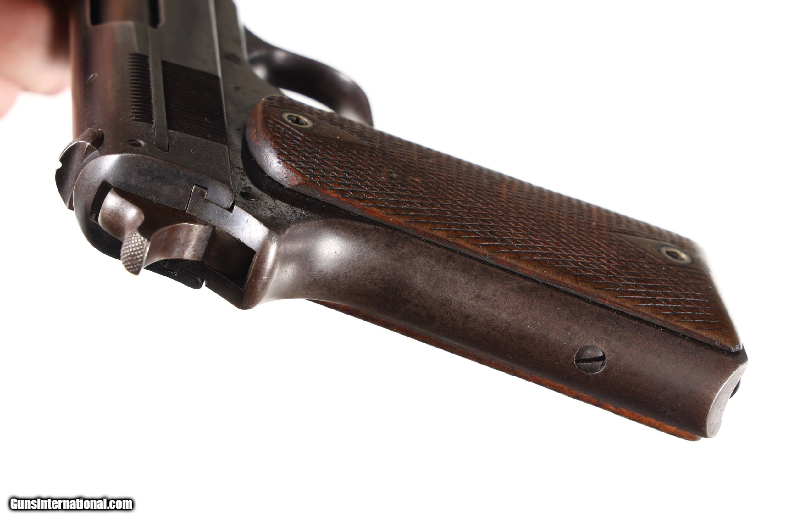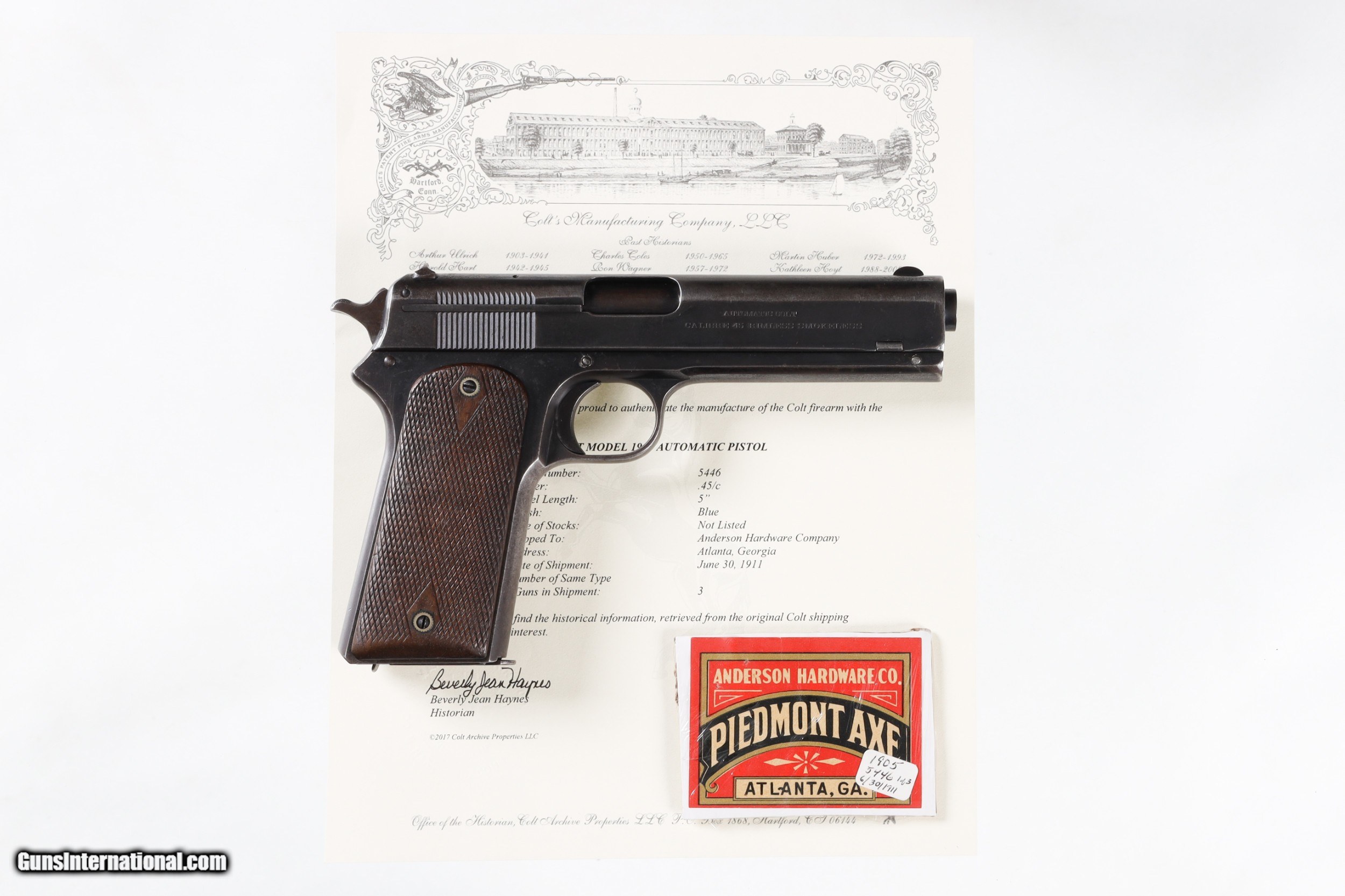 Description: Very good plus overall condition retaining 40% original finish fading to smooth patina. The included factory letter lists this pistol as having a 5 inch barrel chambered in .45 caliber with blue finish and stocks not listed when shipped to Anderson Hardware Company in Atlanta, Georgia on June 30, 1911. • Free Shipping, No Credit Card Fees. • Lay-a-way available for this firearm. • 1/3 Down, a 1/3 in 30 Days 1/3 in 60 Days. SOLD Curio/Relic: Yes Manufacturer: Colt Model: 1905 Serial Number: 5446 Barrel Length: 5 |