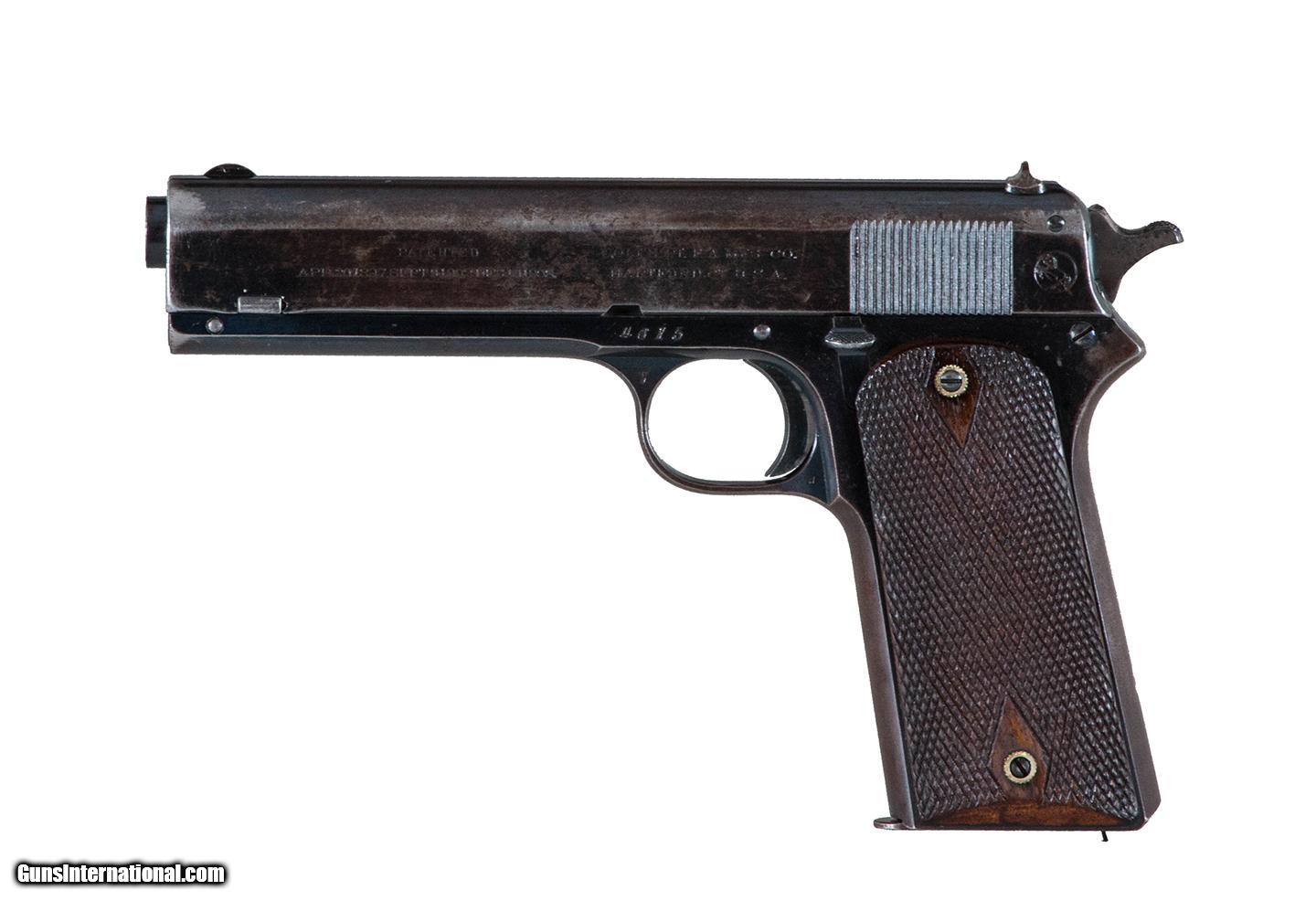 Description: This is an original .45 caliber Colt 1905 manufactured in 1910. The pistol is completely original, with about 60% original finish remaining. This Colt 1905 comes with one original magazine, and has double diamond checkered walnut grips. The gun is in very good condition for a Colt 1905 built in 1910. Given this guns condition and price, it will not be here for long. For more information or photos, please call 585-657-6338. SOLD Manufacturer: Colt Model: 1905 Serial Number: 4615 Caliber Info: .45 Condition: Original Action: Semi Auto Manufacture Date: 1910 Item Location: NY |