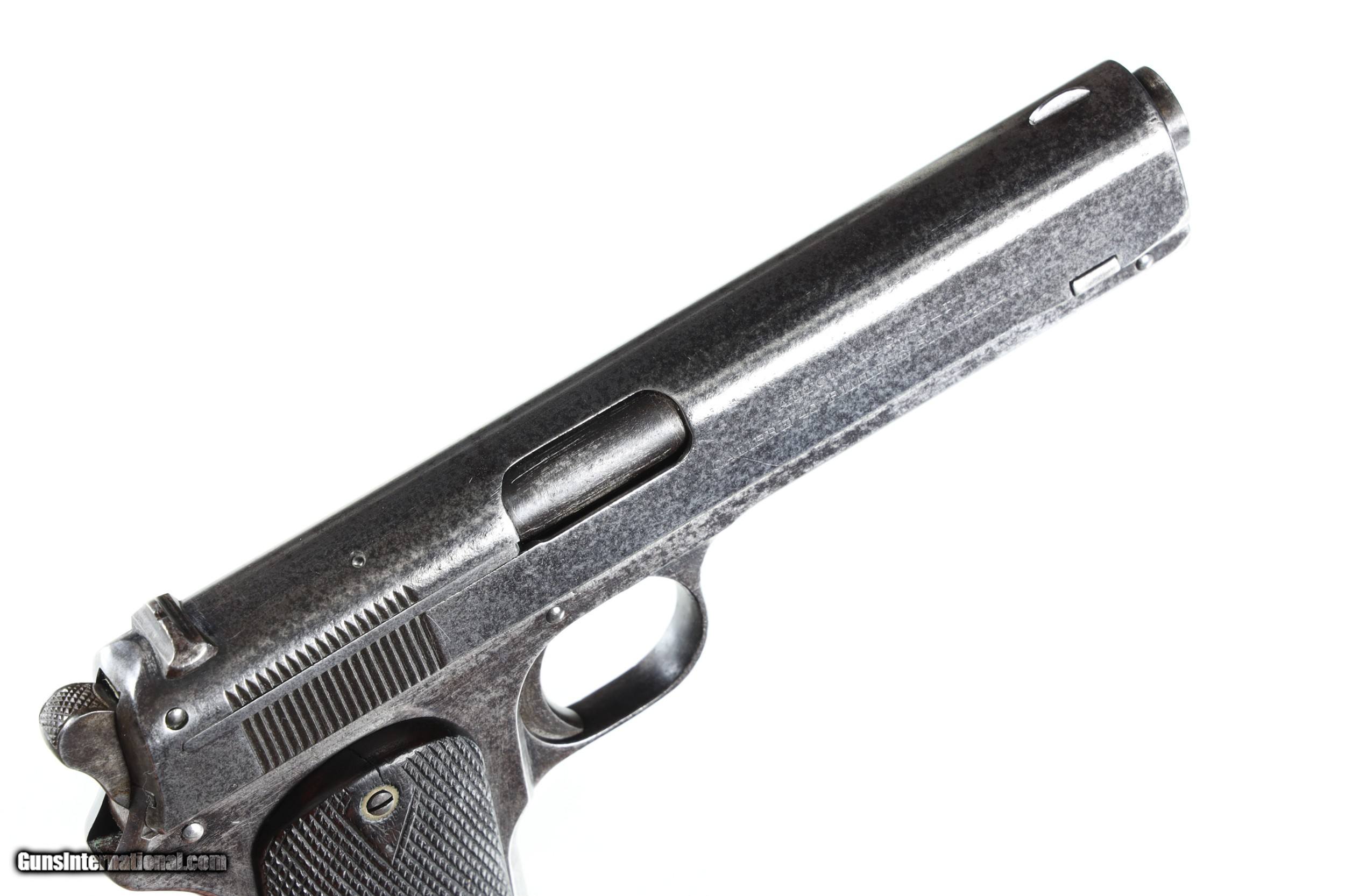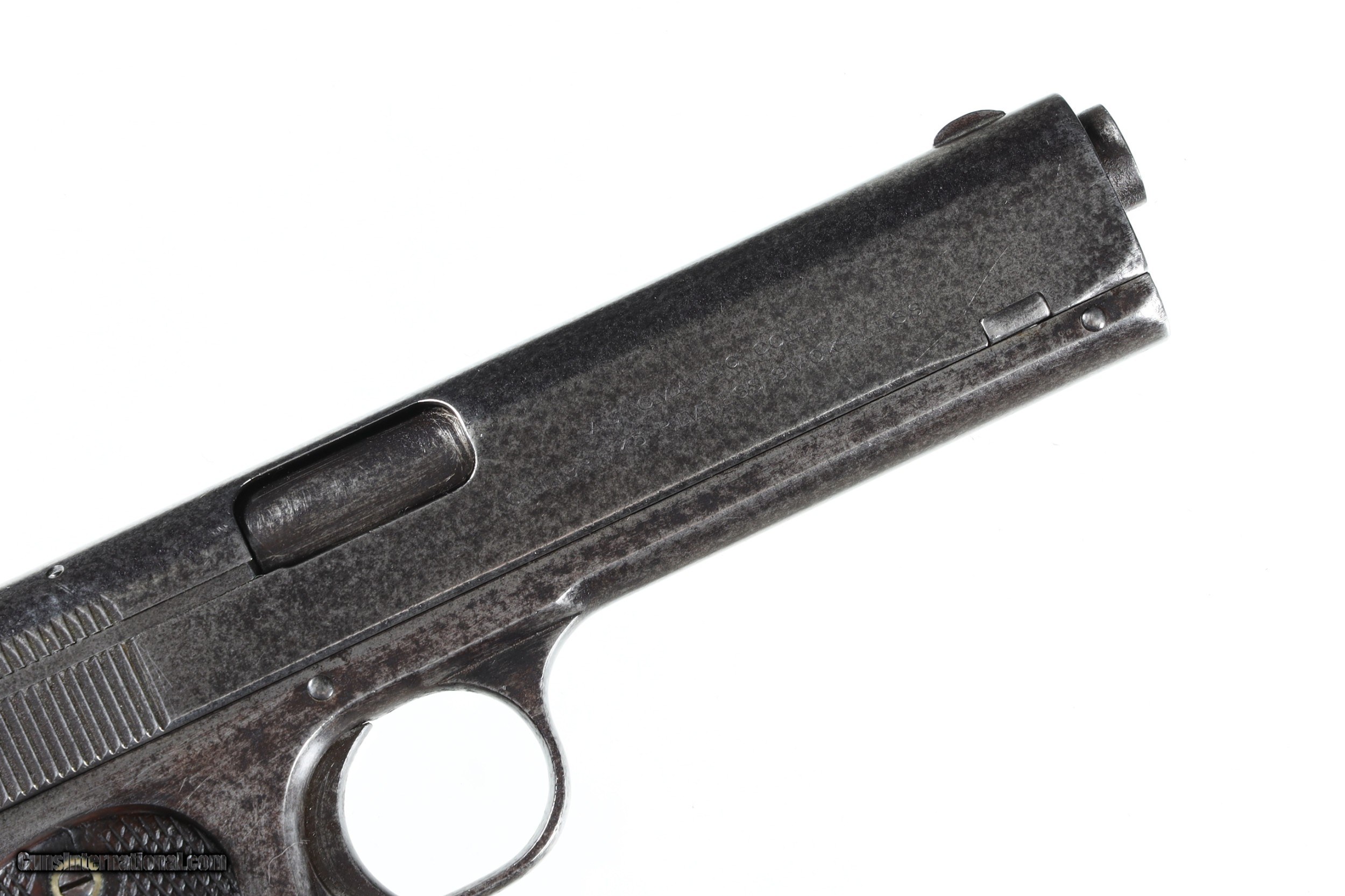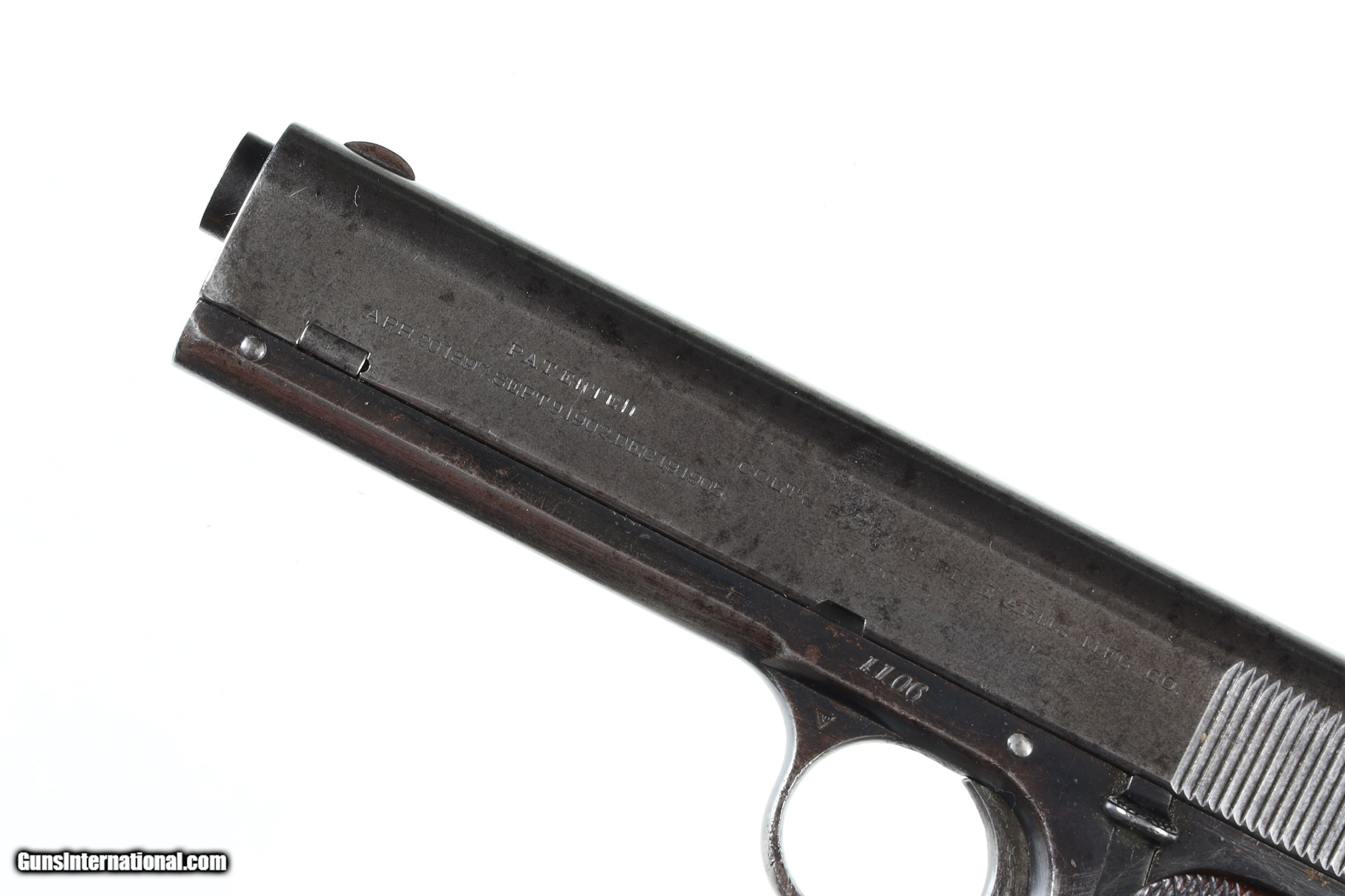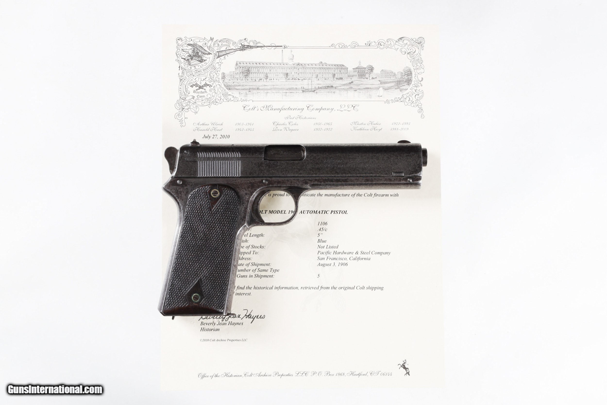 Description: Good overall condition, traces of original finish in protected areas. Included factory letter confirms the current configuration of this pistol when shipped to Pacific Hardware & Steel Company in San Francisco, California on August 3, 1906 in a 5 gun shipment. • Free Shipping, No Credit Card Fees. • Lay-a-way available for this firearm. • 1/3 Down, a 1/3 in 30 Days 1/3 in 60 Days. SOLD Curio/Relic: Yes Manufacturer: Colt Model: 1905 Serial Number: 1106 Barrel Length: 5 |