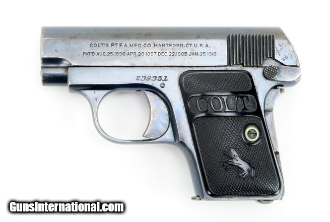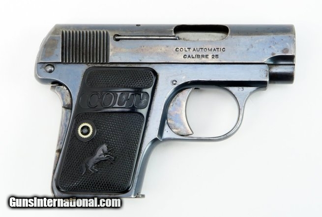Description: Colt 1908 Pocket Pistol .25 ACP caliber pistol. Made in 1919. 80% of the original blue. Good case colors remain on both the safety and trigger.
