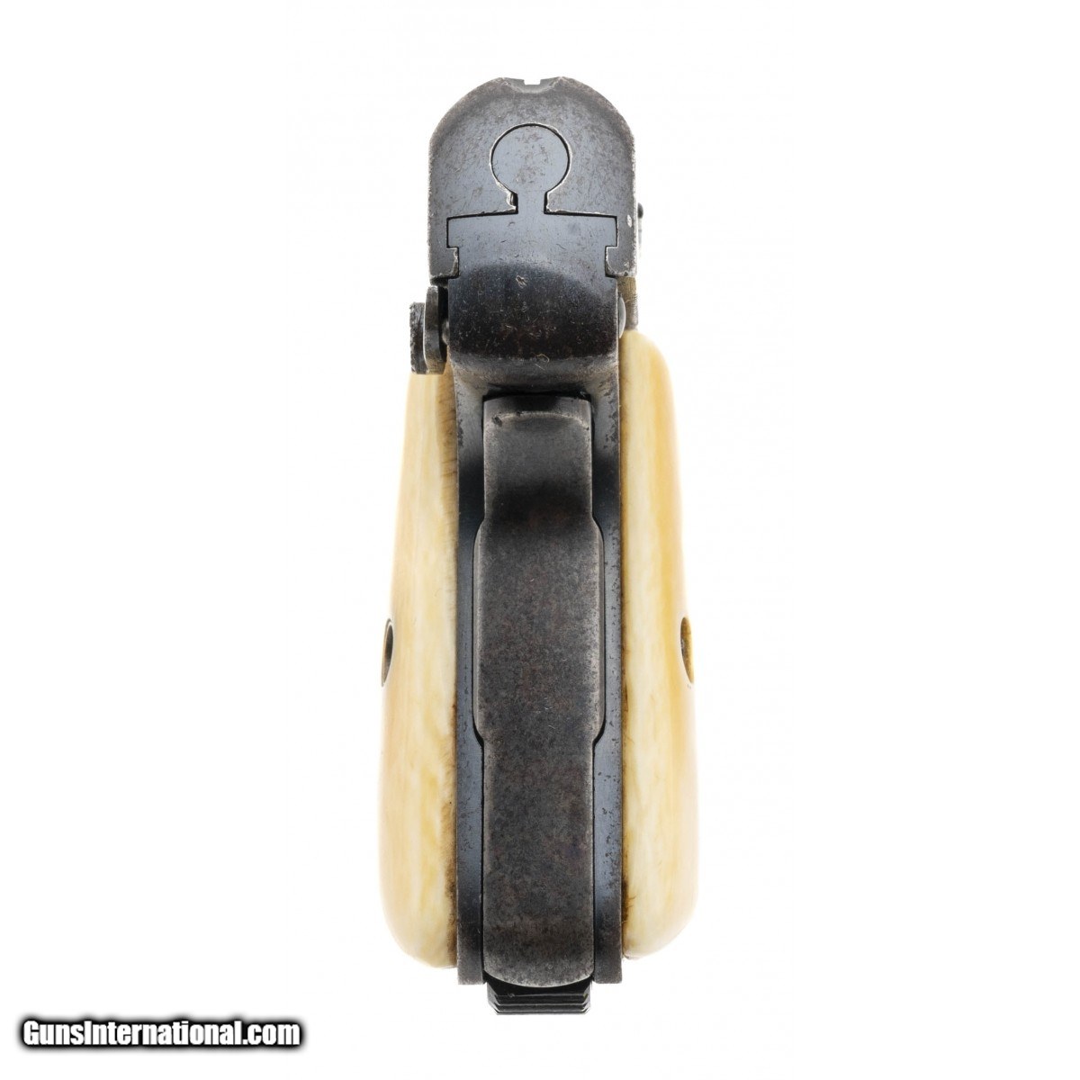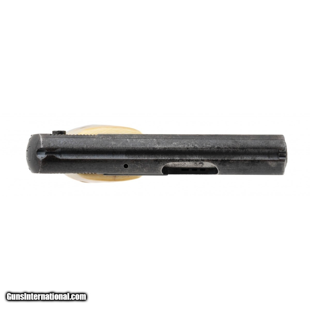 Description: " SN:327050. Made in 1923, .25 ACP, with a 2"" barrel. Bore is very good. Pre war vest pocket semi automatic pistol. Has 50% of original finish with patina. Grips are very good with one small crack. Overall in very good condition. Consignment. SOLD |