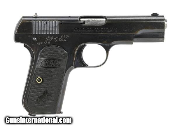 Description: "Colt 1908 .380 ACP caliber pistol. Pocket hammerless made in 1922. Right frame is engraved Joe C. Cox. Bore has strong rifling with frosting. Approximately 85% original finish with patina. Good to very good overall condition. SOLD Curio/Relic: Yes |