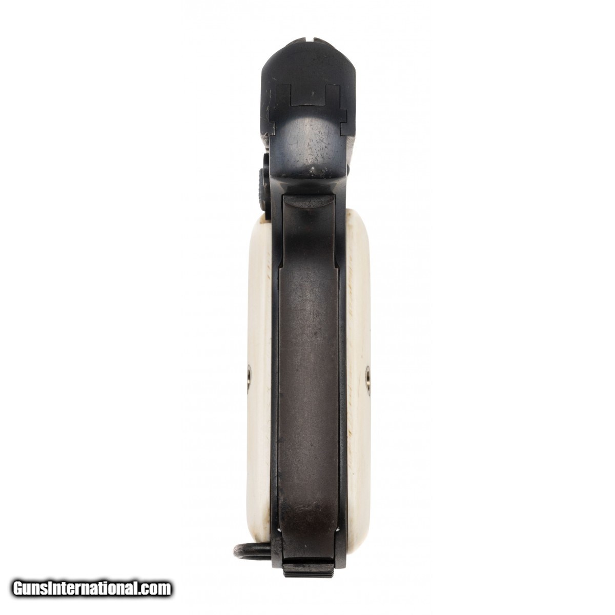 Description: " Pre-war pocket auto made in 1928. Has about 95% original blue with light wear throughout. The bore is very good with light etching. The grips are ivory. A good looking Colt .380 pocket auto. SOLD |