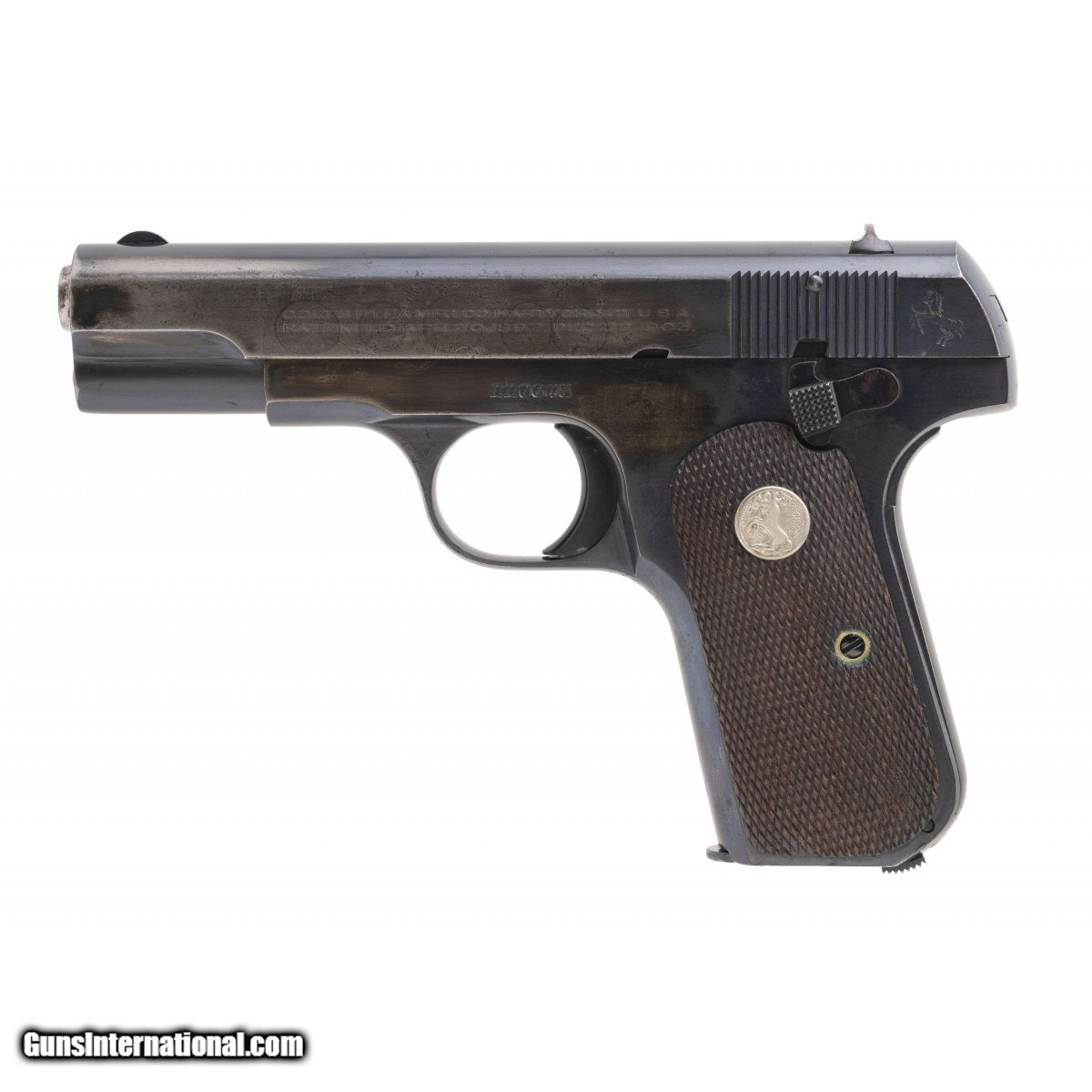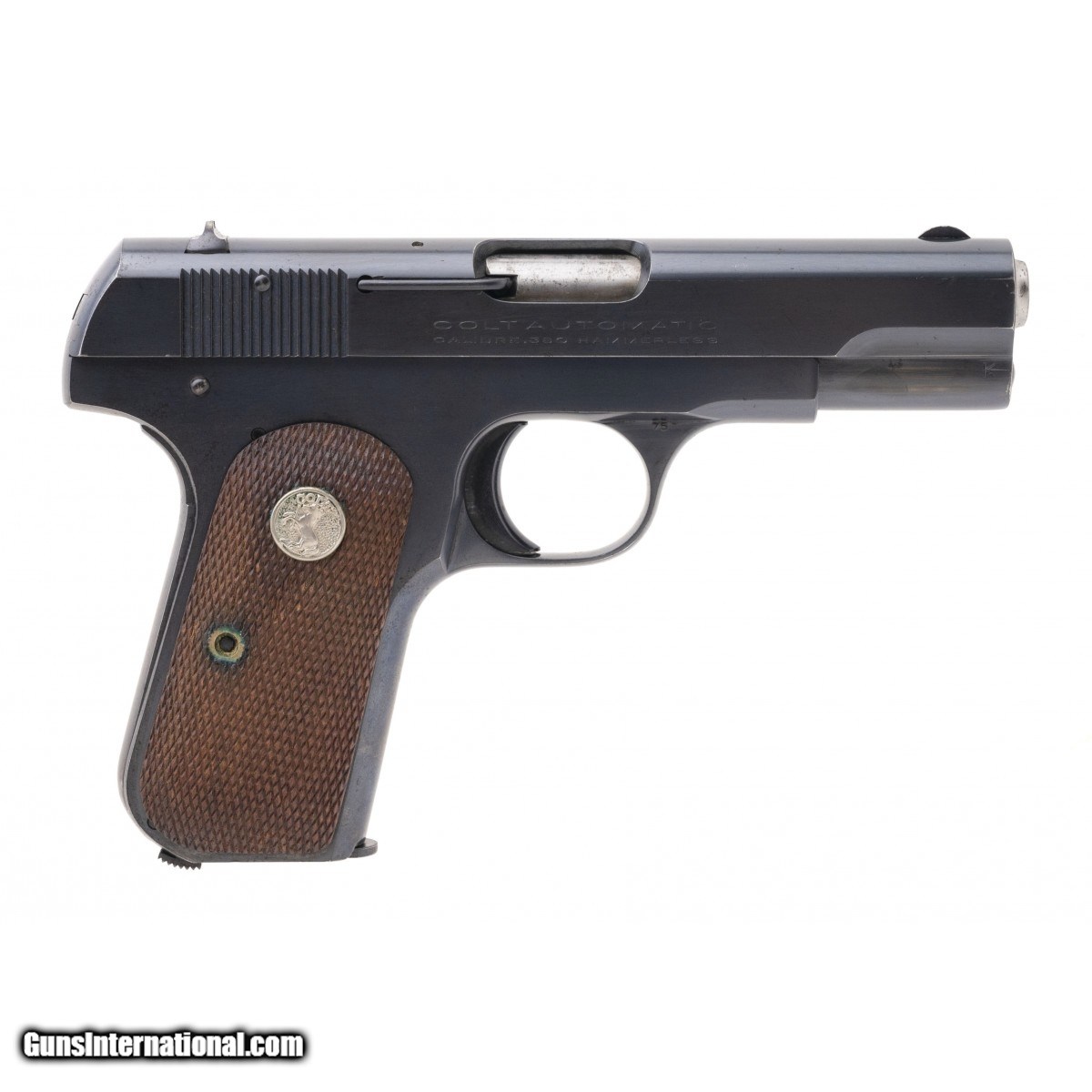 SN: 110645. Made in 1932. .380 with a 3.75"" barrel. Bore is bright with strong rifling. Colt Hammerless pistol. Finish is in good condition with areas beginning to thin on the left side of the pistol. Original Colt checkered grips are in good condition with expected handling wear. Action functions correctly. Overall good condition.