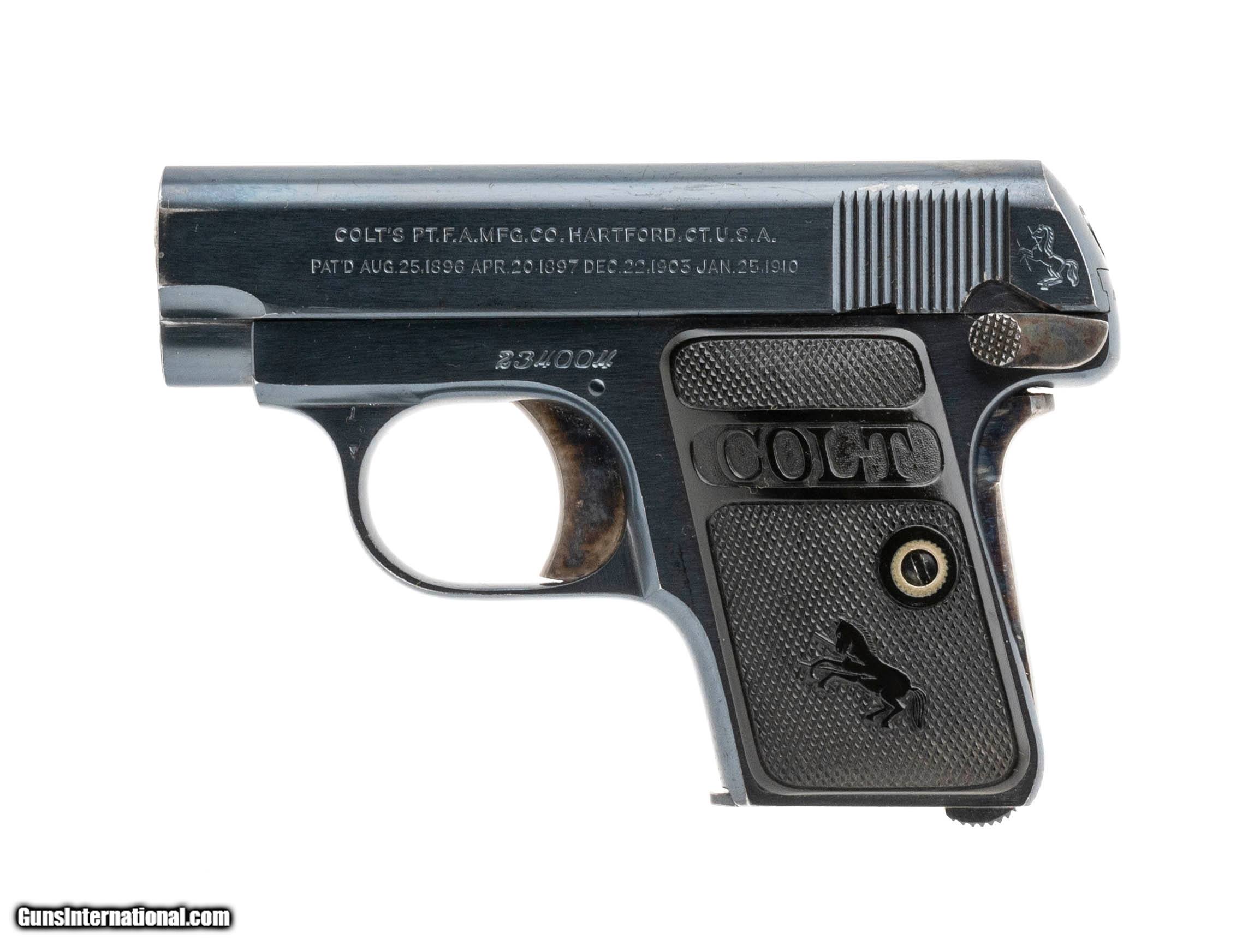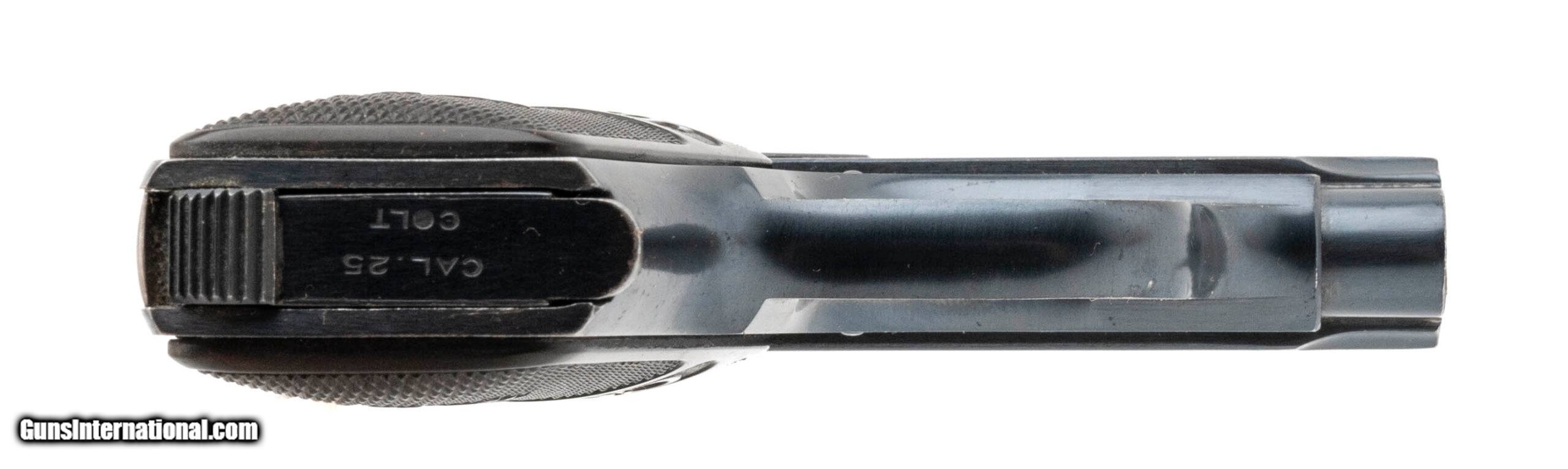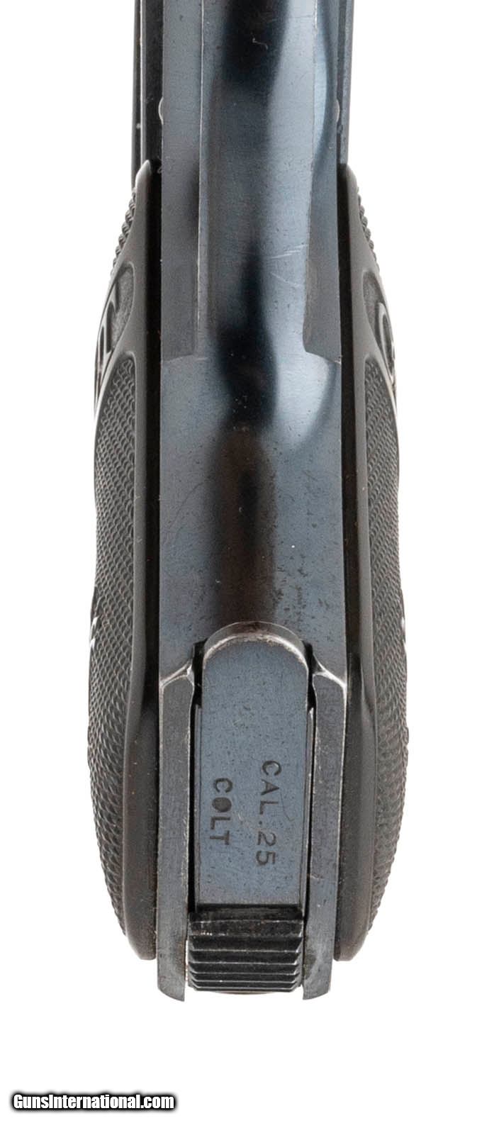 Description: "Serial number 234004. Made in 1920. 25 ACP caliber with a 2" barrel. This gun is in excellent condition with 99% of the original blue finish. All of the case colors remain on the trigger and safety. Grips are excellent. SOLD Curio/Relic: Yes |