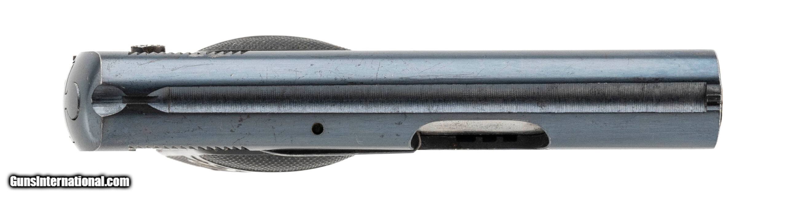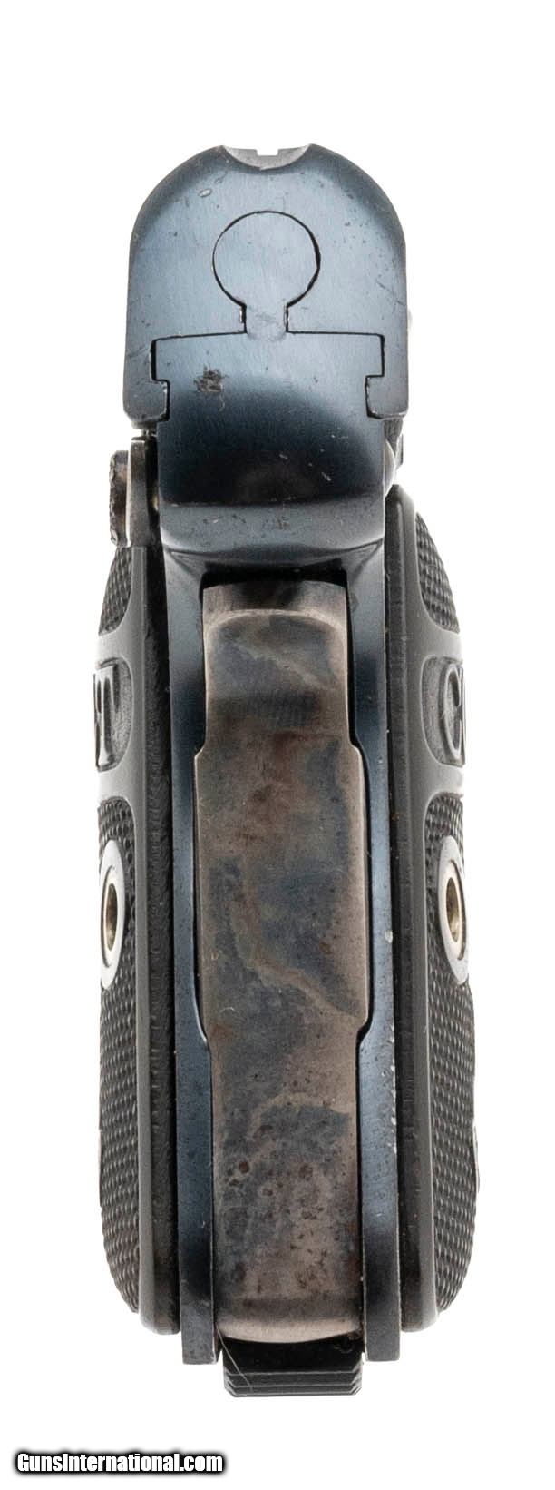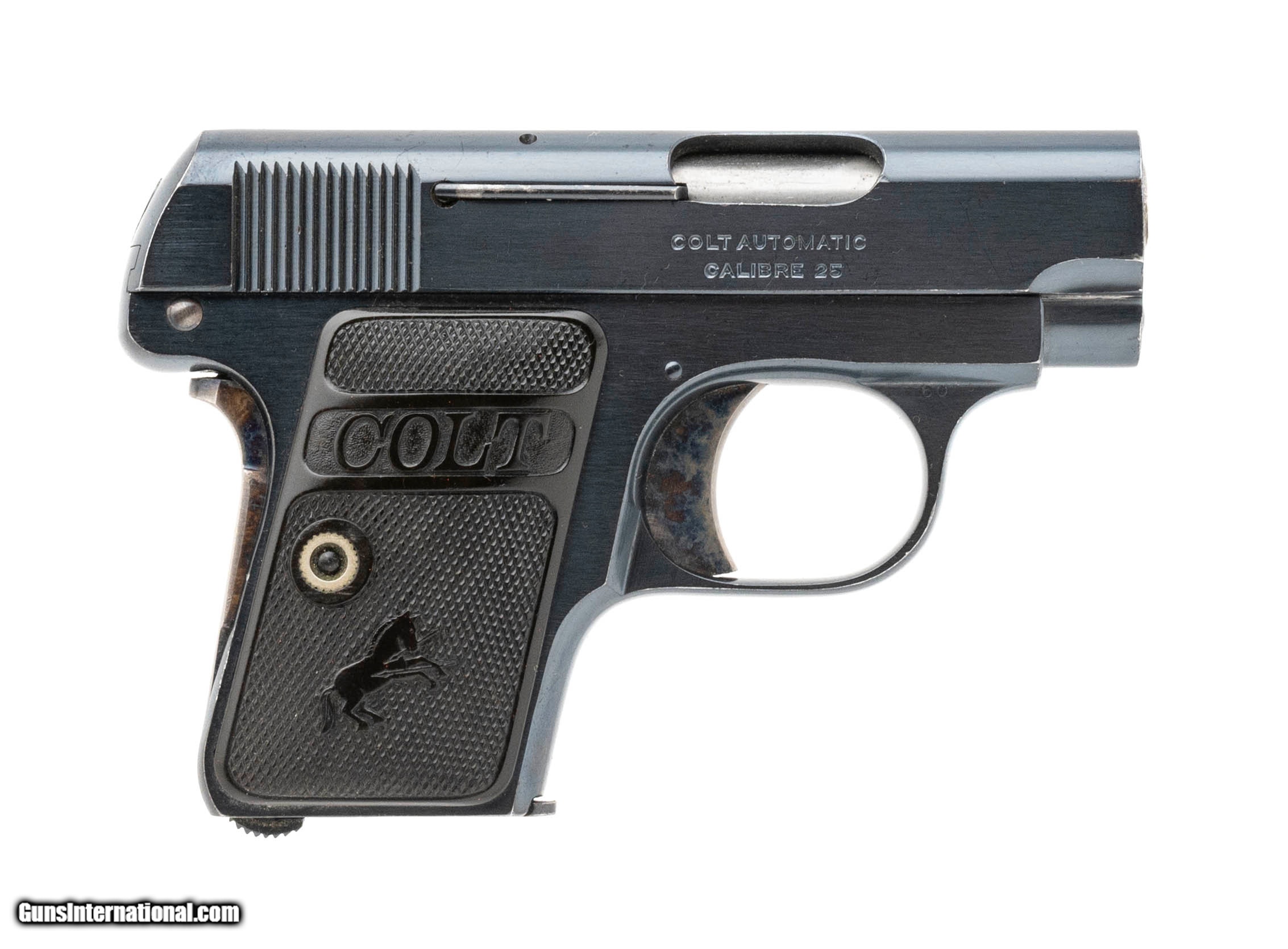 Description: "Serial number 234004. Made in 1920. 25 ACP caliber with a 2" barrel. This gun is in excellent condition with 99% of the original blue finish. All of the case colors remain on the trigger and safety. Grips are excellent. SOLD Curio/Relic: Yes |