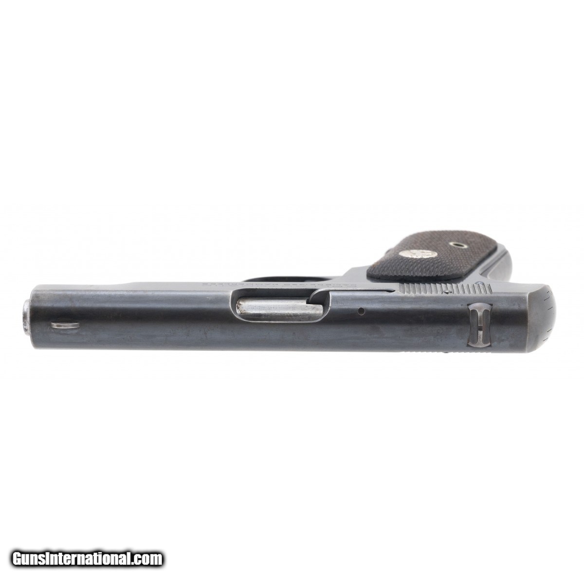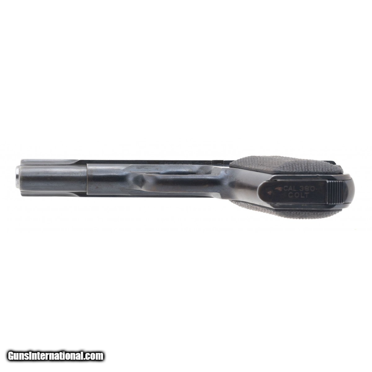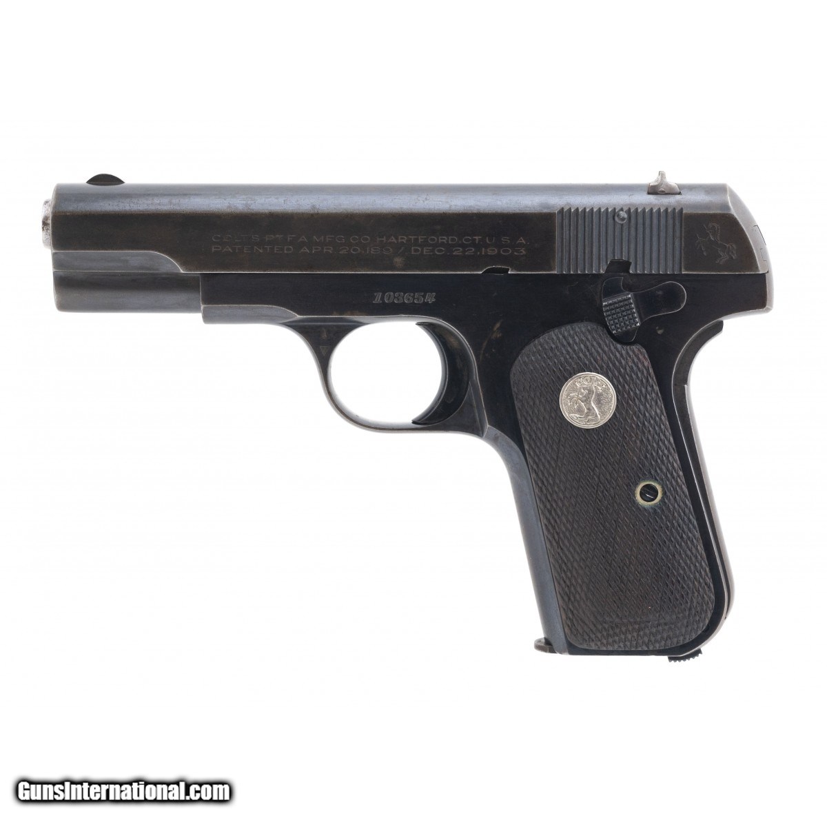 Description: " SN: 103654. Made in 1929, .380 ACP, 3.75-inch barrel. Overall good condition with some holster wear, a very good bore, original wood grips & one factory original COLT seven-round magazine. SOLD |