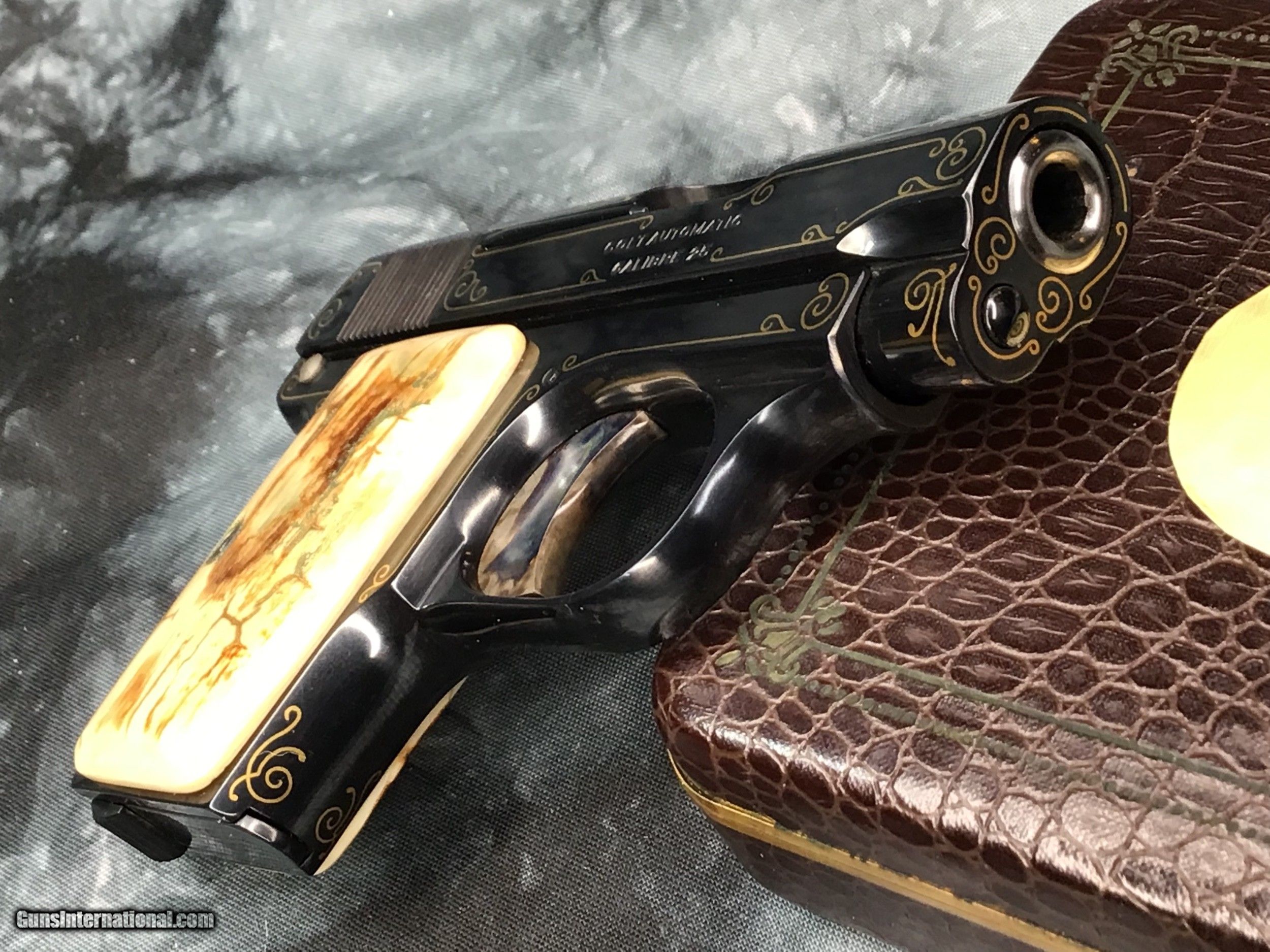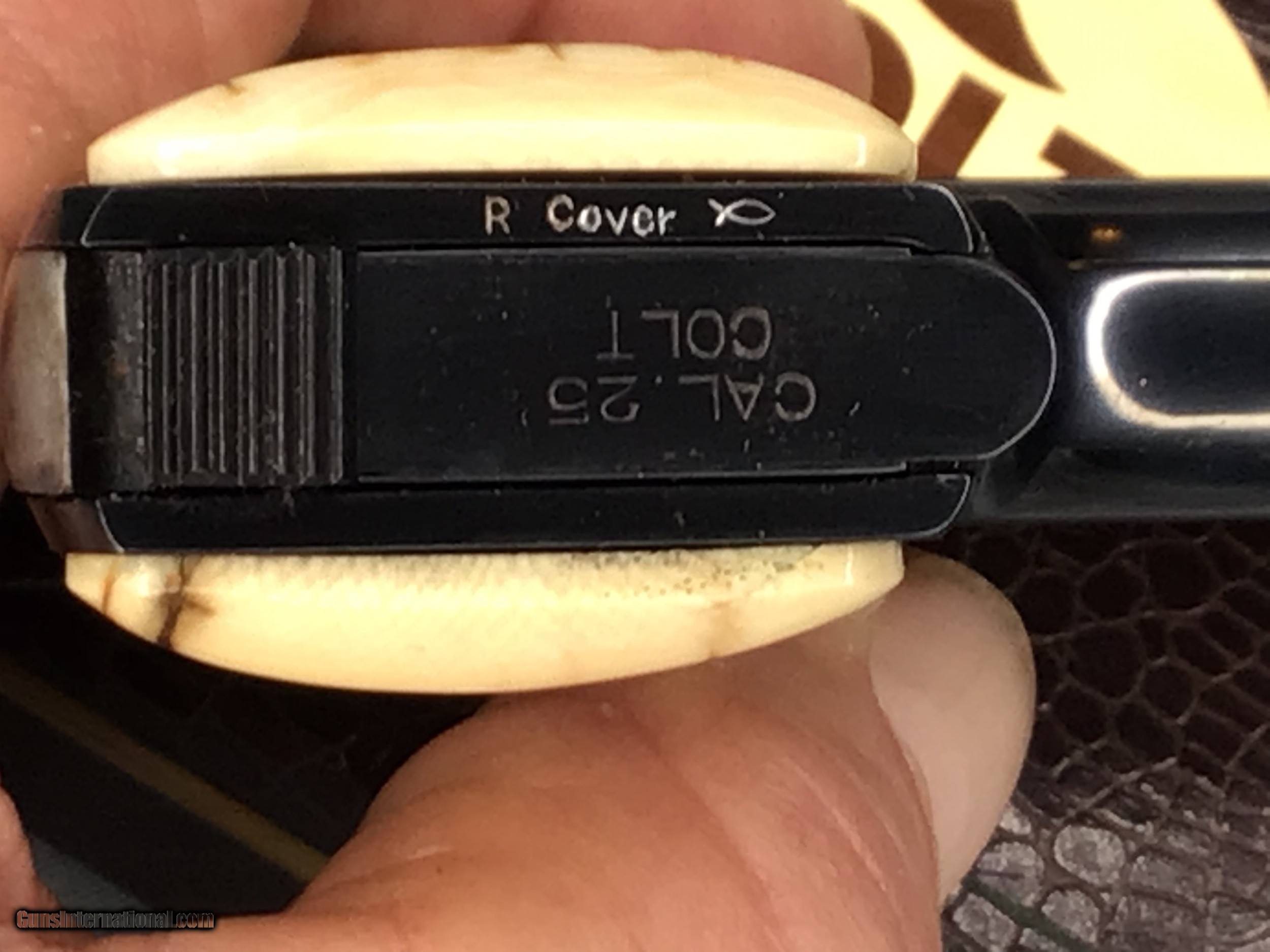 Description: 1919 Mfg. Colt 1908 Vest Pocket .25, Gold Inlay and hand engraved by Master Ray Cover. Gorgeous presentation in 99% condition with custom Mammoth Ivory grips. Comes in Custom clamshell case with Colt Logo. A beautiful piece of the gunmakers art in steel and Gold. Add 3% if paying with credit card. Free shipping for US Veterans. God Bless America from a proud American, and a Viet Nam Vet , thankful for our freedoms.. paid for by the Blood ,Sweat and Tears of our brave men and women in uniform. Ten Below Firearms is a Veteran owned and operated business. We specialize in out of production models of high quality firearms. We love to ship! We ship to all states where legal, just give us a call! Handguns normally ship for $35 and Long guns for $50 and up for extra length long guns. That's 2-3 day USPS Priority shipping, Delivery conformation and with tracking number. Optional Postal insurance is additional $1.75 per $100 and highly recommended. We are OPEN BY APPOINTMENT ONLY FOR IN PERSON VISITS, We trade, sometimes. Layaway:If needed we offer a 60 day layaway program. Terms, 1/3 of purchase price down, 1/3 due in 30 days, and the final third to include card fees and shipping due at 60 days. Funds are non transferable and non refundable .Layaway is not available on negotiated prices. SOLD Curio/Relic: Yes Handgun Caliber: .25 ACP (6.35mm Browning, 6.35×16mmSR) Manufacturer: Colt Model: 1908 Serial Number: 219893 Barrel Length: Short Condition: Excellent 99% Metal Condition: Excellent Bore Condition: Excellent Action: Semi-auto Triggers: SA Finish: Blued Sights: Fixed not h Manufacture Date: 1919 Engraving: 100% Case: Clamshell case Item Location: Mn |