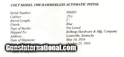 Description: Gorgeous Colt 1908 fitted with Colt factory pearl grips. The pistol retains about 98%+ of its original blue finish, with some thinning at the muzzle and some sharp edges of the slide. The bore is bright, with sharp rifling, and the action functions like a new one. The pearl grips are in excellent condition with no cracks or chips. The trigger, safety, and grips safety retain 100% of their original color case-hardened finish. Comes with its original numbered to the gun box with label. Factory Archive letter included. This item qualifies as a C&R. Please view the photos here for the purpose of evaluating the condition for yourself. Shipping & insurance by FedEx is $45 to eligible lower 47 states. No International or California sales. Buyer is responsible for knowing their own local and state laws and whether or not you are prohibited from taking possession of, or owning this firearm. By participating, you are attesting to being of at least 21 years of age. ***The purchaser assumes all risks and should have a qualified Gunsmith evaluate the firearm before attempting to shoot it. *** Please contact me within 3 days of close of for payment. Payment must be by bank certified (cashiers) check or Postal Money Order. Shipping & insurance by FedEx is $45 to eligible lower 47 states. Shipping to AK or HI will have additional costs for which buyer is responsible. I will need a copy of an FFL dealer license or C&R with copy of Driver’s License to ship the gun. There is a 3 day, no-shoot, no disassembly inspection period and the buyer is responsible for cost of shipping both ways if returned. If your FFL dealer will not accept shipment from an individual, I will need an additional $35 to ship through my FFL SOLD Curio/Relic: Yes Manufacturer: Colt Caliber Info: .25 ACP Condition: EXCELLENT Metal Condition: EXCELLENT Bore Condition: EXCELLENT Manufacture Date: 1933 Extras: Factory Archive Letter & Orginal Box |