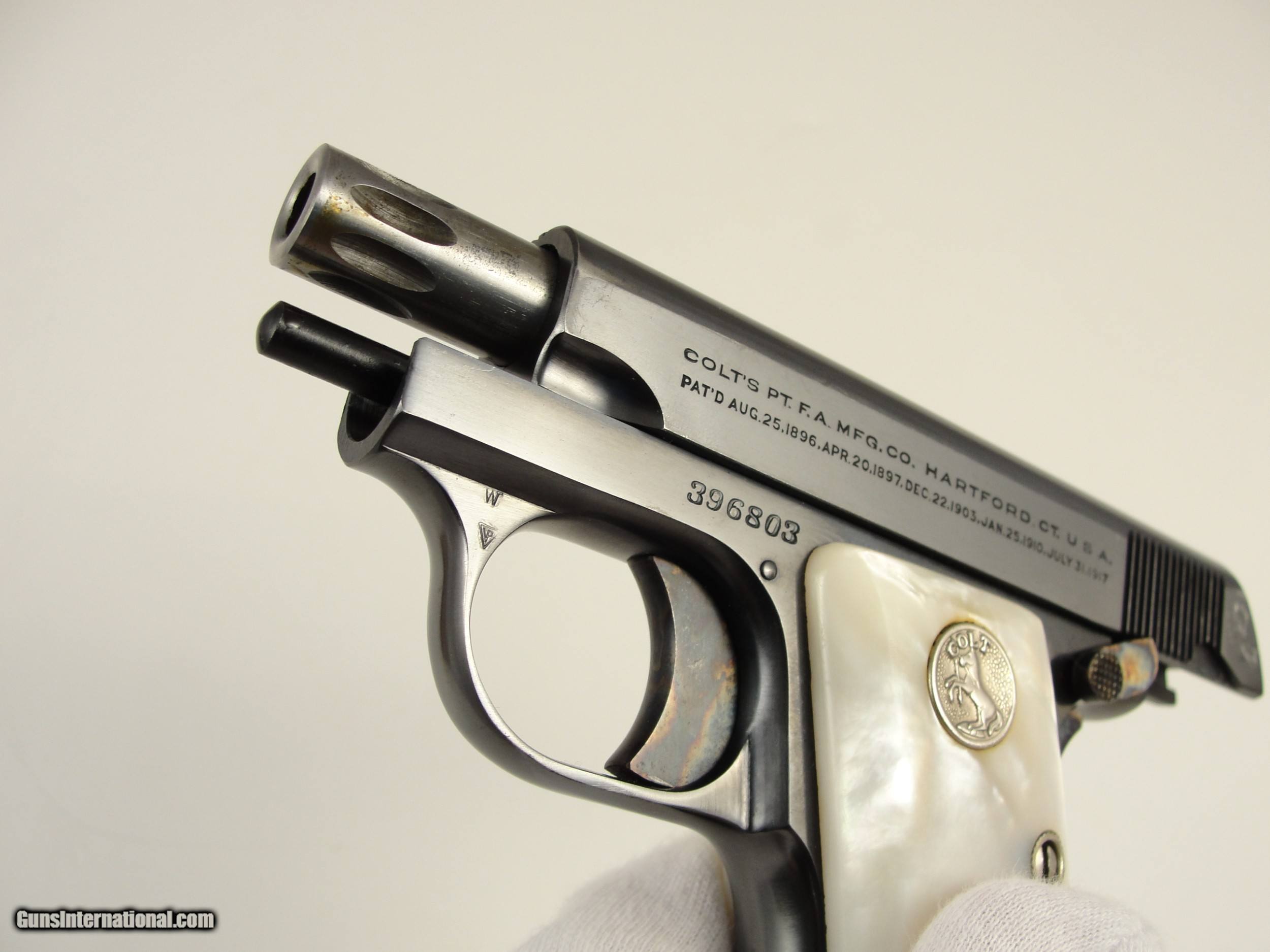 Description: Sold Pending Funds - Gorgeous Colt 1908 fitted with Colt factory pearl grips. The pistol retains about 98%+ of its original blue finish, with some thinning at the muzzle and some sharp edges of the slide. The bore is bright, with sharp rifling, and the action functions like a new one. The pearl grips are in excellent condition with no cracks or chips. The trigger, safety, and grips safety retain 100% of their original color case-hardened finish. Comes with its original numbered to the gun box with label. Factory Archive letter included. This item qualifies as a C&R. Please view the photos here for the purpose of evaluating the condition for yourself. Shipping & insurance by FedEx is $45 to eligible lower 47 states. No International or California sales. Buyer is responsible for knowing their own local and state laws and whether or not you are prohibited from taking possession of, or owning this firearm. By participating, you are attesting to being of at least 21 years of age. ***The purchaser assumes all risks and should have a qualified Gunsmith evaluate the firearm before attempting to shoot it. *** Please contact me within 3 days of close of for payment. Payment must be by bank certified (cashiers) check or Postal Money Order. Shipping & insurance by FedEx is $45 to eligible lower 47 states. Shipping to AK or HI will have additional costs for which buyer is responsible. I will need a copy of an FFL dealer license or C&R with copy of Driver’s License to ship the gun. There is a 3 day, no-shoot, no disassembly inspection period and the buyer is responsible for cost of shipping both ways if returned. If your FFL dealer will not accept shipment from an individual, I will need an additional $35 above the $45 to ship through my FFL as that is what he charges for the service and he is closed Sundays and Mondays. SOLD Curio/Relic: Yes Manufacturer: Colt Model: 1908 - Vest Pocket Caliber Info: .25 ACP Manufacture Date: 1933 Extras: Original Box |