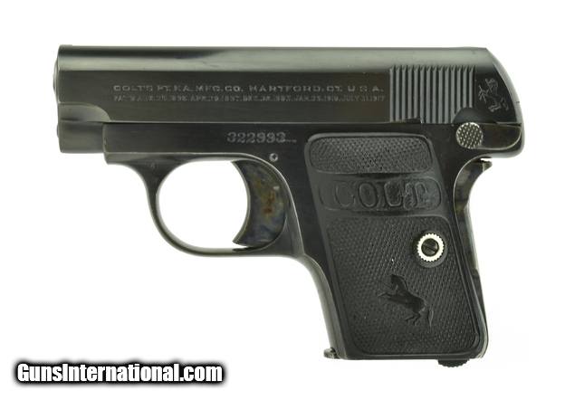 Description: Colt 1908 .25 ACP caliber pistol. Made 1923. Approximately 98% original blue finish with original case colors on small parts. Case colors on grip safety are thinning. Excellent overall condition.
