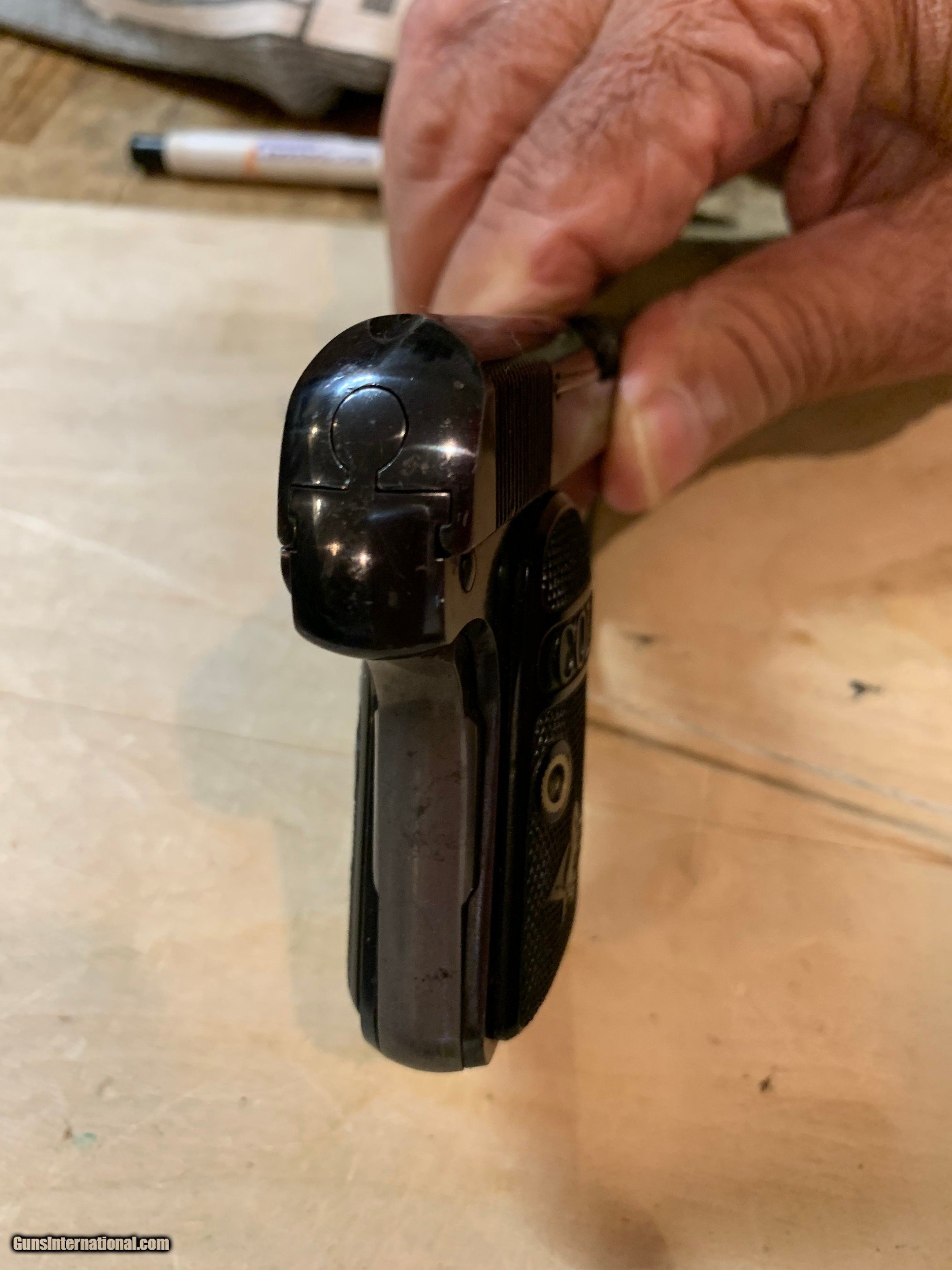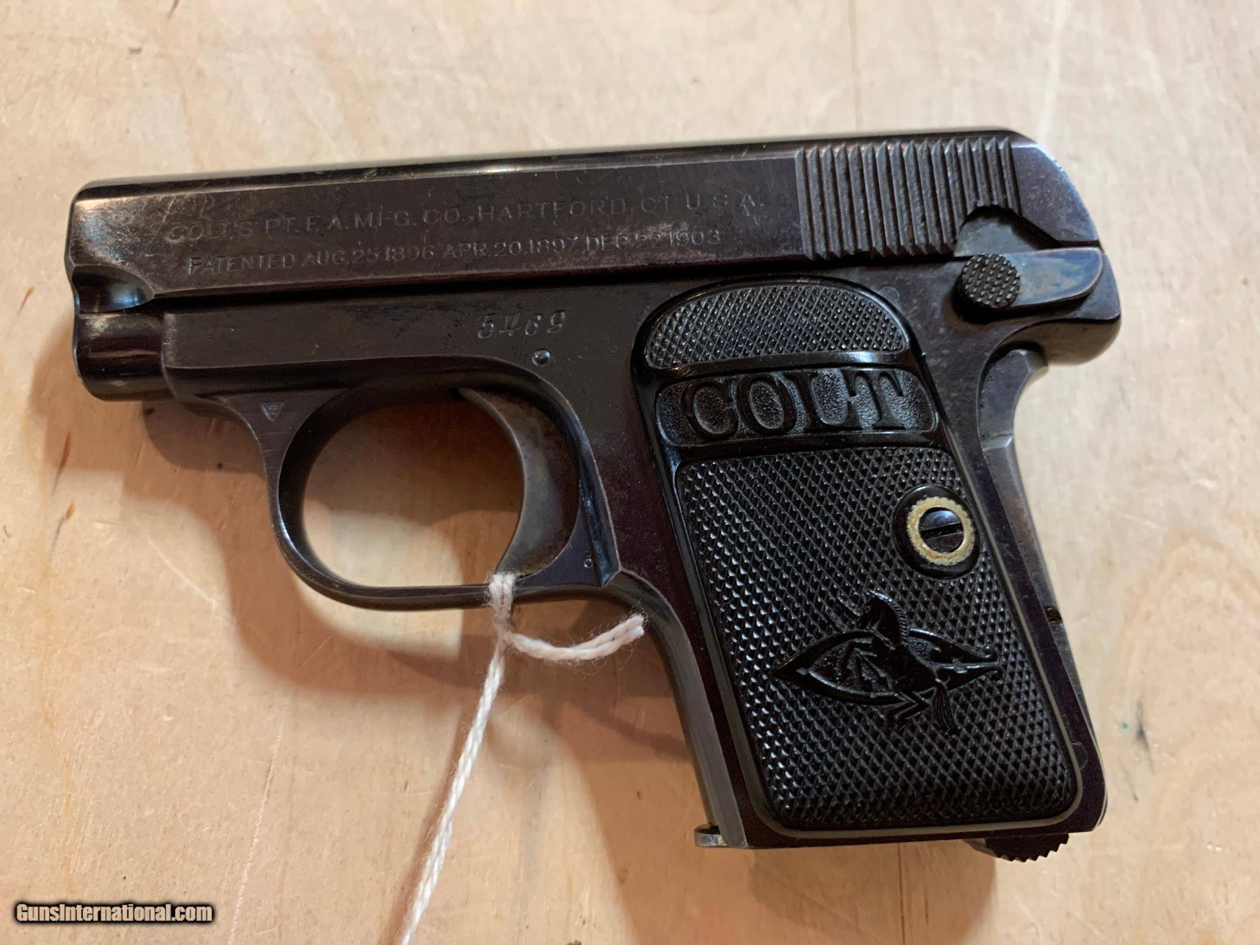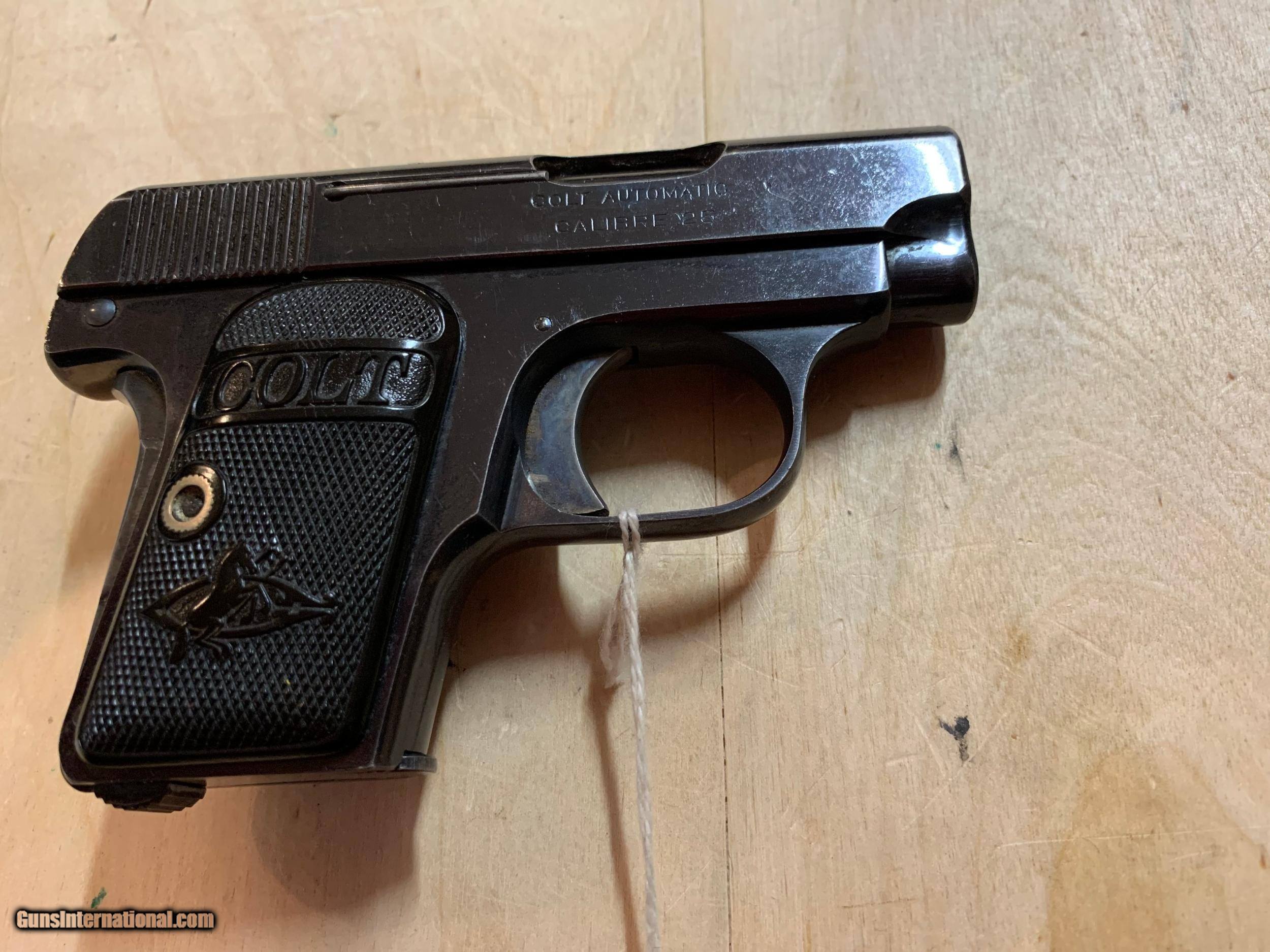Description: 111 year old (1909) Colt 25 auto pistol. That deep colt blue. Grips perfect. SOLD Curio/Relic: Yes |