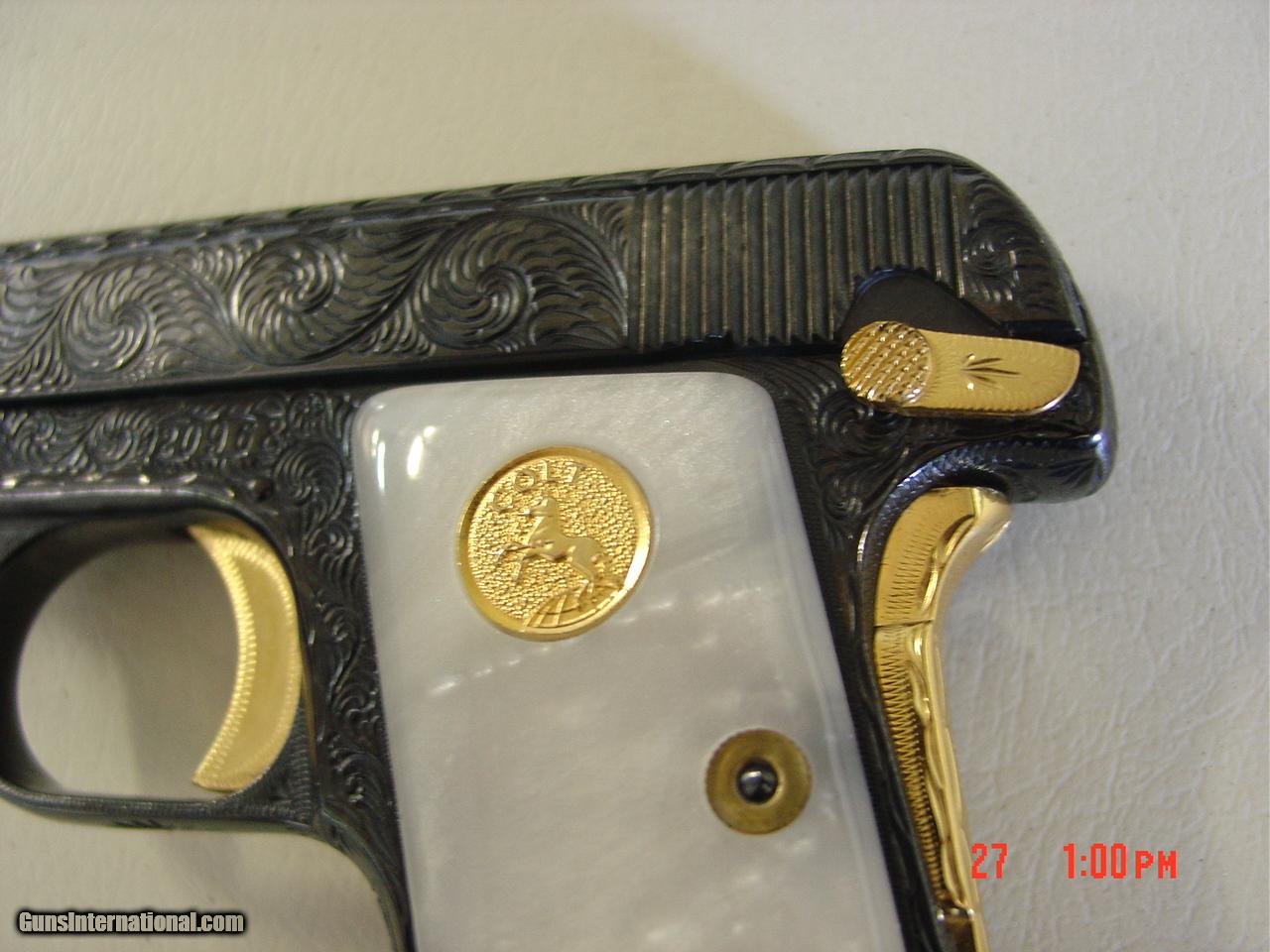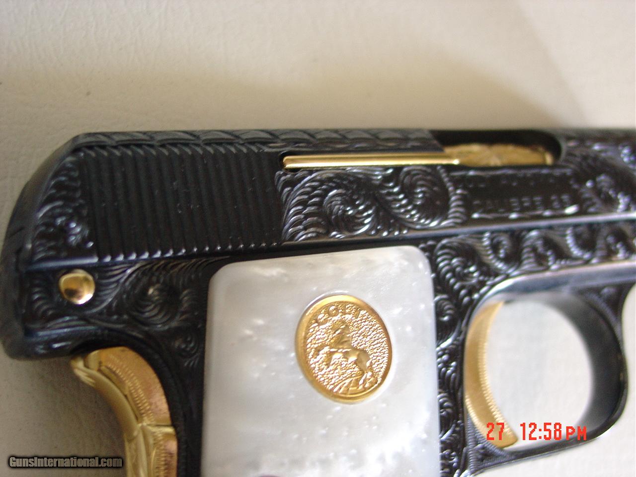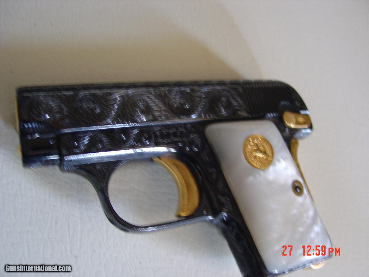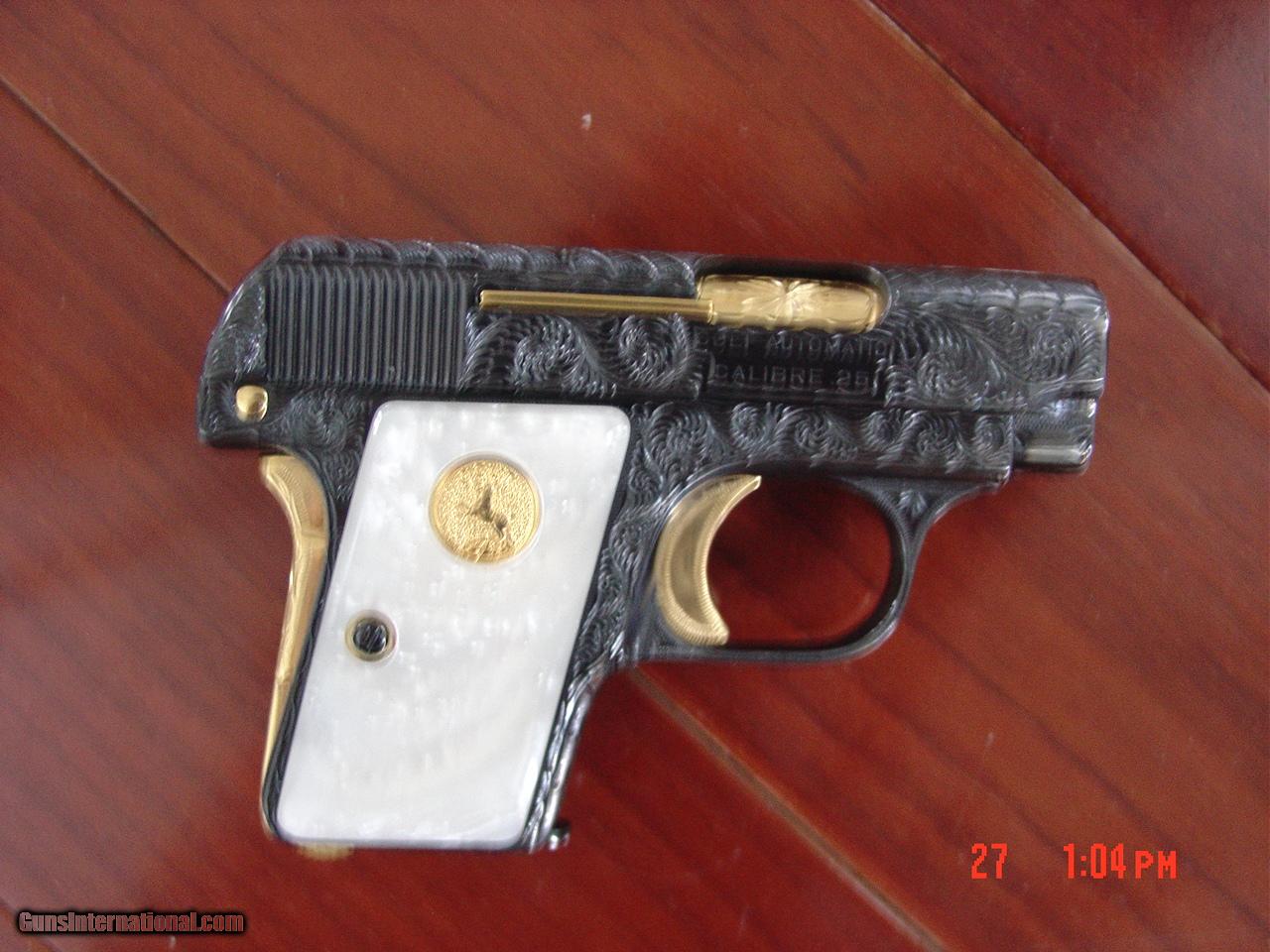 Colt 1908,25 cal,Vest Pocket,fully engraved by Flannery,refinished blue & gold,Pearlite grips,made 1908,a work of art !!