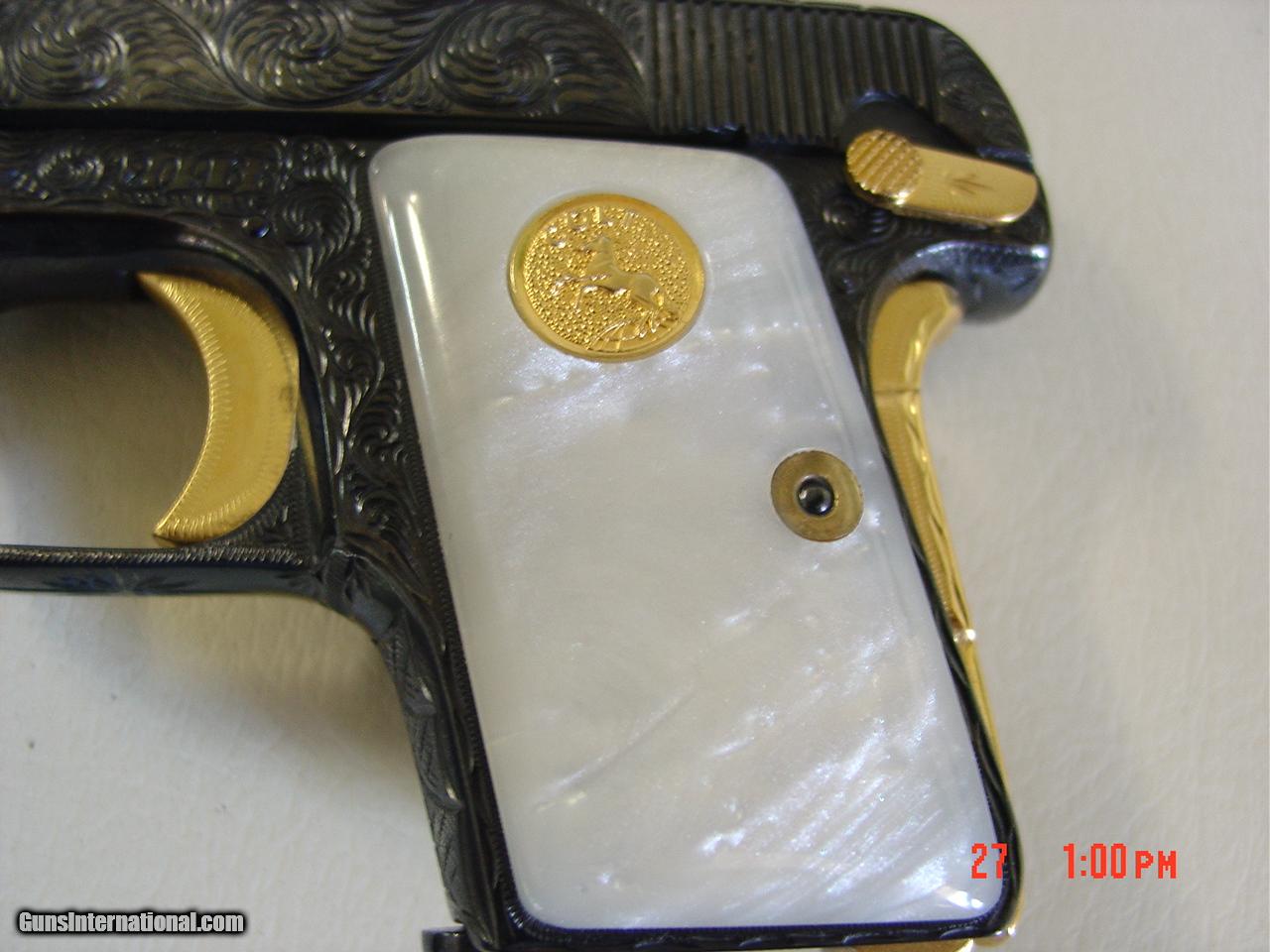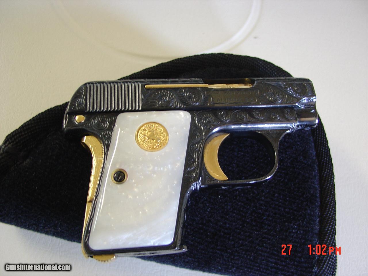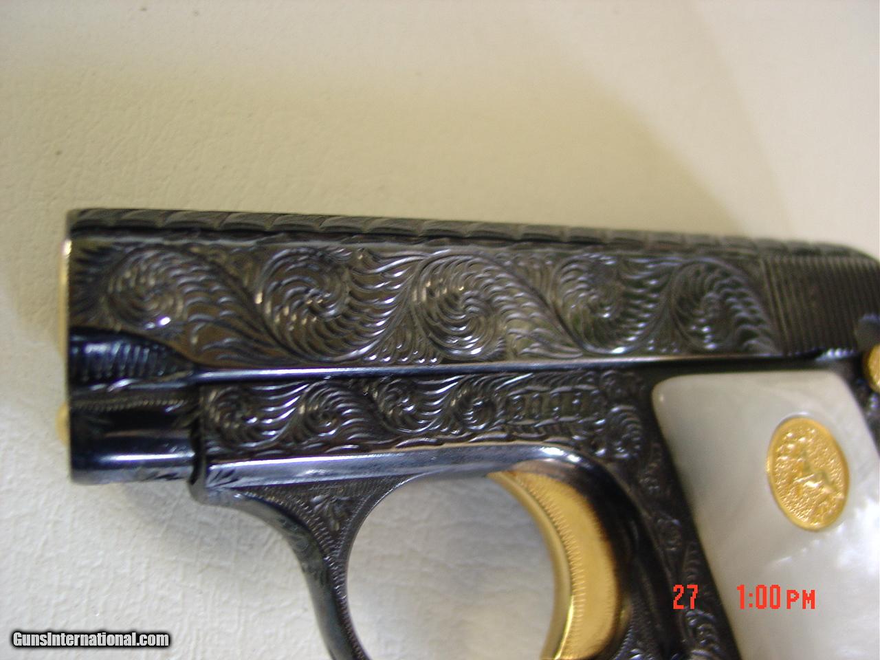 Colt 1908,25 cal,Vest Pocket,fully engraved by Flannery,refinished blue & gold,Pearlite grips,made 1908,a work of art !!