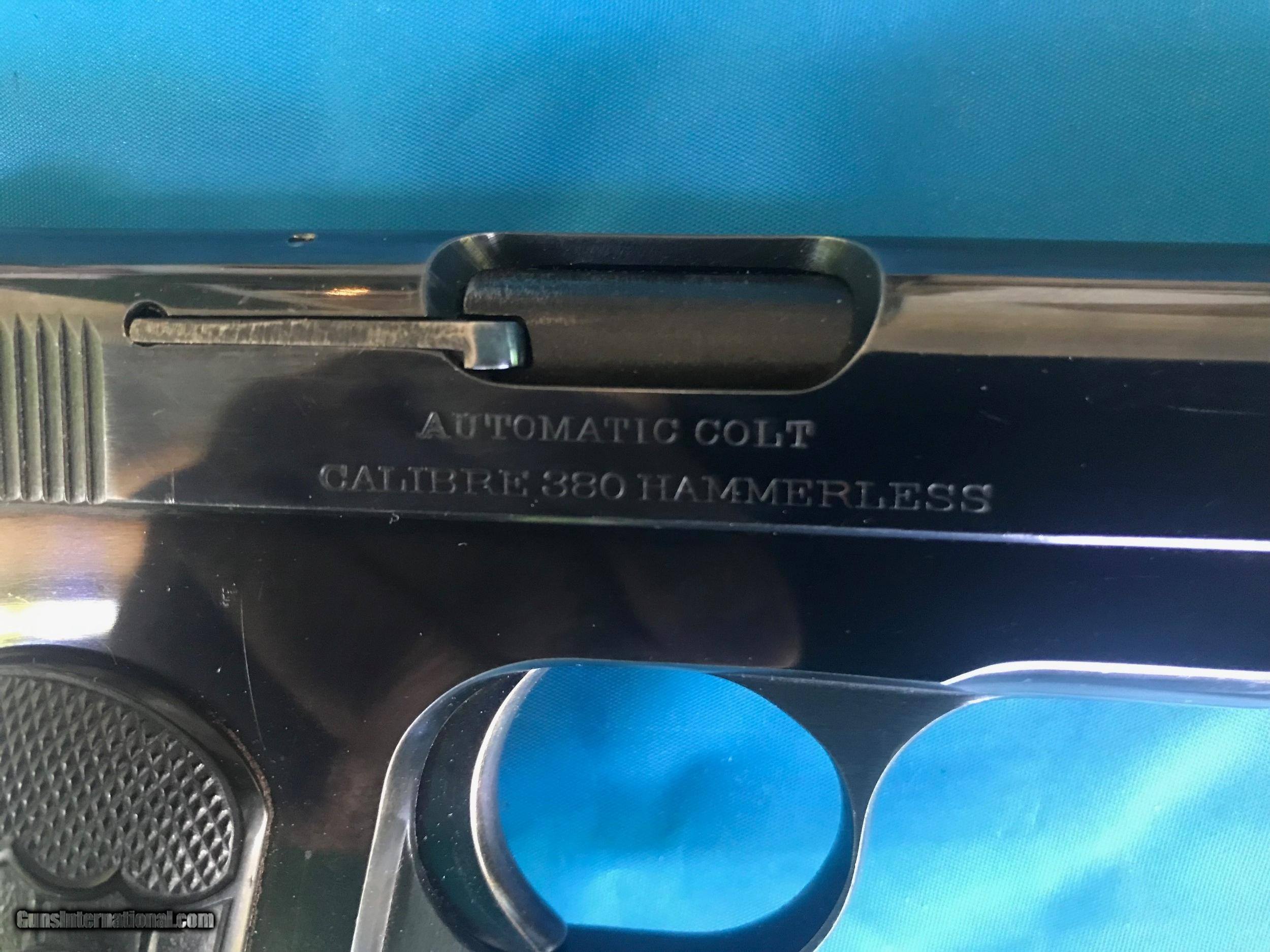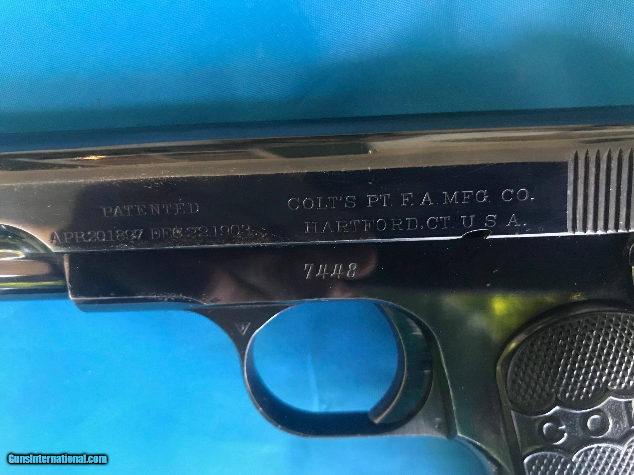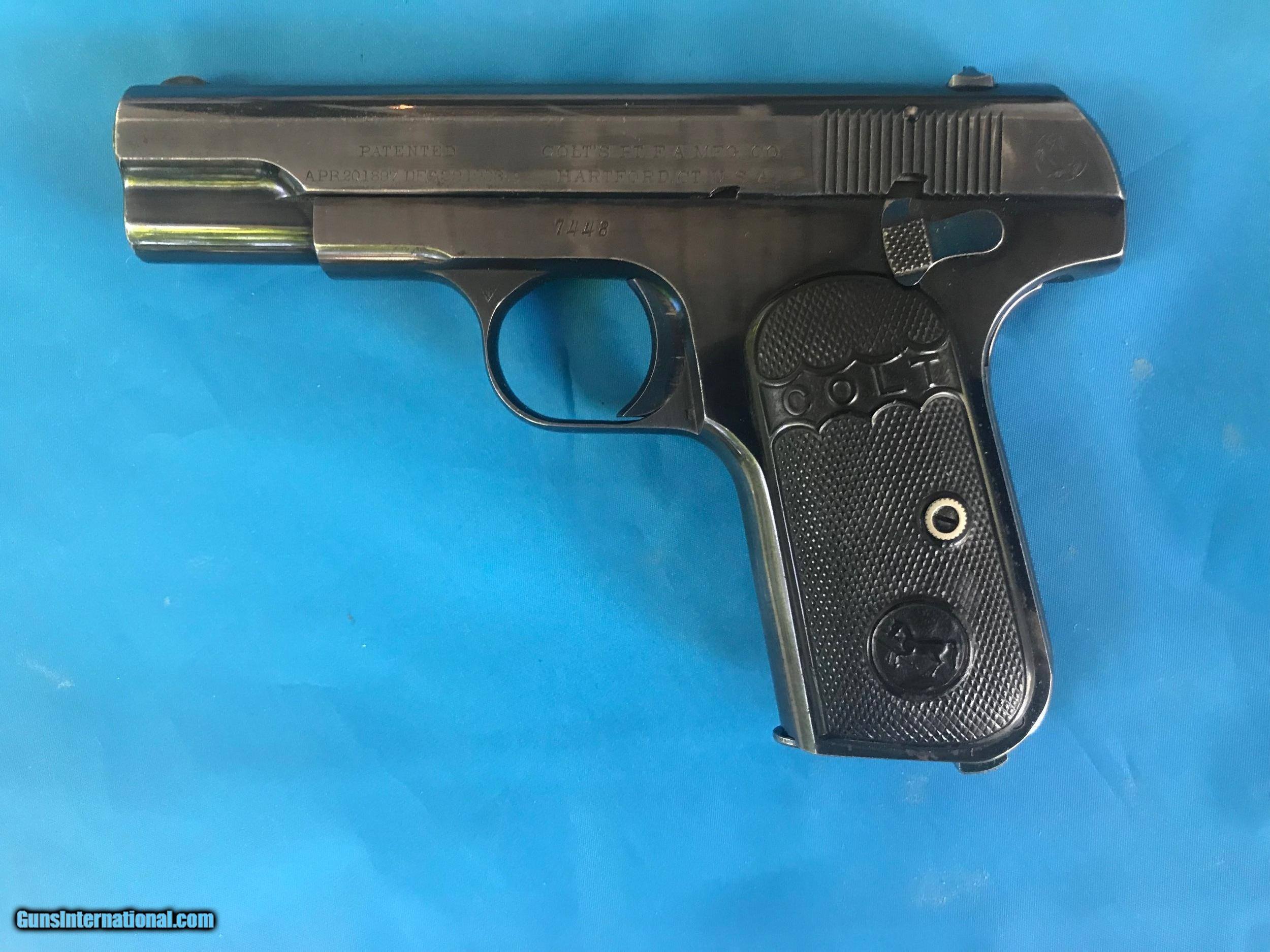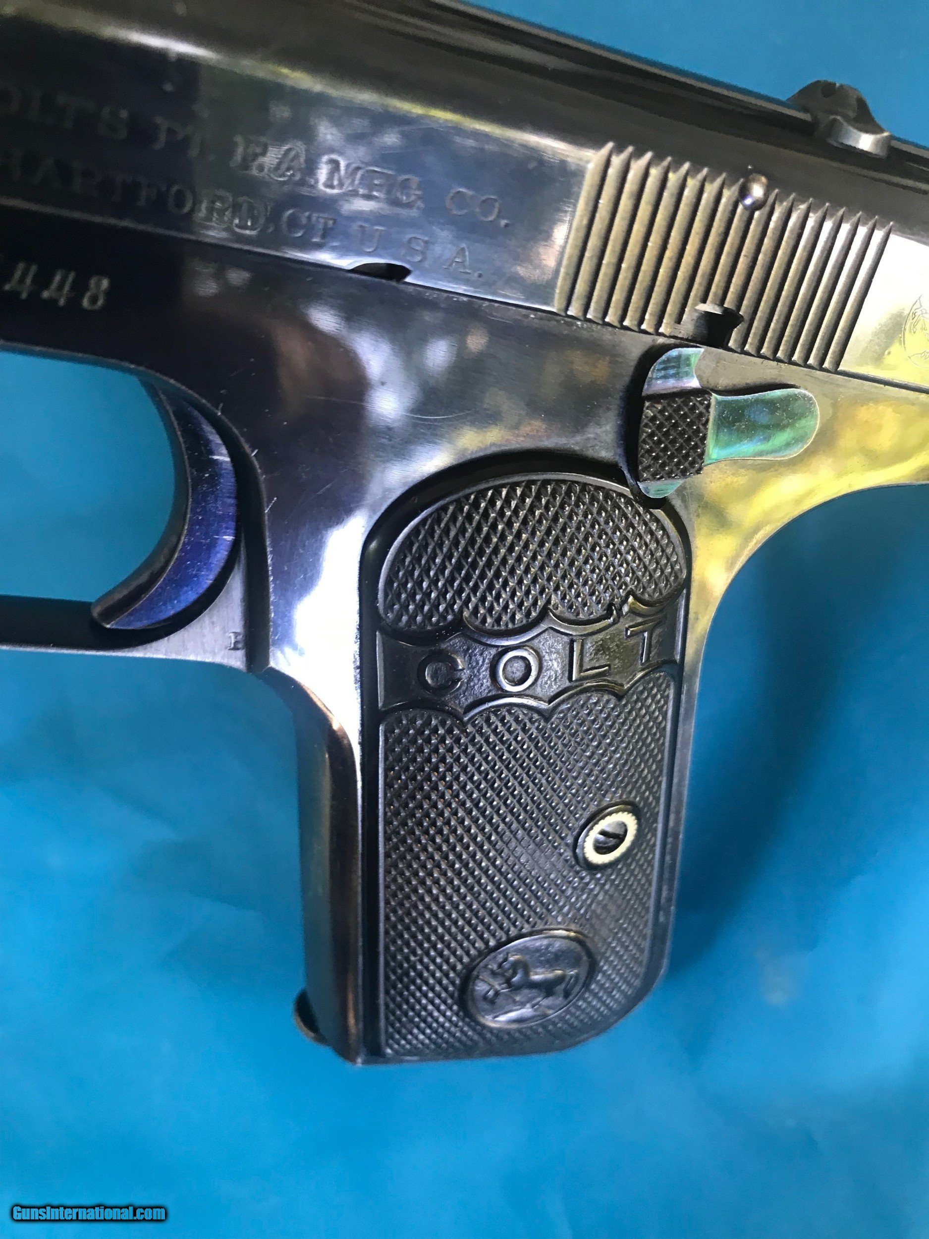 Description: Serial #7448, 380 ACP, 3 3/4" barrel with a near excellent bore showing traces of frosting. This 1911 made pistol retains about 90% original blue. The grip frame and rear of the frame wearing to a mix of pewter and brown in addition to high edge wear and a few scratches. The fire blue on the safety and trigger remains strong with light wear from handling. The checkered hard rubber grips have "COLT" in a scalloped edge banner and a Rampant Colt in a circle. They rate very good plus, with scattered diamond point compression marks. The pistol includes a single factory magazine marked "CALIBRE 380" on the flat base. A rare early manufactured 1908 in fine condition...Priority mail shipping included... SOLD Curio/Relic: Yes |