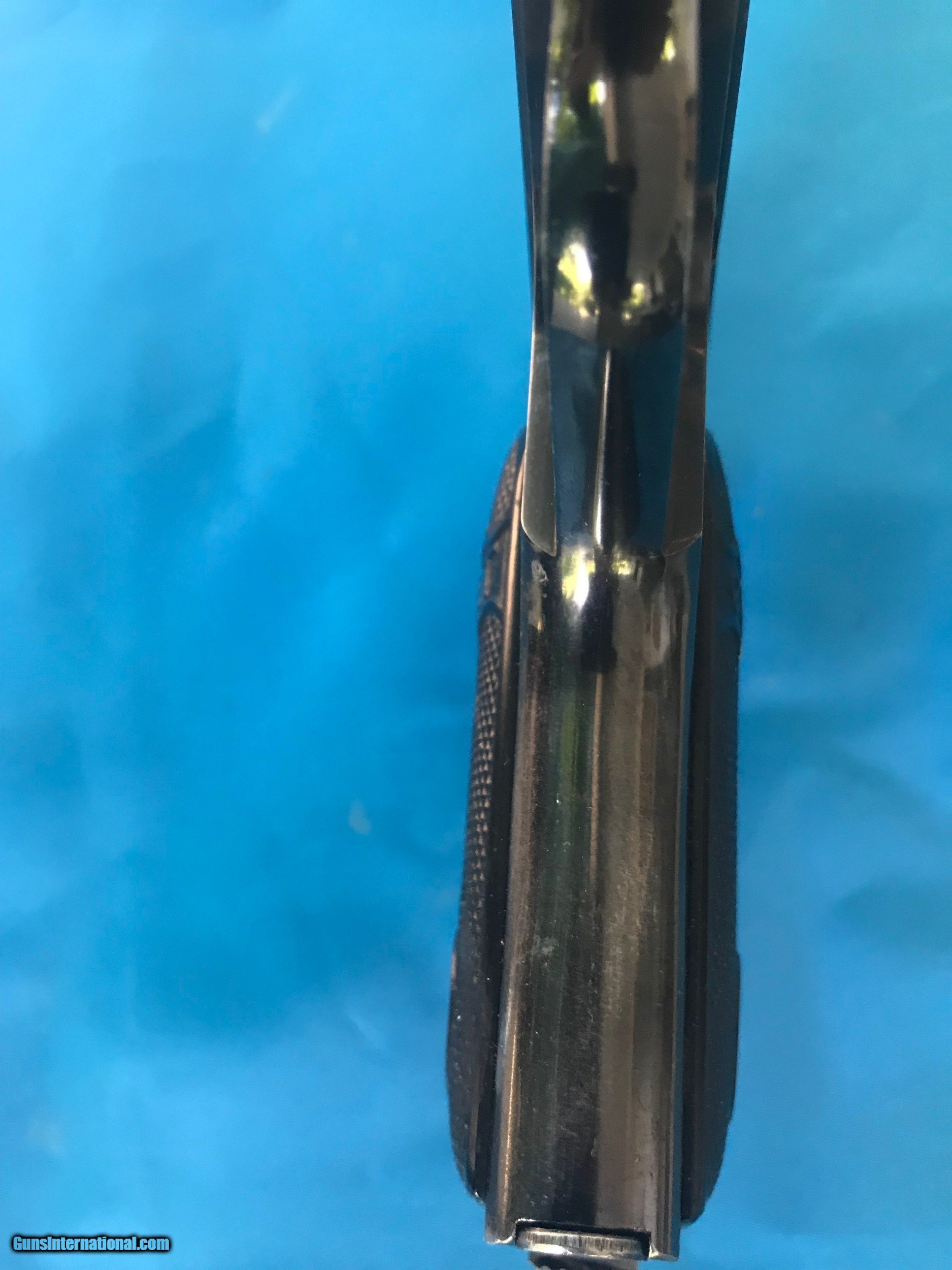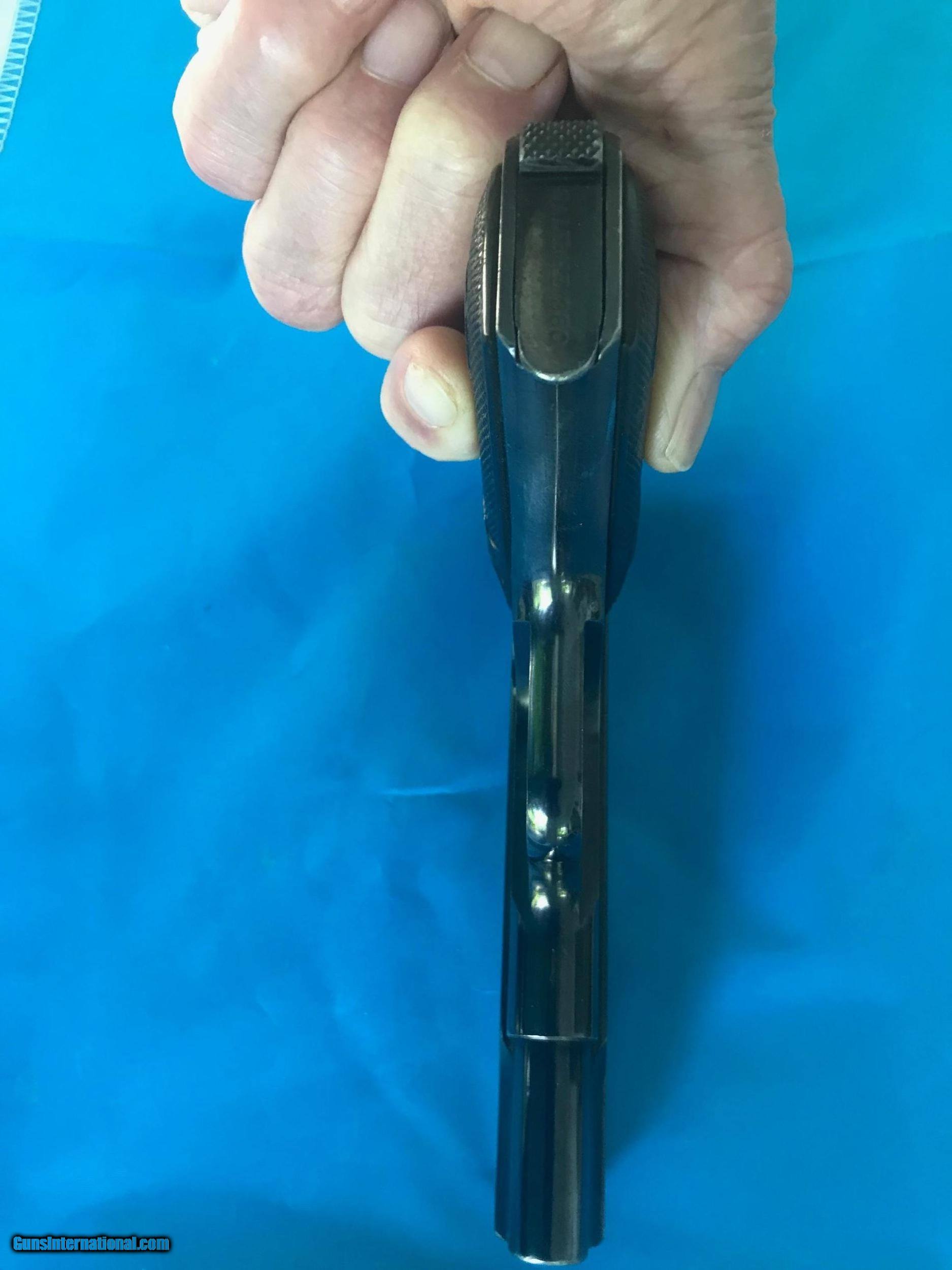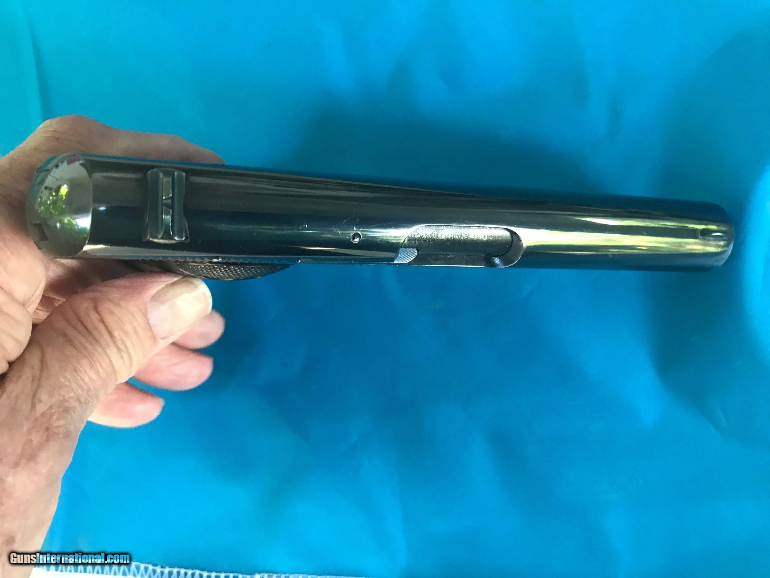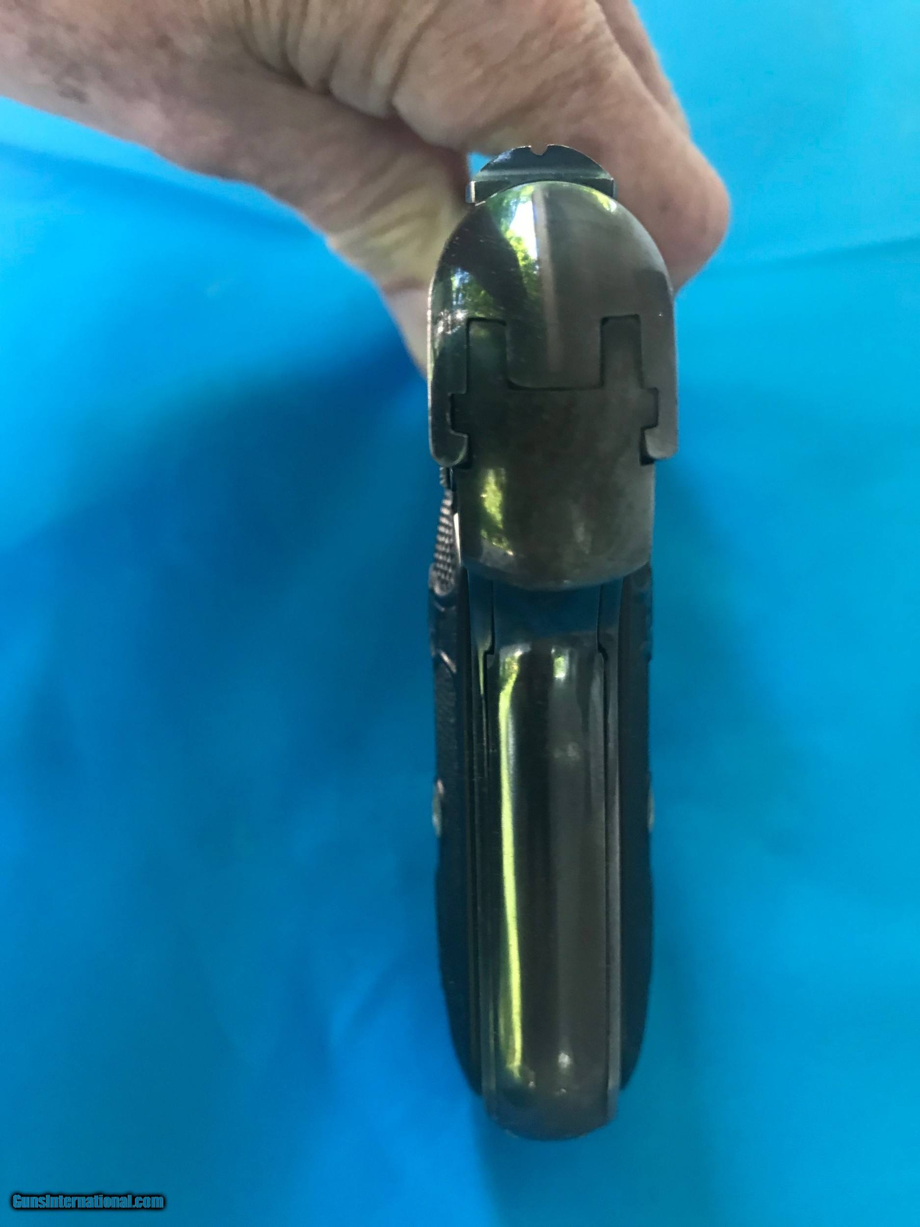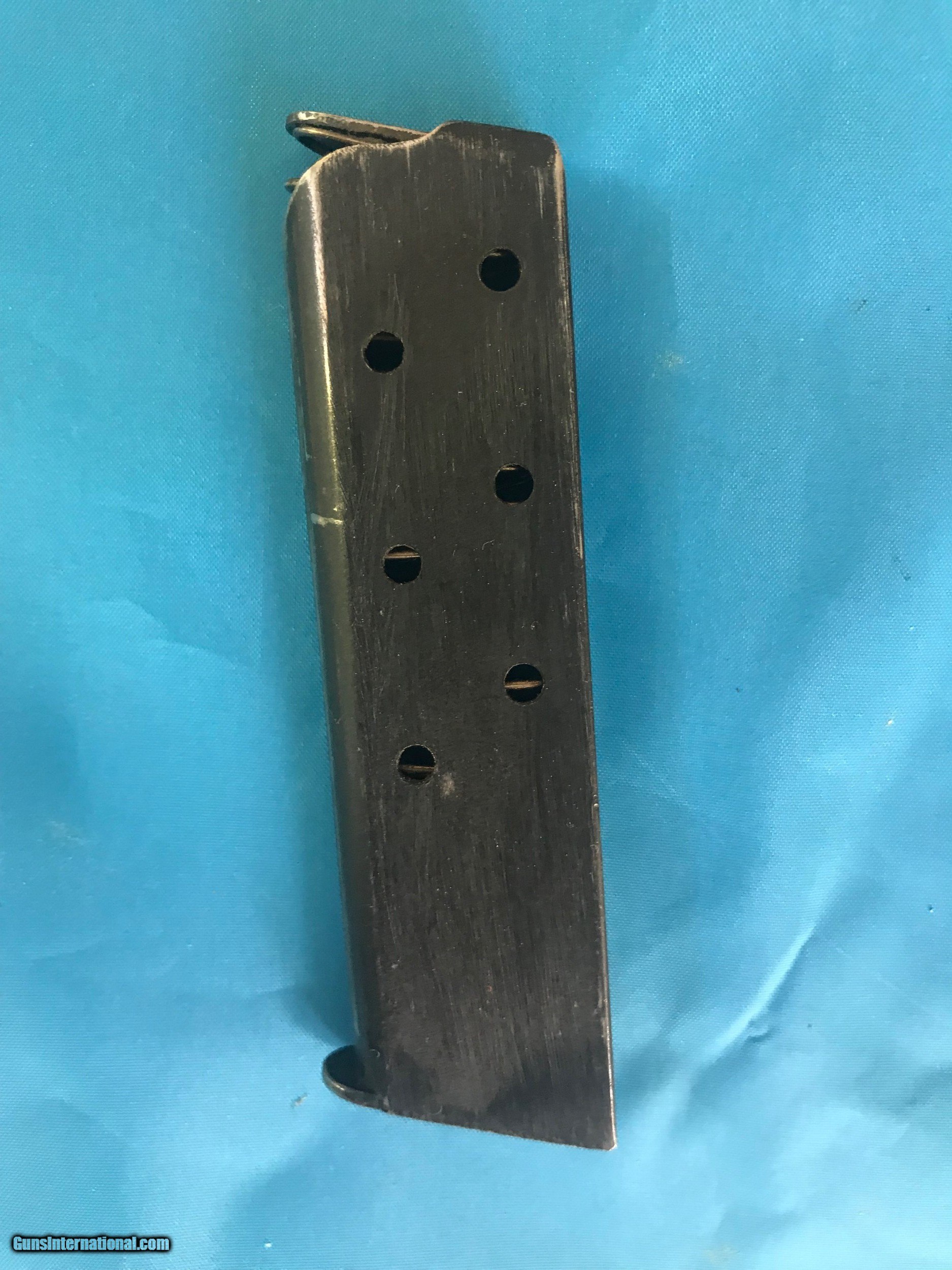 Description: Serial #7448, 380 ACP, 3 3/4" barrel with a near excellent bore showing traces of frosting. This 1911 made pistol retains about 90% original blue. The grip frame and rear of the frame wearing to a mix of pewter and brown in addition to high edge wear and a few scratches. The fire blue on the safety and trigger remains strong with light wear from handling. The checkered hard rubber grips have "COLT" in a scalloped edge banner and a Rampant Colt in a circle. They rate very good plus, with scattered diamond point compression marks. The pistol includes a single factory magazine marked "CALIBRE 380" on the flat base. A rare early manufactured 1908 in fine condition...Priority mail shipping included... SOLD Curio/Relic: Yes |