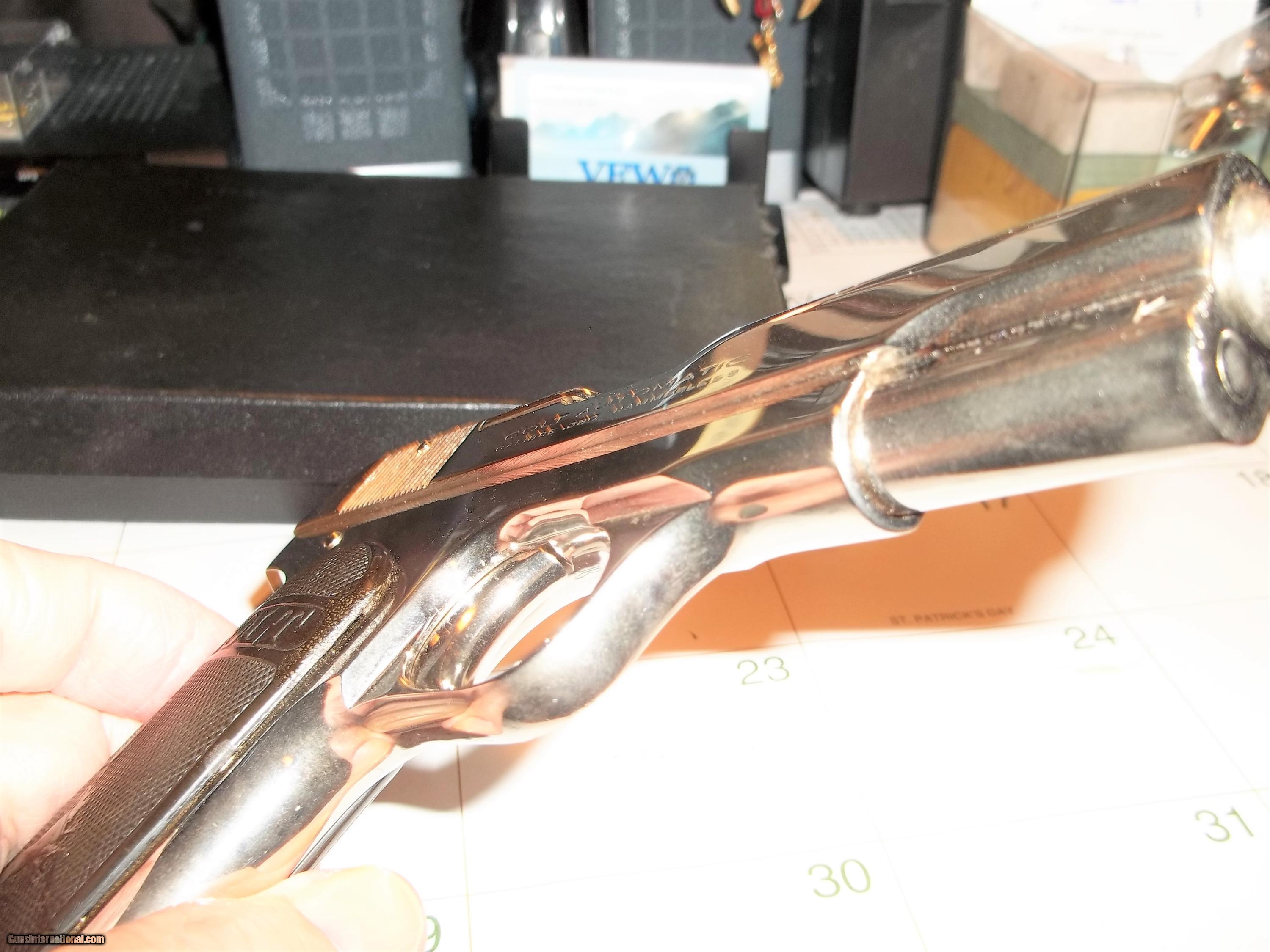 Description: Colt 1908 ACP...Type III...Excellent 98% ctory Nickel Finish...No Barrel Bushing...Mfg. late 1924..."Round Top" early Magazine...Colt Factory Letter...Manual...Colt .380 Auto Wood Grain Cardboard Box w/Insert.....Personal Check or Money Order...Layaway available...PLEASE NOTE; Gun is shown with Hard Rubber Grrips( with two small nicks one on eatch grip), Colt Factory Letter states the gun was returned to Colt and reissued with Walnut Checked grips...You will receive a set Walnut Checked after market grips...Gun looks to have never been fired...Shipping and Insurance $ 35.00. SOLD |