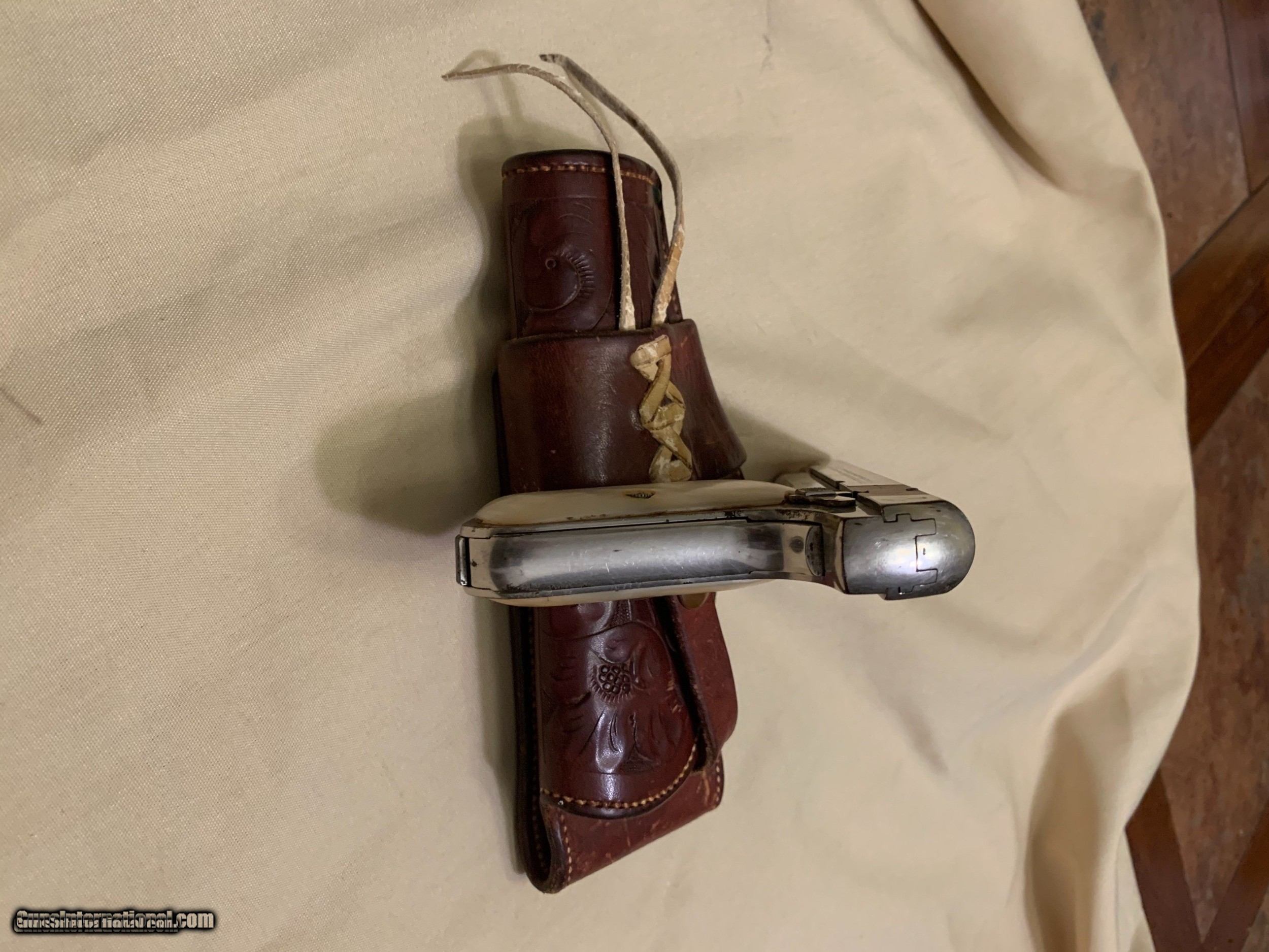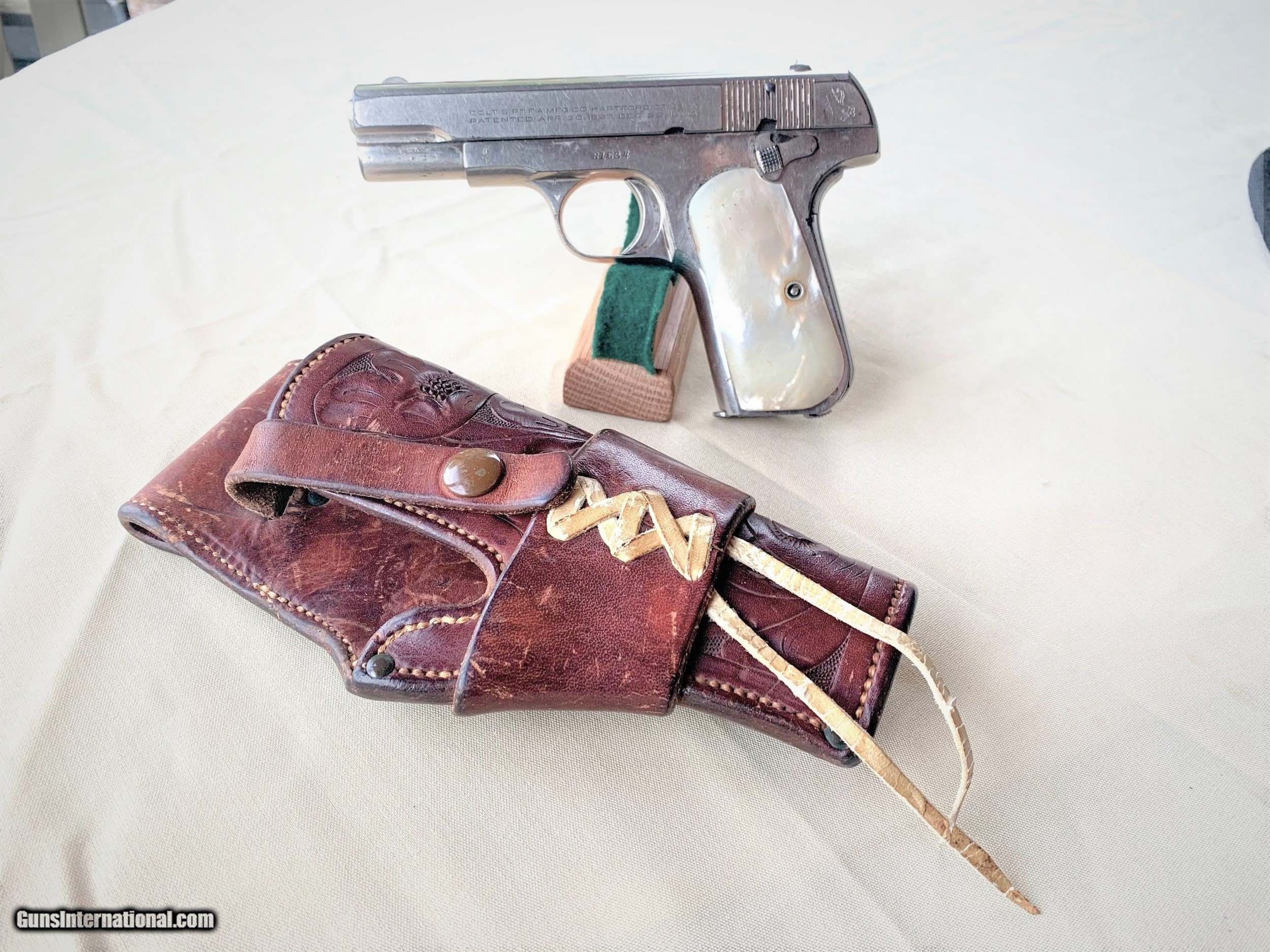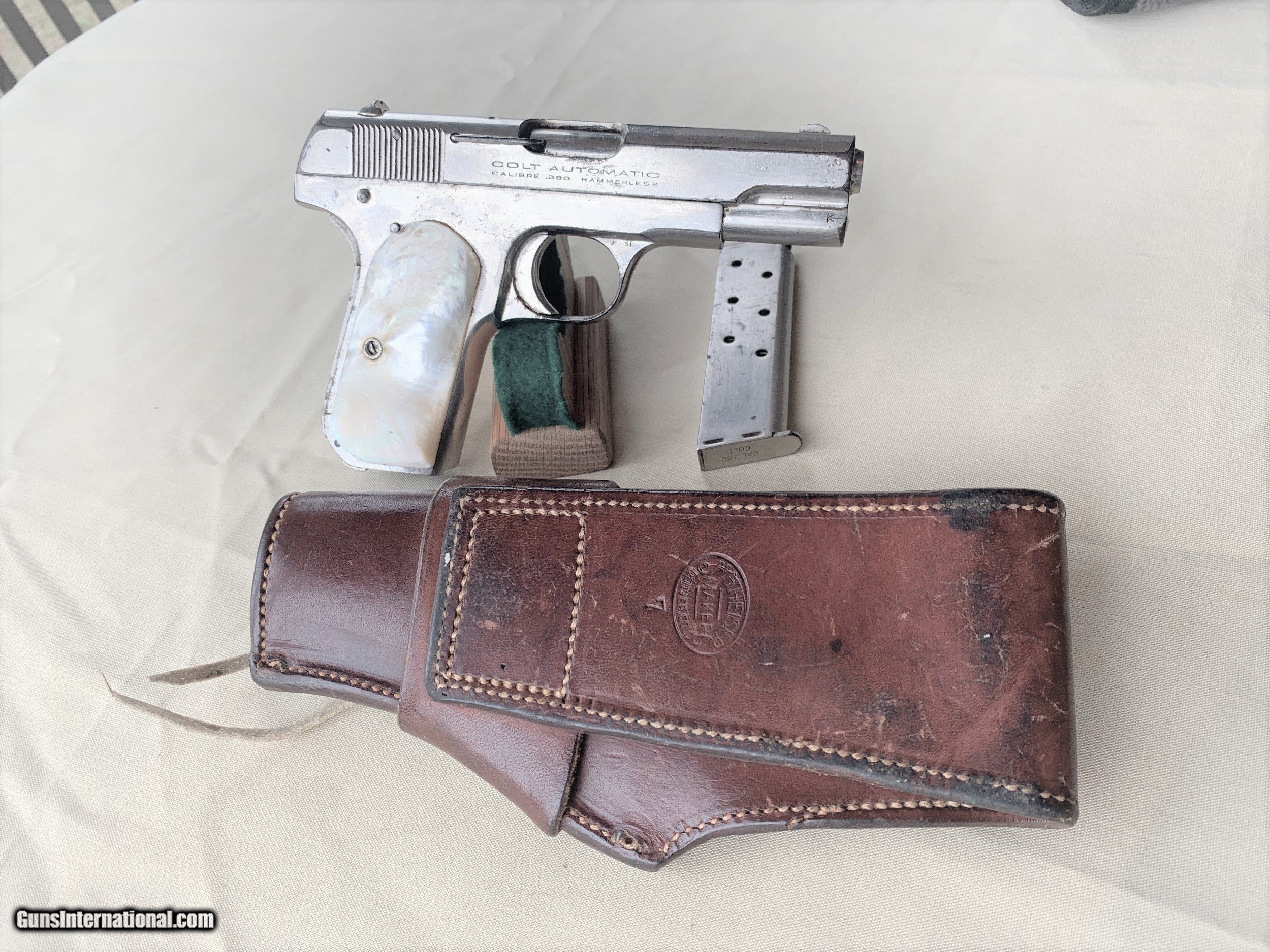 Description: HERES A GREAT COLT 1908 WITH A WESTERN HOLSTER . GUN HAS THE LOOK ! THE HOLSTER IS KILLER. SERIAL NUMBER 81,834 . GUN HAS MOST ALL OF ITS ORIGINAL FACTORY NICKEL STILL REMAINING. WITH HOLSTER WHERE AND HANDLING MARKS. MARKINGS ARE SHARP AND VERY LEGIBLE. FACTORY ORIGINAL SIGHTS . FACTORY MOTHER OF PEARL GRIPS ARE IN EXCELLENT ORIGINAL CONDITION. FACTORY ORIGINAL MAGAZINE . BORE AND MECHANICS ARE EXCELLET. GUN LOCKS UP TIGHT AND IS IN EXCELLENT WORKING ORDER. BORE IS EXCELLENT. OVERALL A VERY NICE COLT 380 AUTO WITH SOME WESTERN FLAVOR ! PLEASE REVIEW MY PHOTS AND PLEASE EMAIL ME WITH ANY QUESTIONS ? 3 DAY INSPECTION AS ALLWAYS. THANKYOU FOR LOOKING , LITTLE JO SOLD Antique: Yes Handgun Caliber: .380 ACP (9x17mm Browning Short) Manufacturer: COLT Model: 1908 Serial Number: 81634 Condition: EXCELLENT |