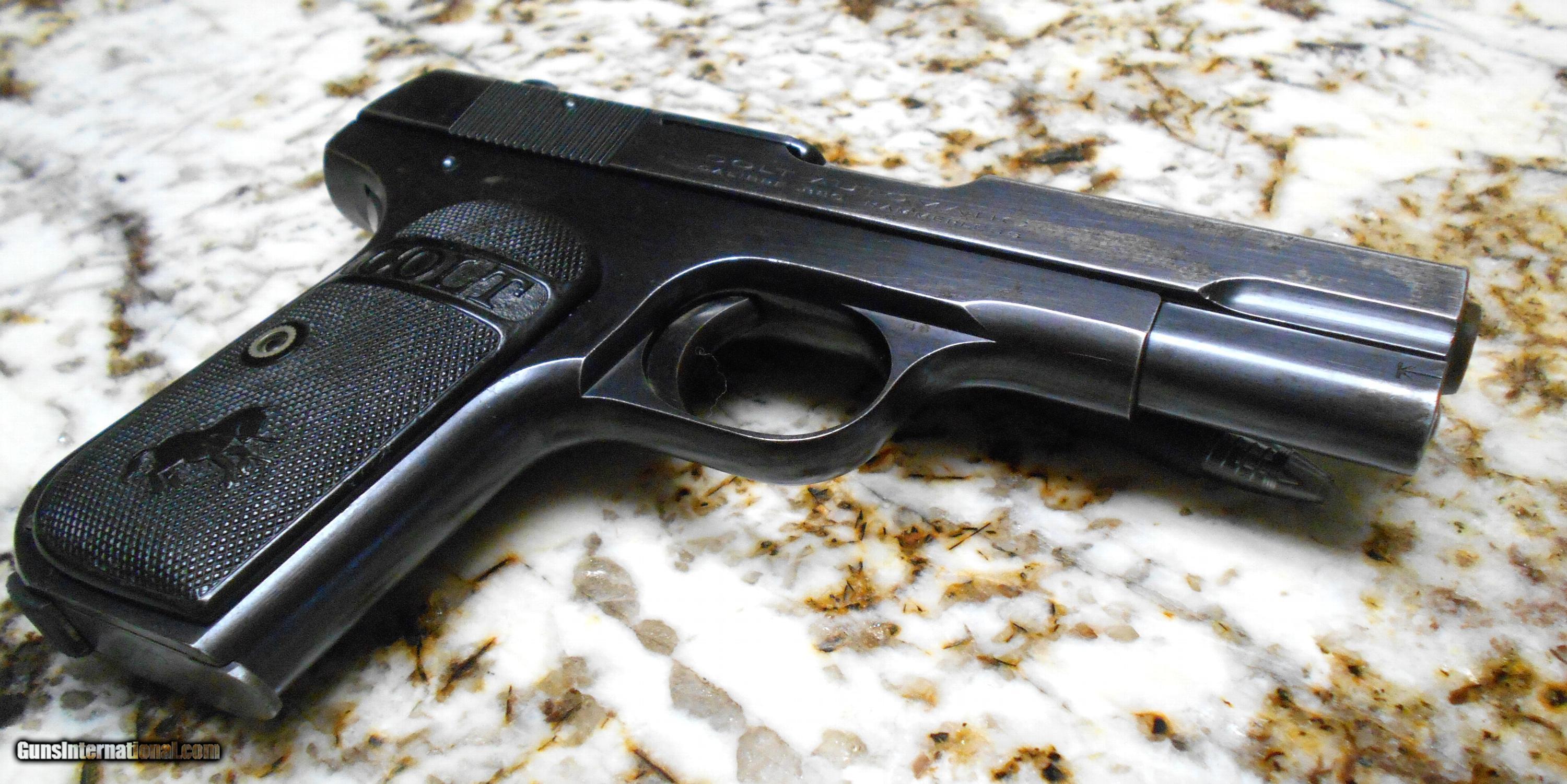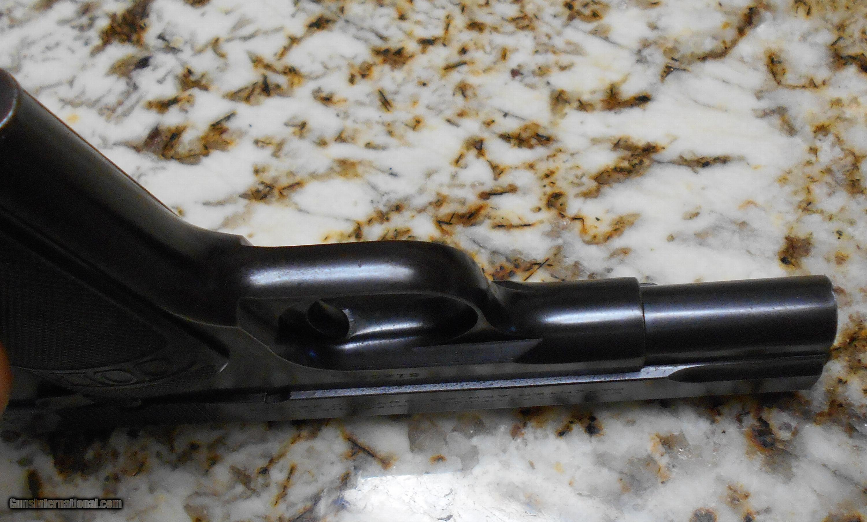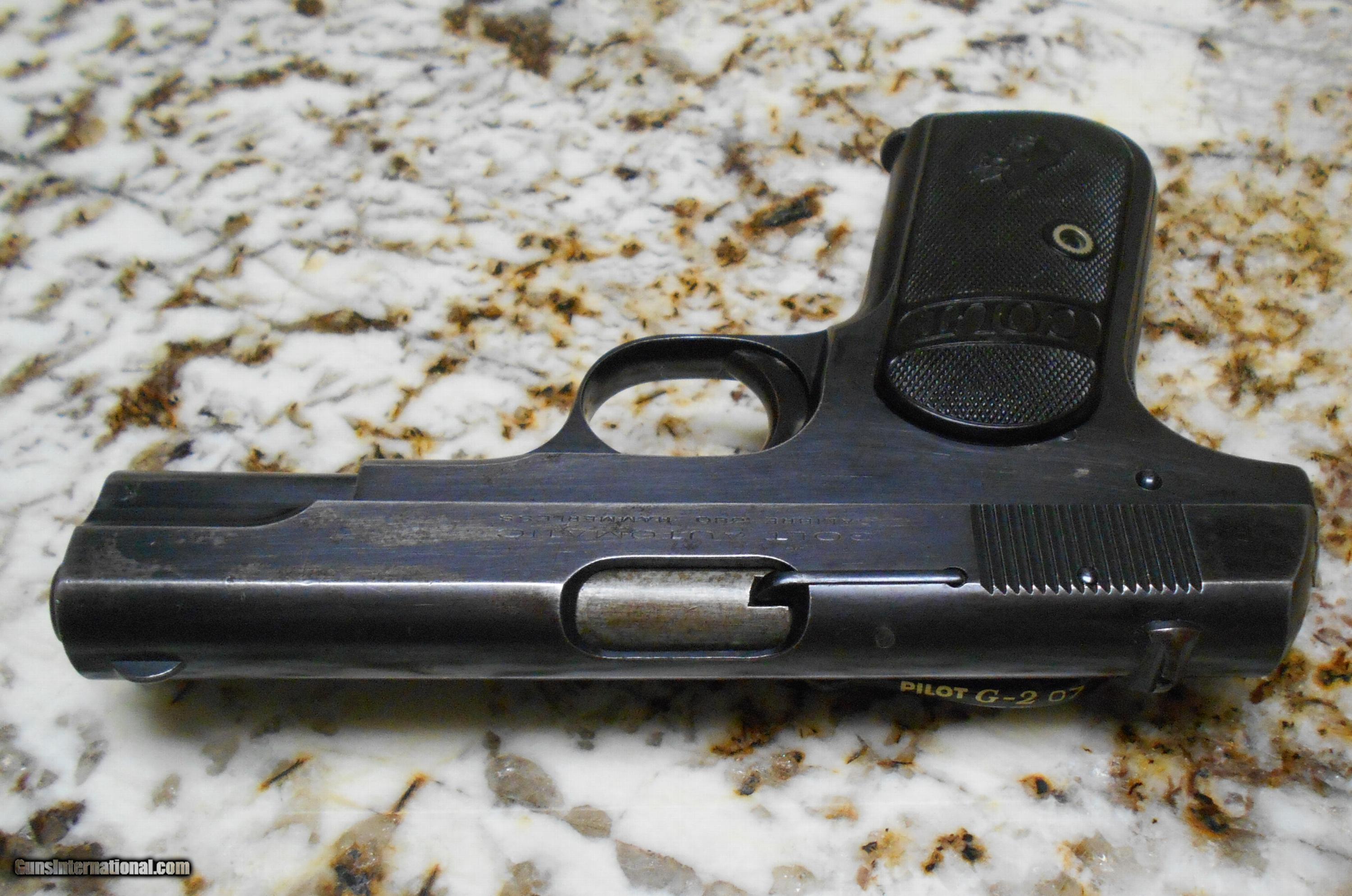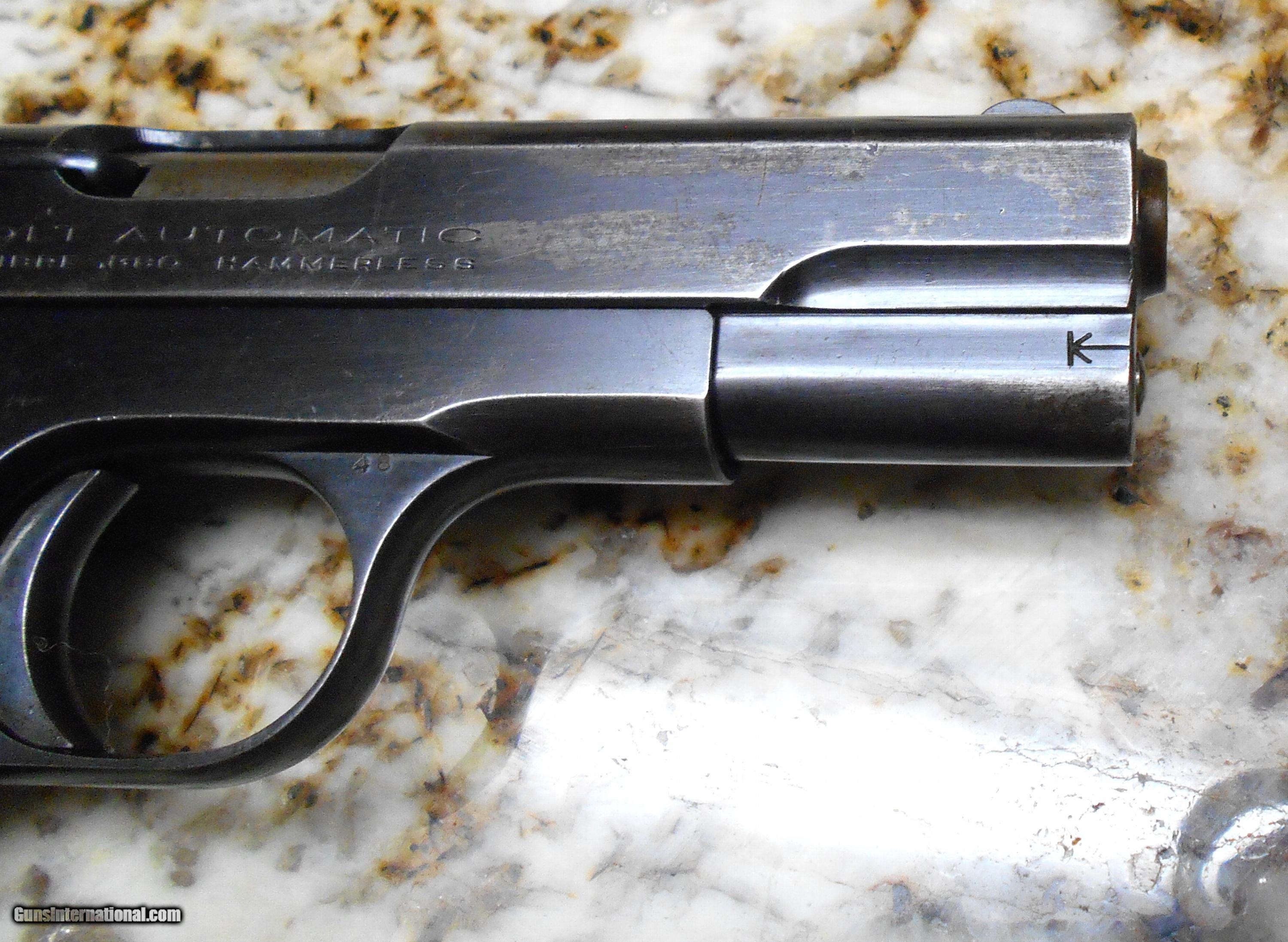 Description: Bore in the 3 3/4" barrel is bright and shiny. It will rate an eight on a one to ten scale. Action works perfectly and is tight. All markings are clear, correct, and original. Grips are excellent and fit perfectly. Magazine is a correct two-tone with a round top and crimped base. The pistol does show some wear. Pictures are accurate as to amount of wear. Year of manufacture is 1923. American Arms & Antiques item #1825 SOLD Curio/Relic: Yes |