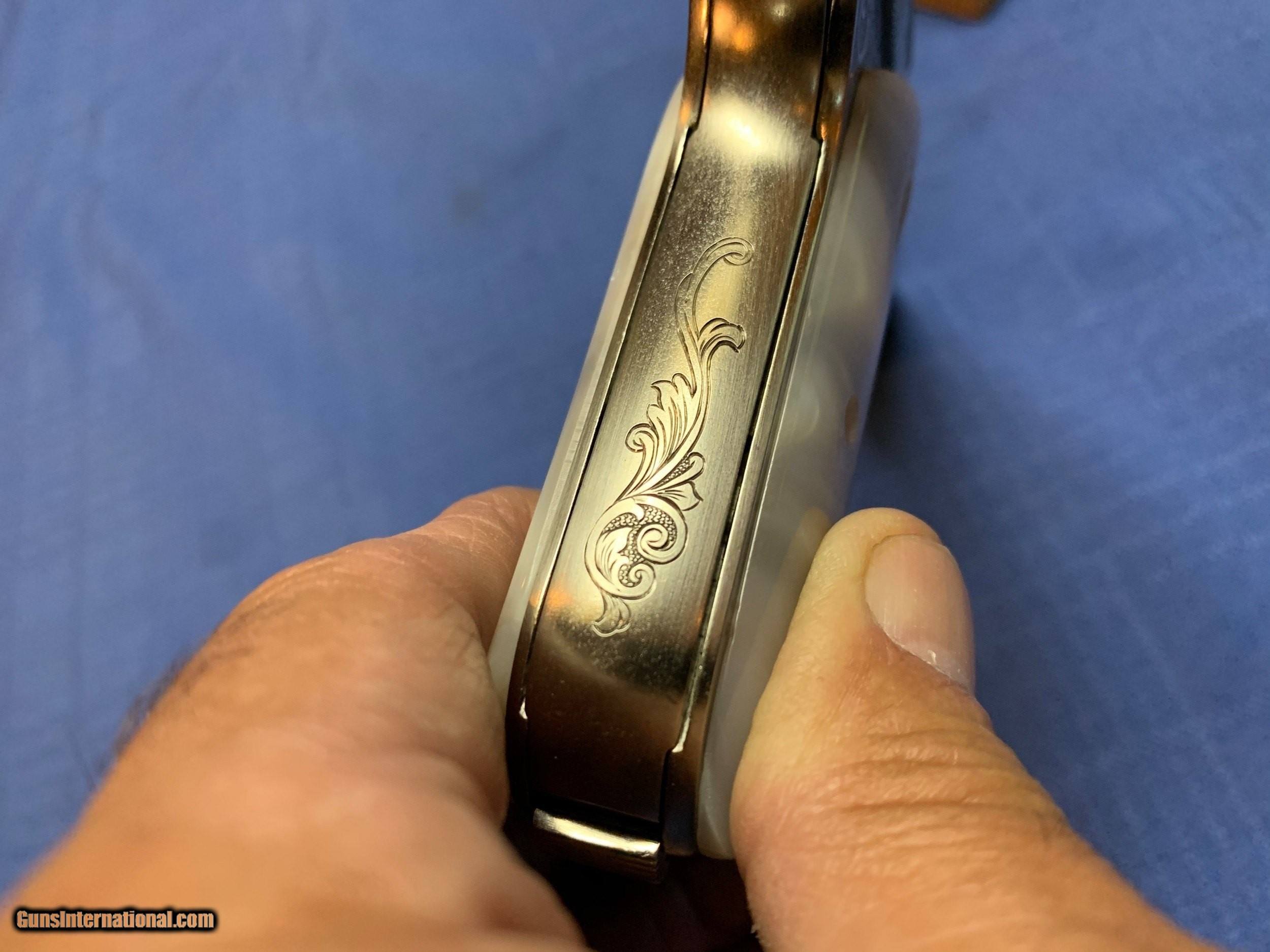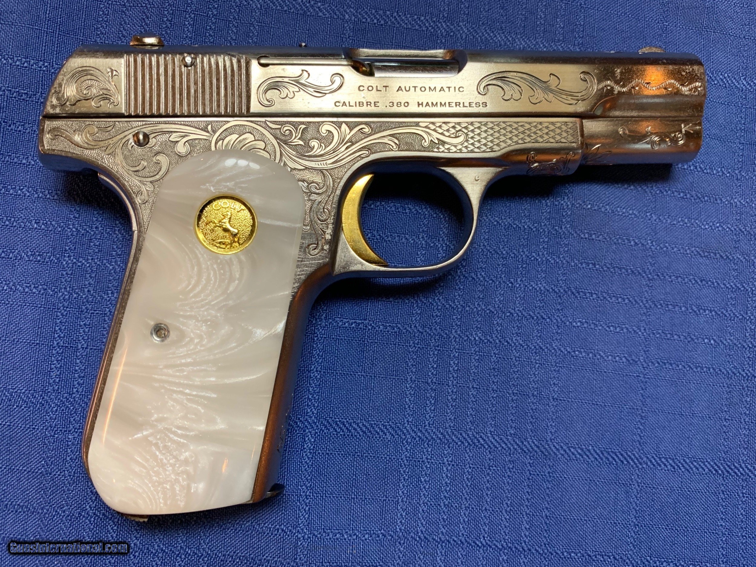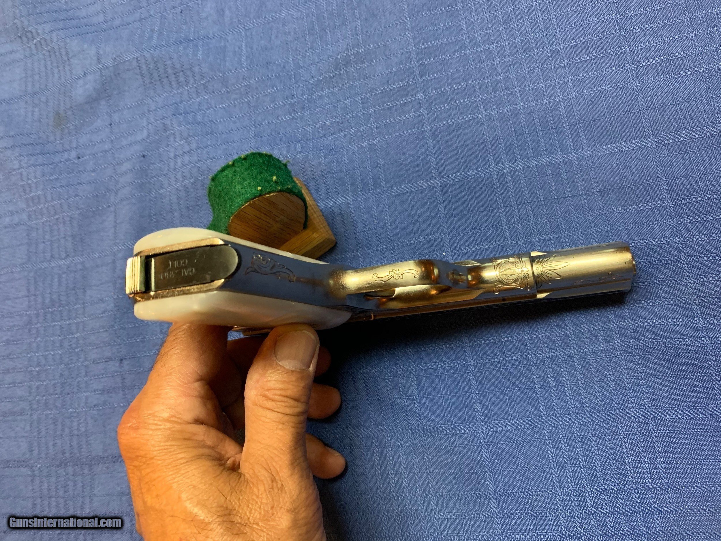 Description: HERES A COLT MODEL 1908 IN 380 CALIBER . BEUTIFULLY ENGRAVED BY AMERICAN ENGRAVER AUGISTINO LOPRINZI . COMES WITH A COLT PRESENTATION BOX . LIKE NEW CONDITION . BORE AND MECHANICS ARE EXCELLENT PLUS CONDITION. NICE EARLY GUN WITH SERIAL NUMBER 37042. COULD BE A SLEEPER . IF FACTORY OR CUSTOM ENGRAVED IT DONT MATTER ! GUN IS KILLER ! PLEASE REVIEW MY PHOTOS AND PLEASE EMAIL ME WITH ANY QUESTIONS ? 3 DAY INSPECTION AS ALLWAYS ! THANKYOU FOR LOOKING , LITTLE JO SOLD Antique: Yes Handgun Caliber: .380 ACP (9x17mm Browning Short) Manufacturer: COLT Model: 1908 Serial Number: 37,042 |