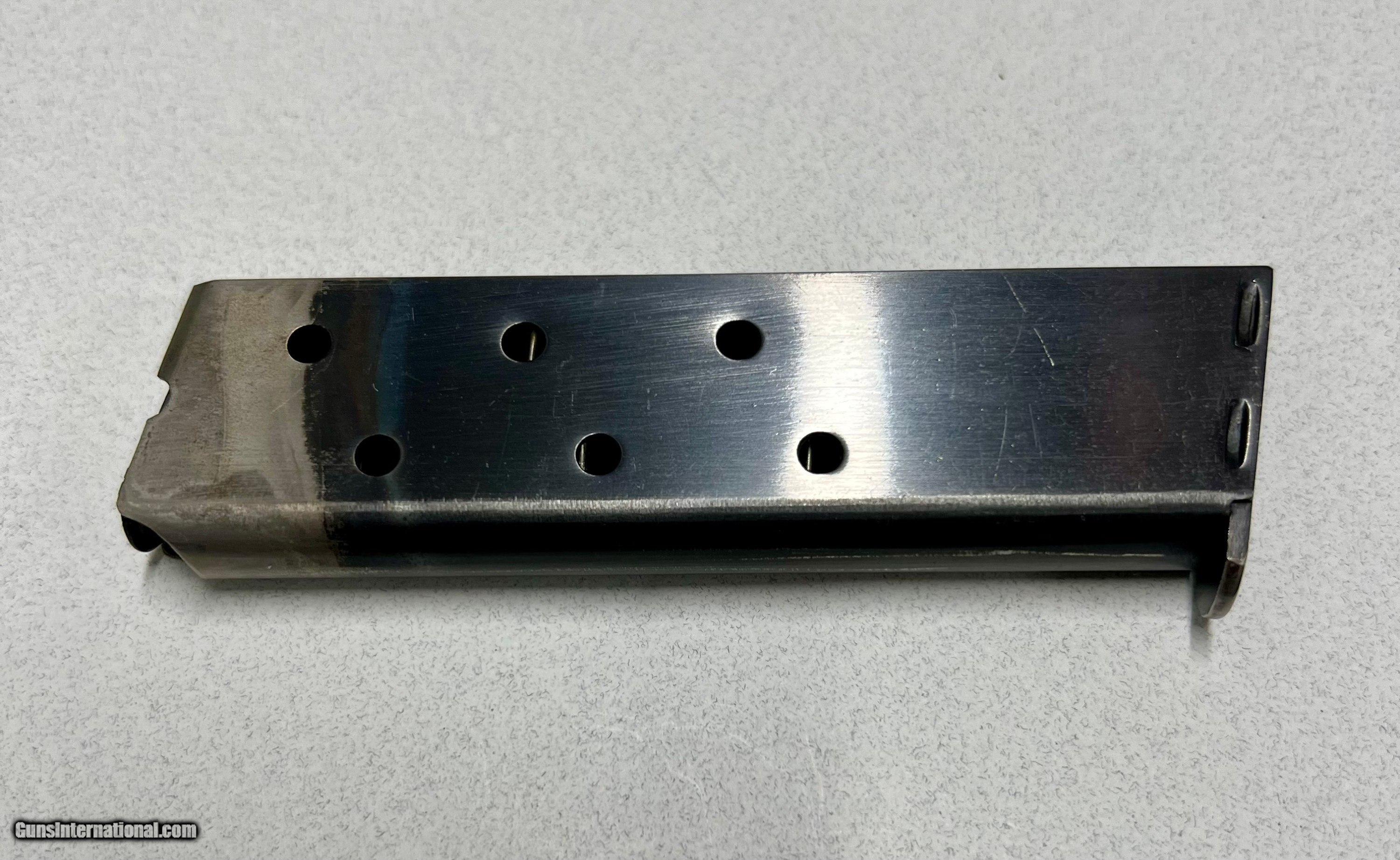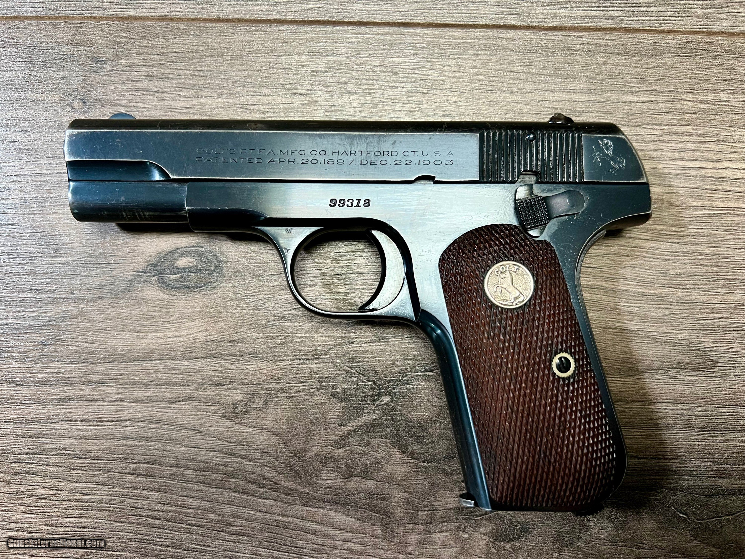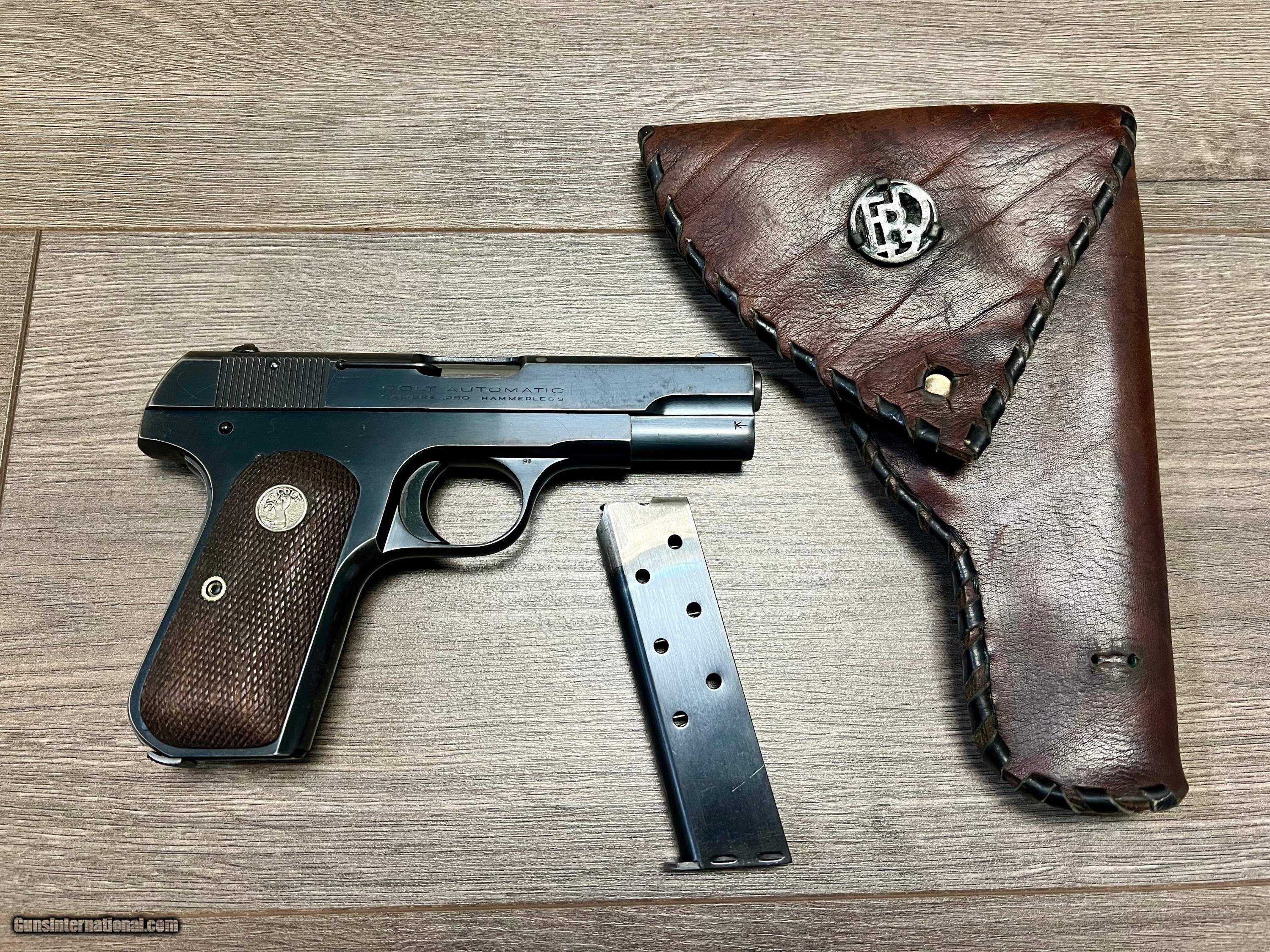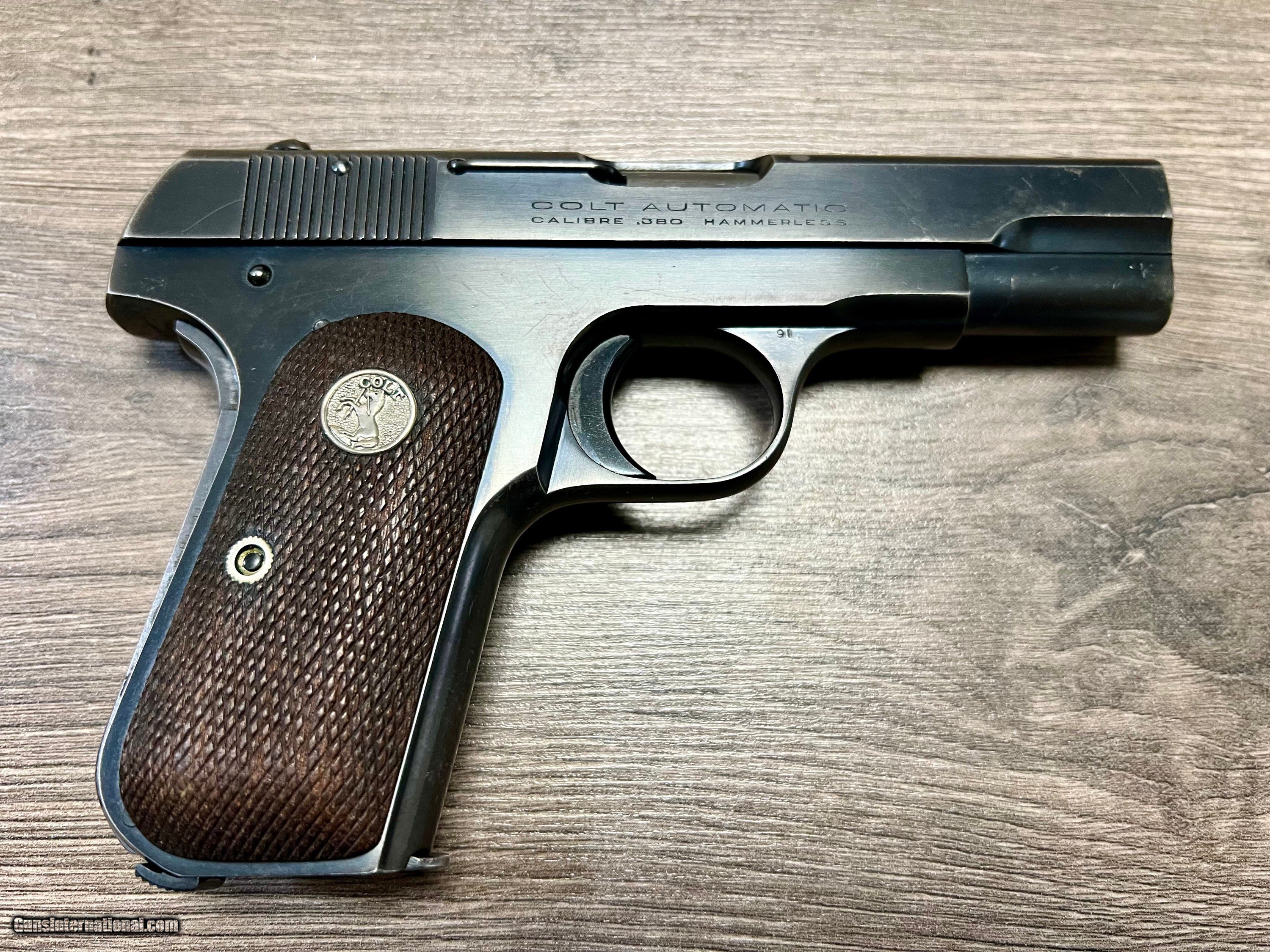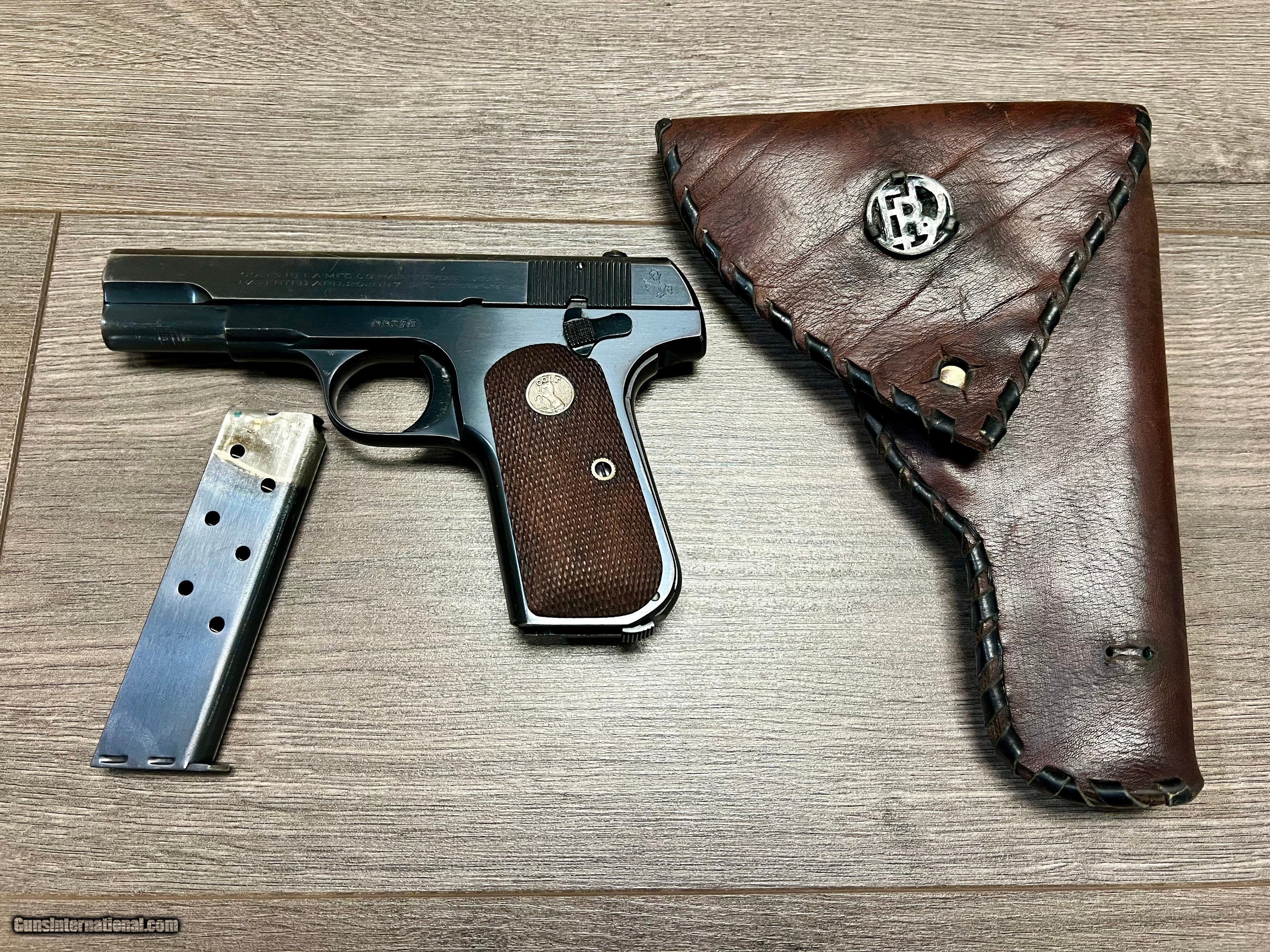 Description: Beautiful Colt 1908 Hammerless 380 ACP with original magazine. Manufactured in 1929. Includes nice custom leather holster from the original owner. Possibly issued to either a US Treasury or Postal Agent; as told to me. A bit of holster wear on top of slide as seen in the photos. Bore has strong rifling with light frosting. Prefer local pickup, or buyer pays actual shipping costs from my FFL to the continental US only. Buyer responsible for ensuring purchase complys with their local laws. $1100. SOLD Curio/Relic: Yes Handgun Caliber: .380 ACP (9x17mm Browning Short) Manufacturer: Colt Model: 1908 Pocket Hammerless Serial Number: 99318 Barrel Length: 3.5 inches Condition: Very good Metal Condition: Very good Wood Condition: Very good Bore Condition: Very good |