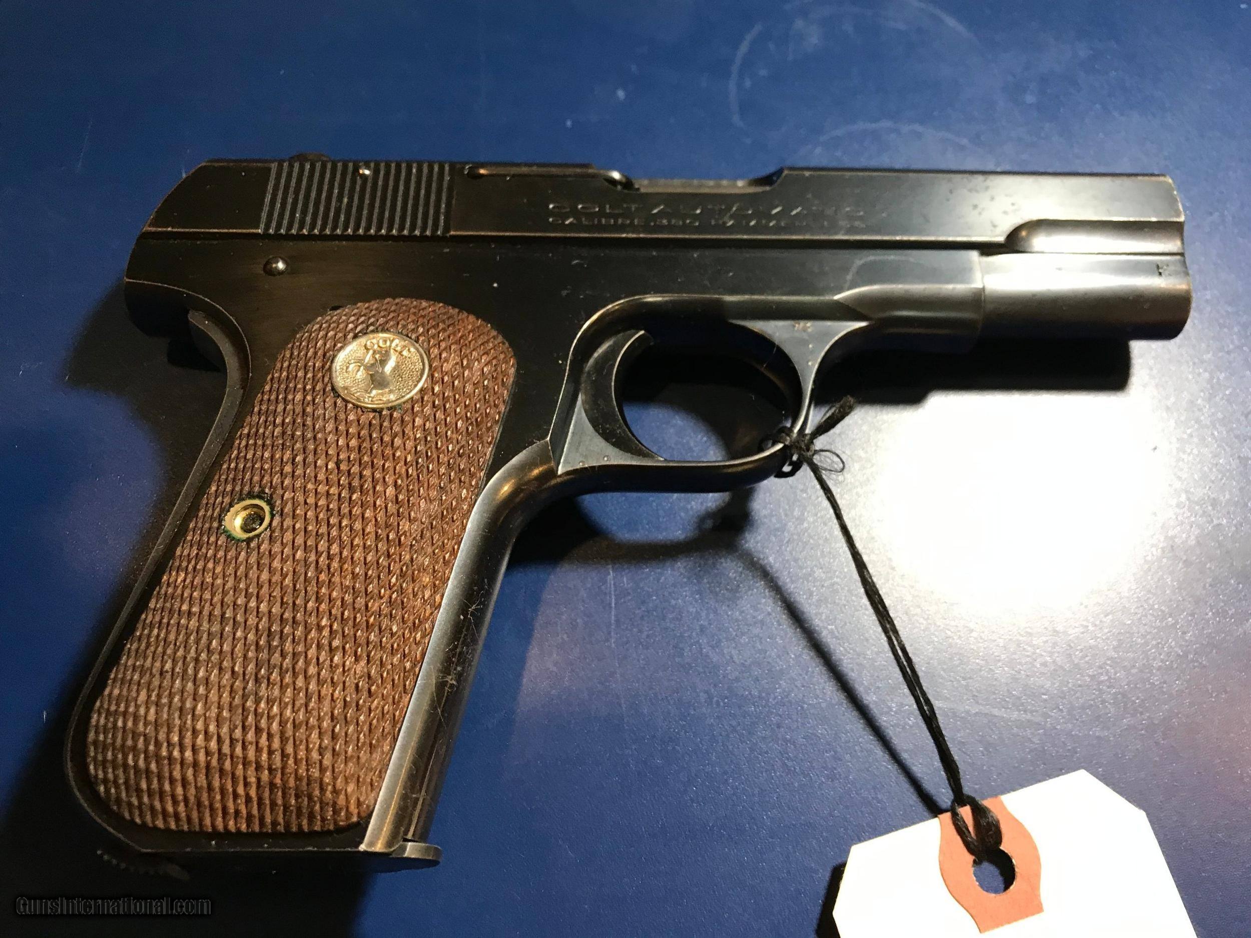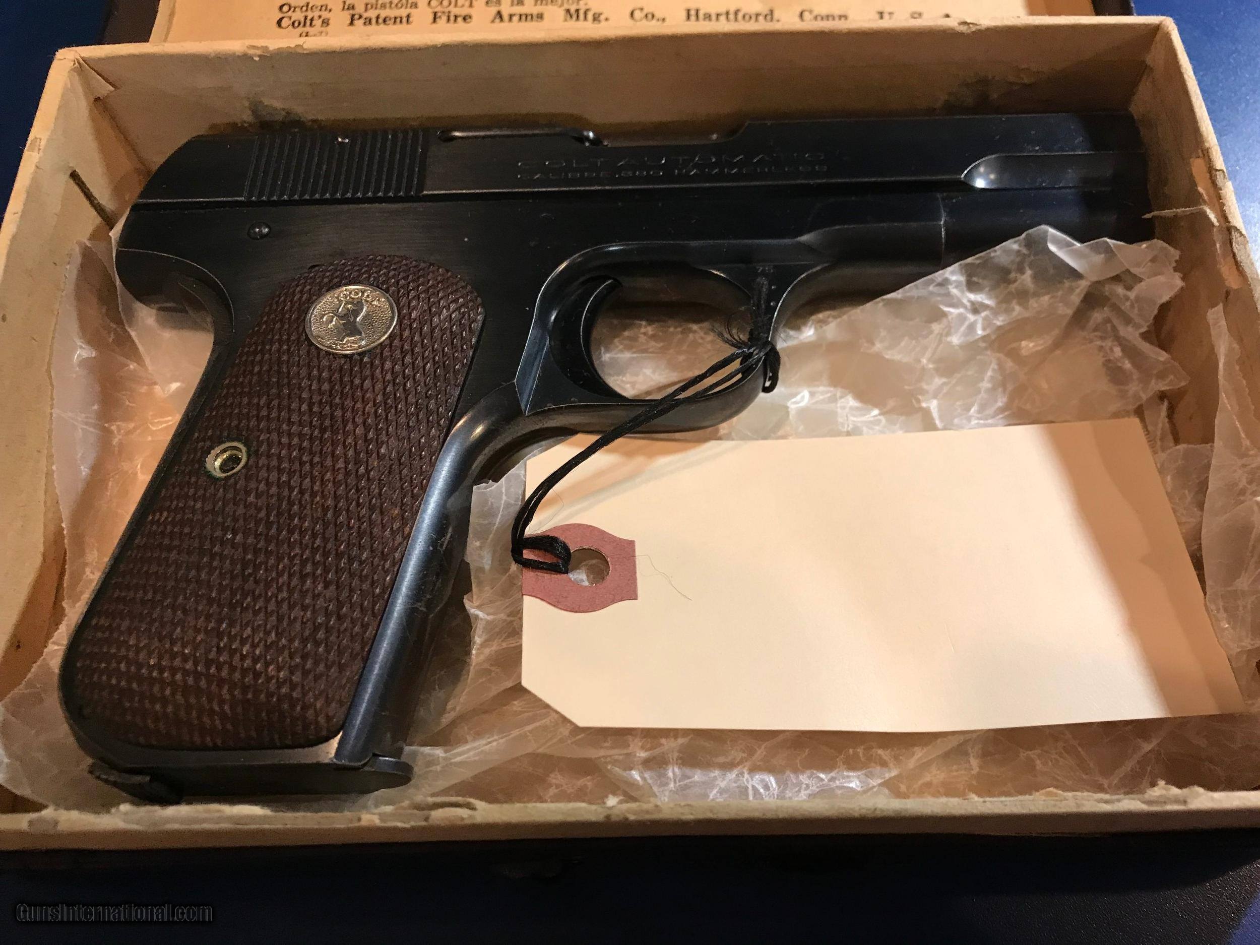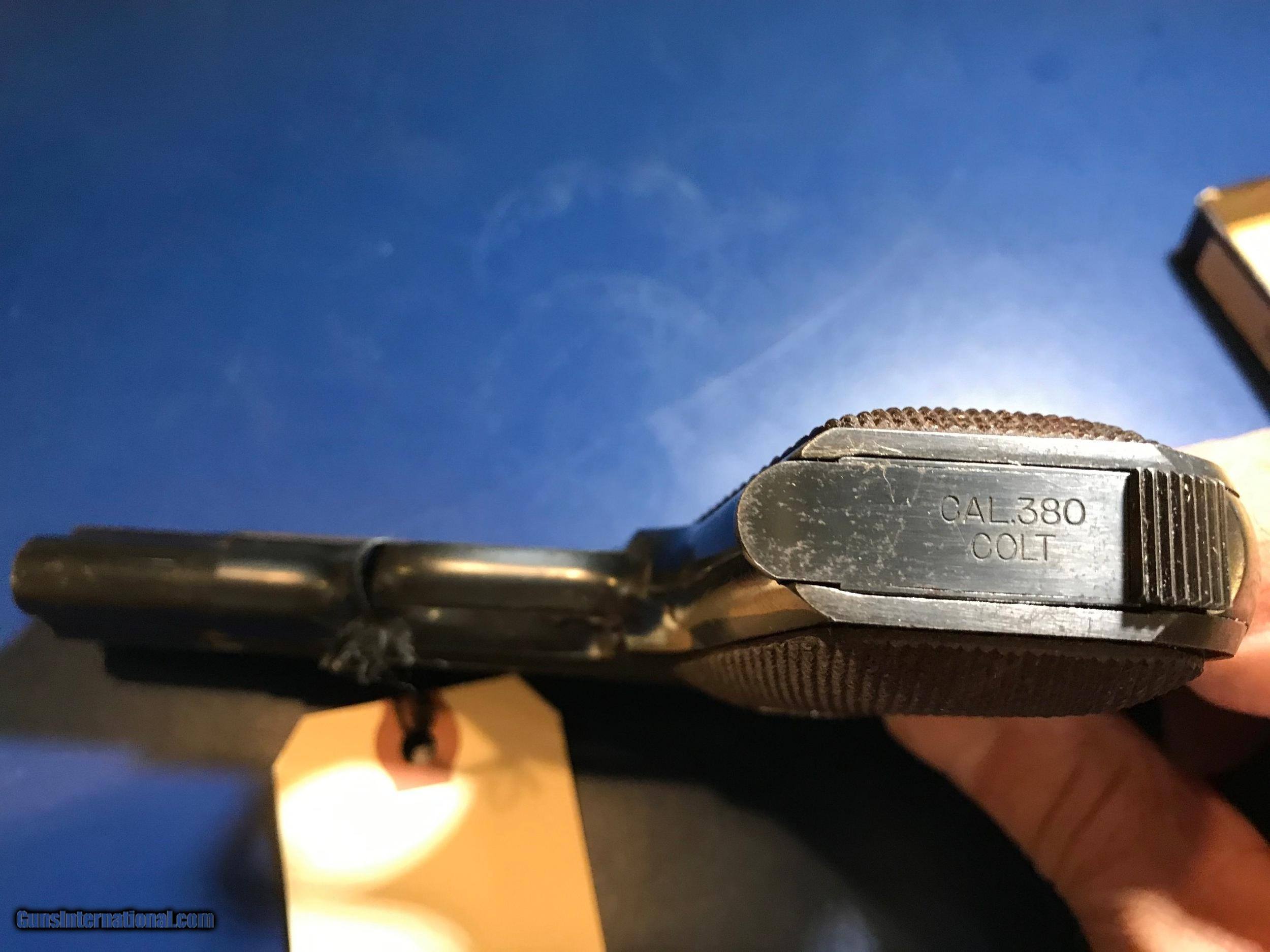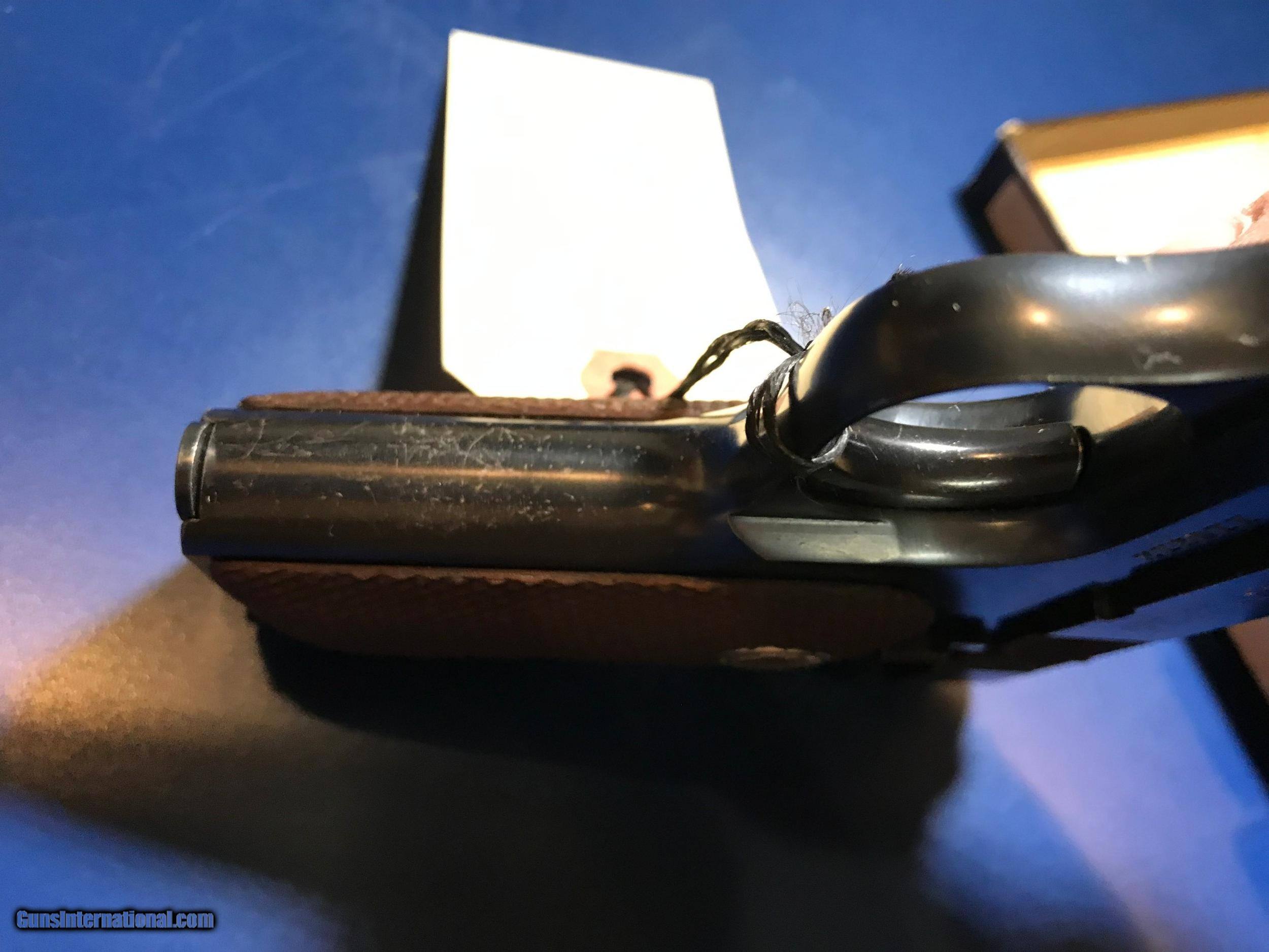 Description: Really nice 380 Colt in original box with labels intact. Grips are perfect. Very slight blue wear on muzzle. Made 1932. SOLD Curio/Relic: Yes |