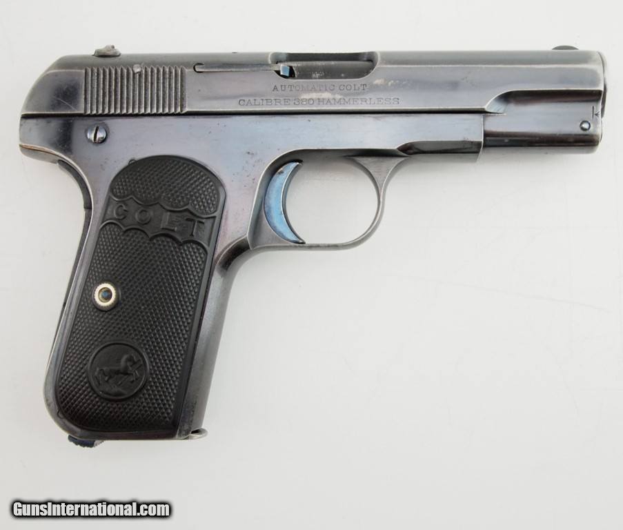Description: Colt 1908 MFG 1910 .380 ACP, 3 1/2" bbl, bright shiny bore, good rifling, dove tail rear notch sight, blade front sight, blued finish, one 7 round magazine, and very nice Colt checkered grips. Add 3% for Credit Card Shipping $25.00 SOLD |