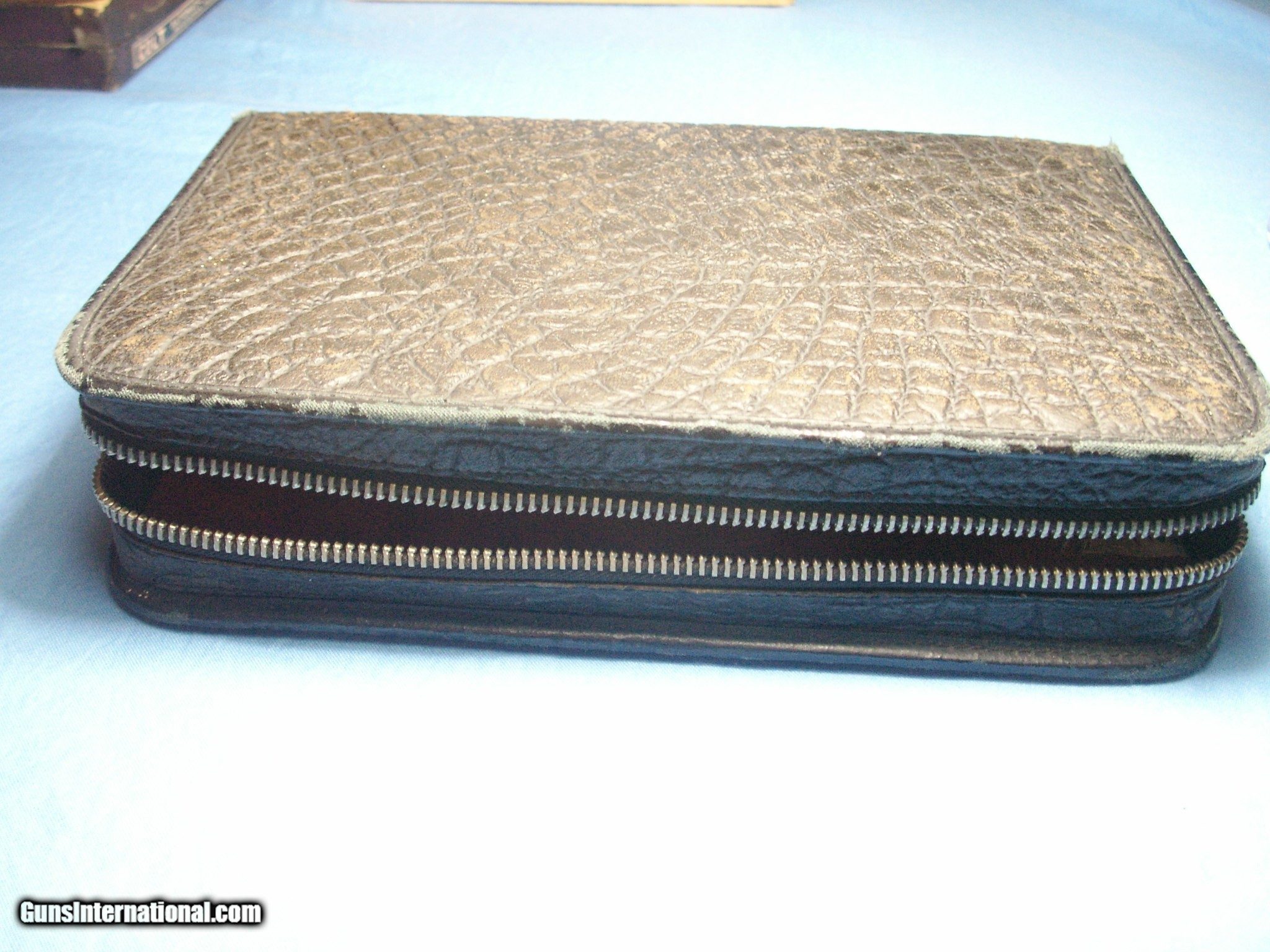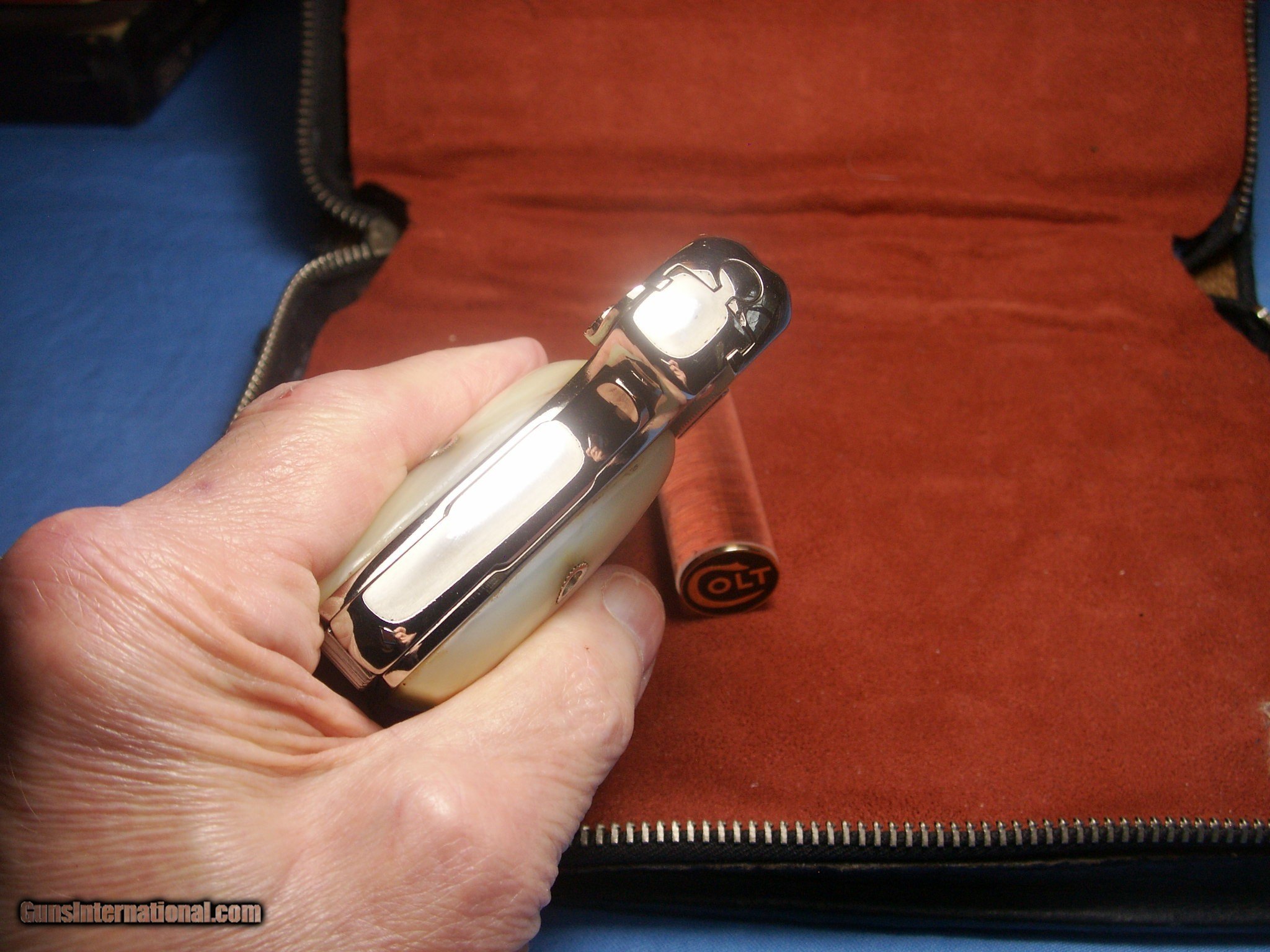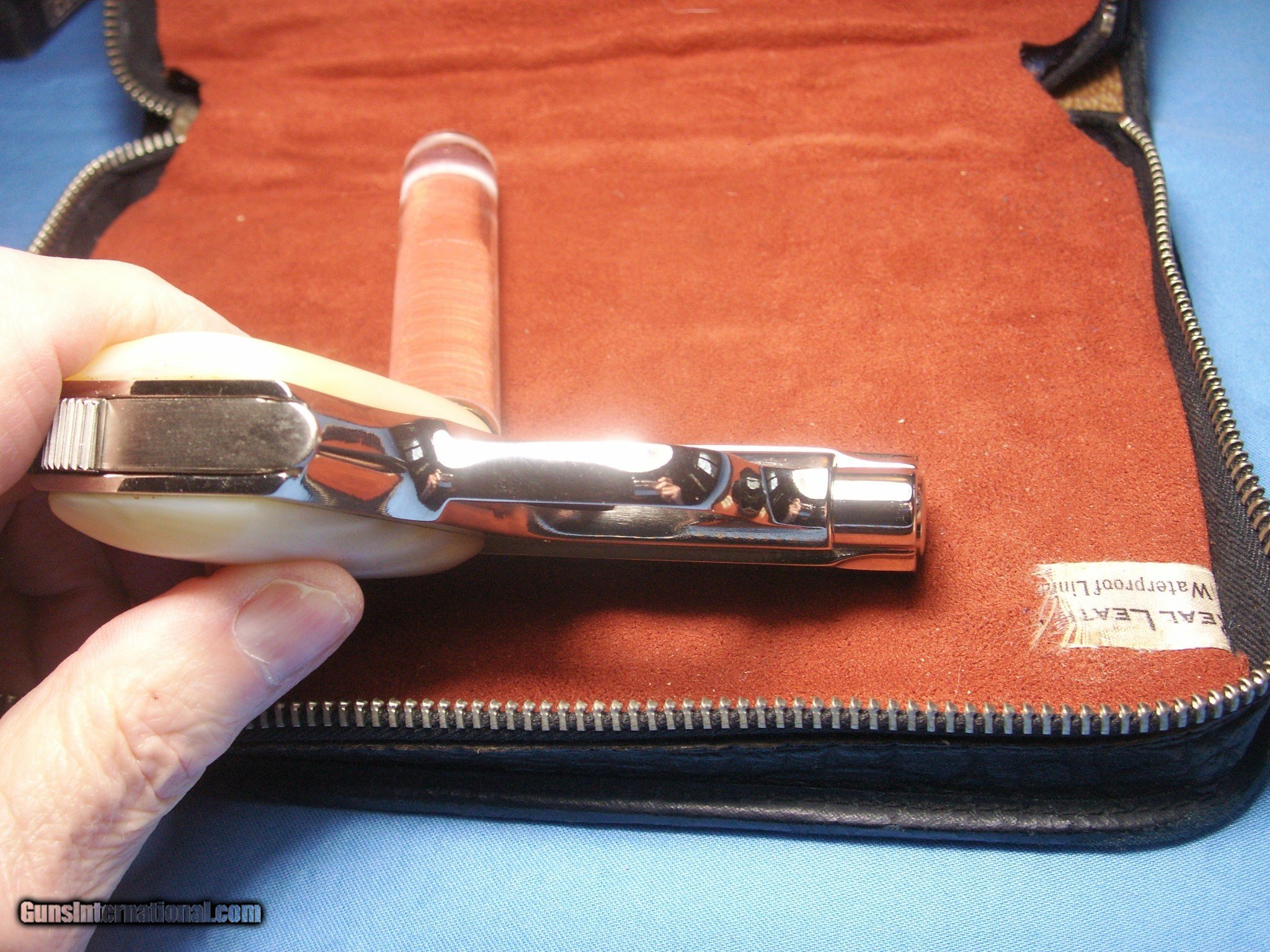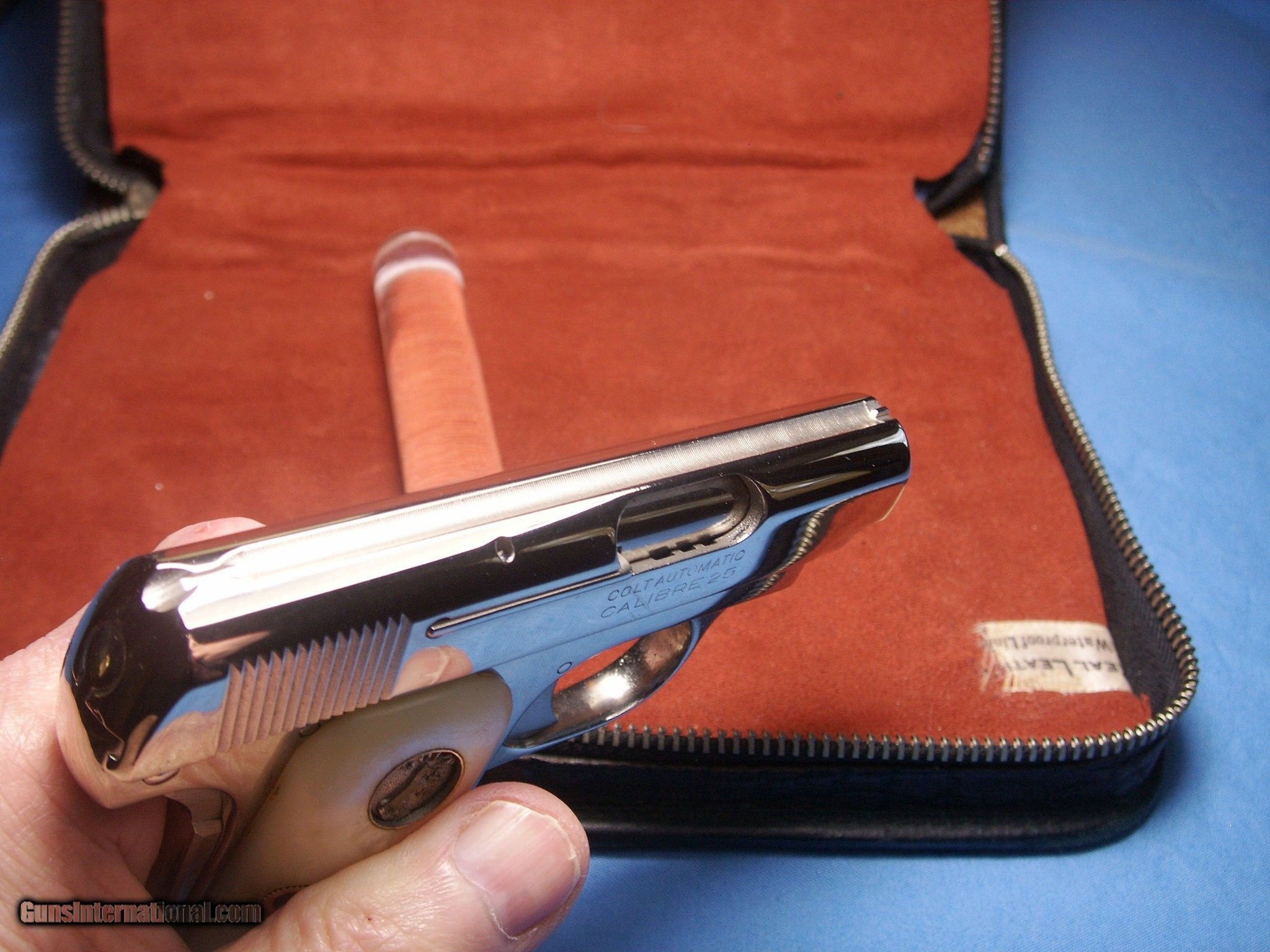 Description: SOLD PENDING FUNDS: This is a Colt vest pocket auto pistol in .25 ACP caliber with a 2" barrel. The condition is rated at 99% original nickel finish with excellent Colt Pearl grips with deep dish medallions. This was manufactured in 1923 and the bore is mirror bright and the mechanics funtion perfectly. The Pearl grips are excellent with no cracks. There is no box or papers, but comes in a leather zippered case. This is one of the nicest Nickel .25 autos I have seen. Most nickel prewar guns have hundreds of fine scratches however this one does not. If you're looking for a high condition nickel prewar Colt this is it. A great collectors piece and a super investment. SOLD Curio/Relic: Yes |