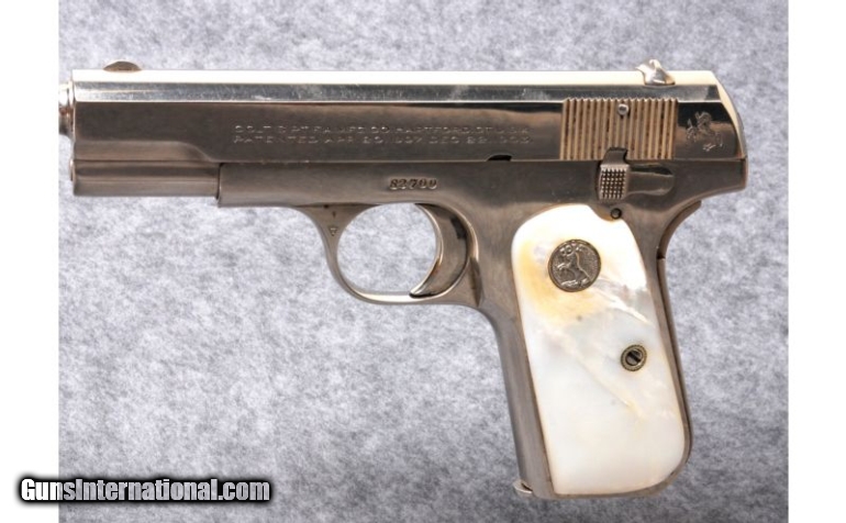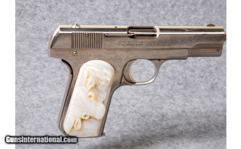 Description: SOLD Caliber Info: .380. Metal Condition: Nickel frame and slide, left-side slide lock, grip safey, grip butt magazine release. Bore Condition: Excellent. Barrels: 4" barrel. Triggers: Nickel, solid trigger. Stock: Genuine pearl grips with the right grip carved as a steer head. Weight: 27 oz. Sights: Blade front and windage rear. Item Location: Kansas City, KS |