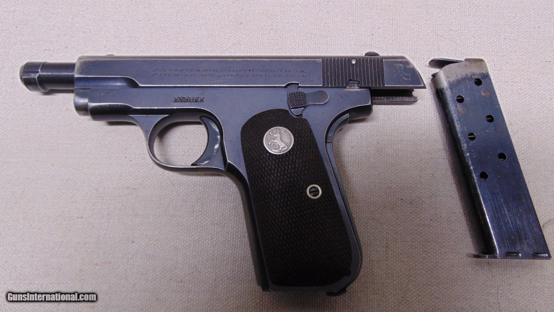 Description: Colt 1908 Pistol, 380 Auto,3-3/4" Barrel,Type IV Manufactured 1937, Matching Slide Number, Two Tone Magazine,About 80-85% Bluing, Very Good Grips, Excellent Bore!! Store Hours-Thurs-Fri-10AM-8PM Sat-9AM-12PM All Other Times Please Leave a Message, Thank You! Lower 48 State Sales Only No California Sales 6% Pa Sales Tax Applicable Shipping $35.00 SOLD Handgun Caliber: .380 ACP (9x17mm Browning Short) Manufacturer: Colt Model: 1908 Pistol Serial Number: 123011 Barrel Length: 3-3/4 |