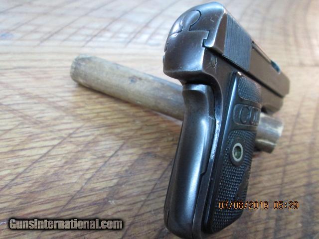 Description: COLT 1908 POCKET HAMMERLESS 25 ACP. (MFG. 1910) PISTOL. 2" BARREL WITH EXCELLENT BORE AND FIXED SIGHTS.ALL ORIGINAL METAL BLUE WITH BROWNING OF SLIDE METAL BLUE.1 ORIGINAL MAGAZINE AND ORIGINAL CHECKERED COLT GRIPS IN EXCELLENT SHAPE. 379.00 PLUS 40.00 SHIPPING CHECKS TAKE 10 DAYS TO CLEAR,M/O'S TAKE 5 BUSINESS DAYS TO CLEAR,NO CREDIT CARDS TAKEN.CALL DANNY AT 828=698=8804 IF NEEDED.GOD BLESS! SOLD Curio/Relic: Yes |