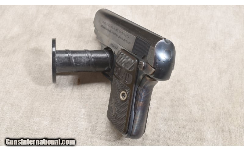 Description: The picture of discretion in its tiny size. The pistol features good blue, and back strap safety. Date of manufacture is 1921. .25 ACP SOLD Chambers: 6 + 1 capacity Metal Condition: Very good.There are a few handling marks. Wood Condition: Very good. Bore Condition: Bright and shiny with good rifling. Barrels: 2-inch Triggers: Factory single action trigger. Butt Pad: Black plastic grips. Weight: 13 Oz Sights: Post and top-strap groove. Item Location: Rogers |