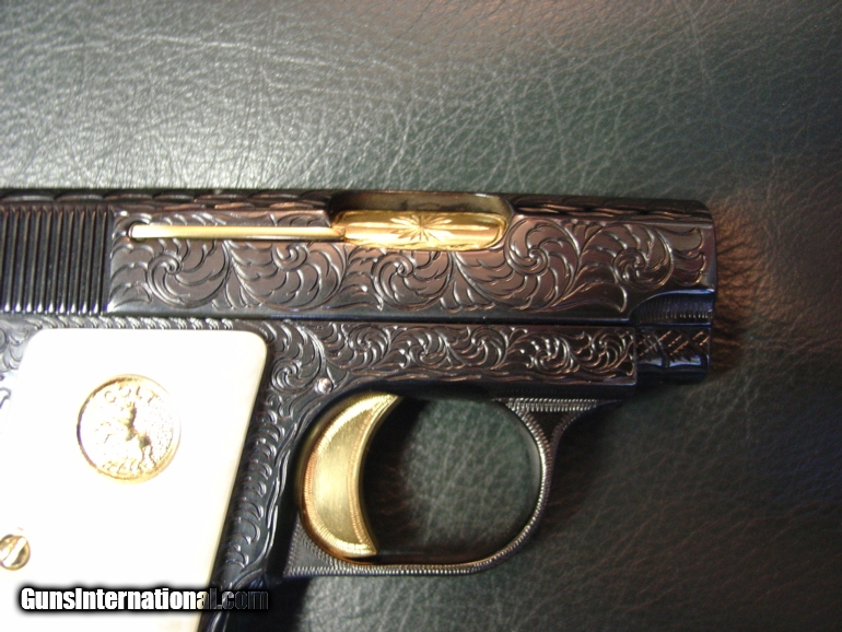 Colt 1908 Vest Pocket 25 caliber,made in 1918,fully refinished in blue with gold accents,Pearlite grips,fully Flannery engraved-awesome showpiece !!