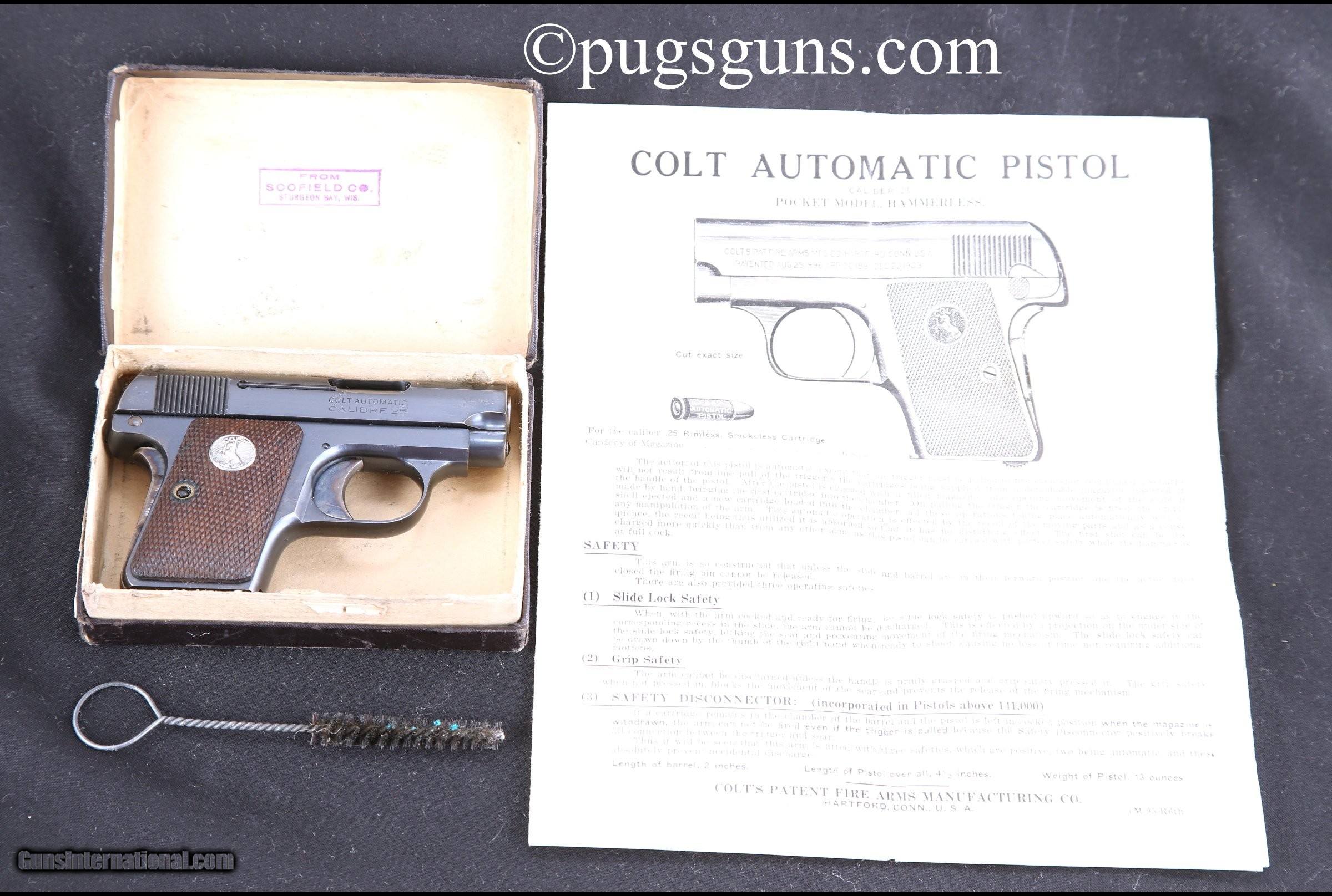 Description: " Curio/Relic: Yes Manufacturer: Colt Model: 1908 Vest Pocket with period box Serial Number: 375773 Caliber Info: 25 ACP Price: $1,995.00 Contact Seller |