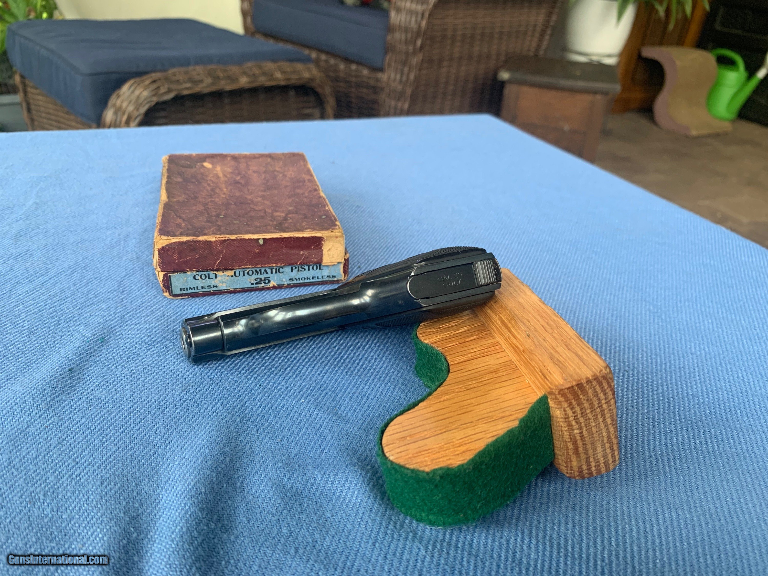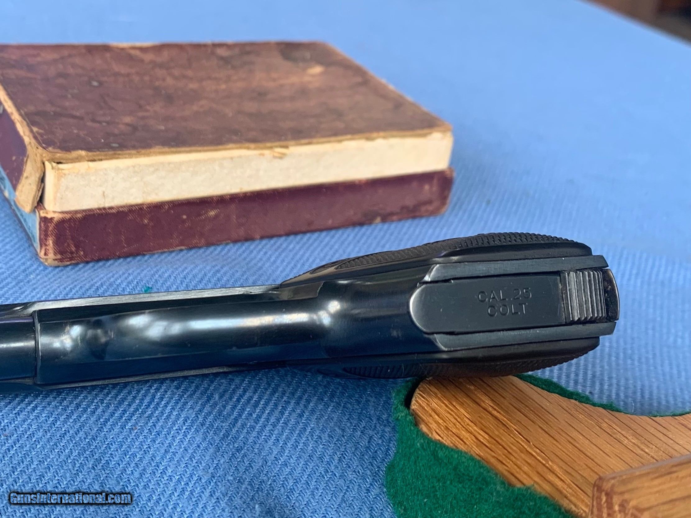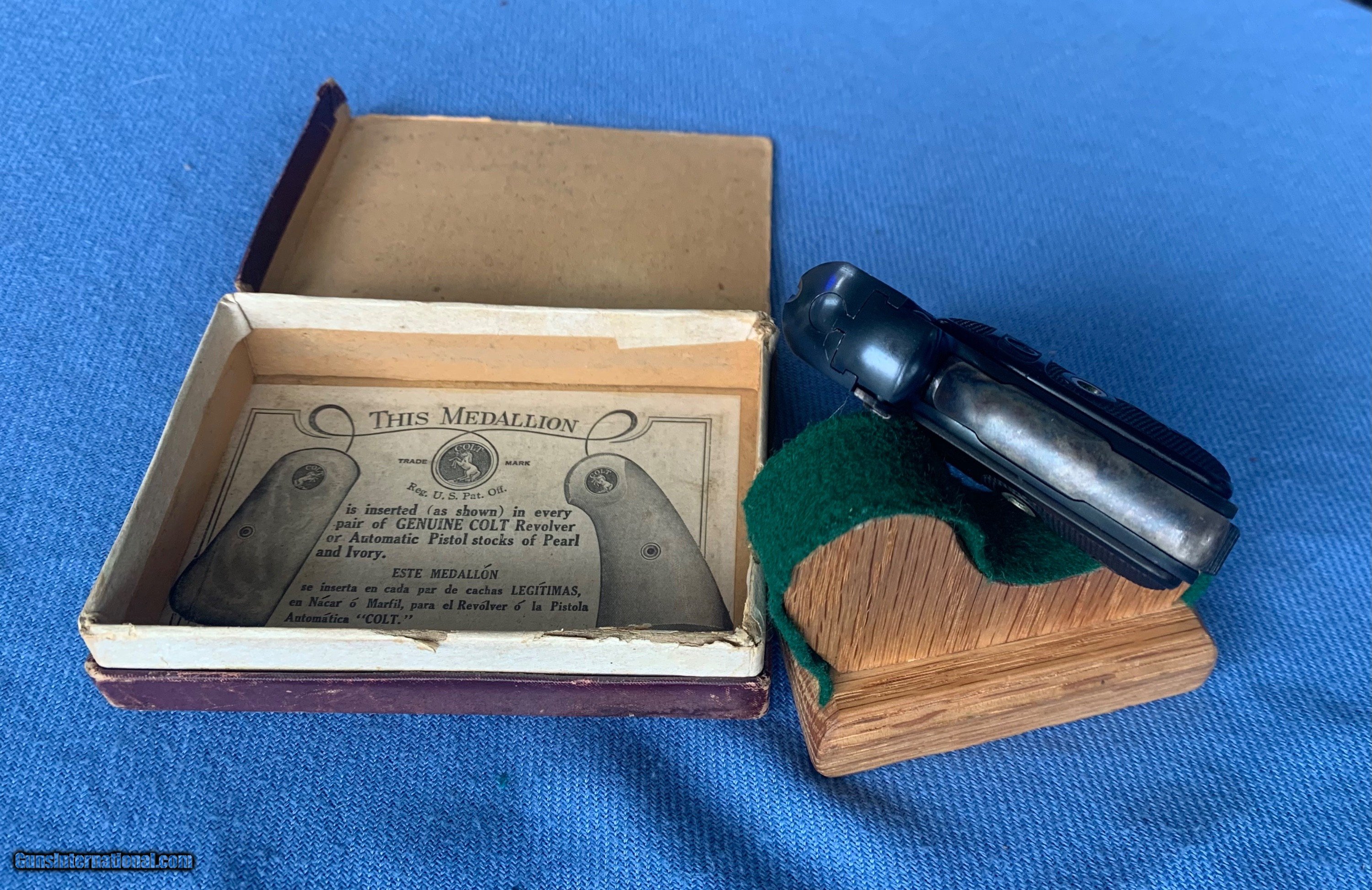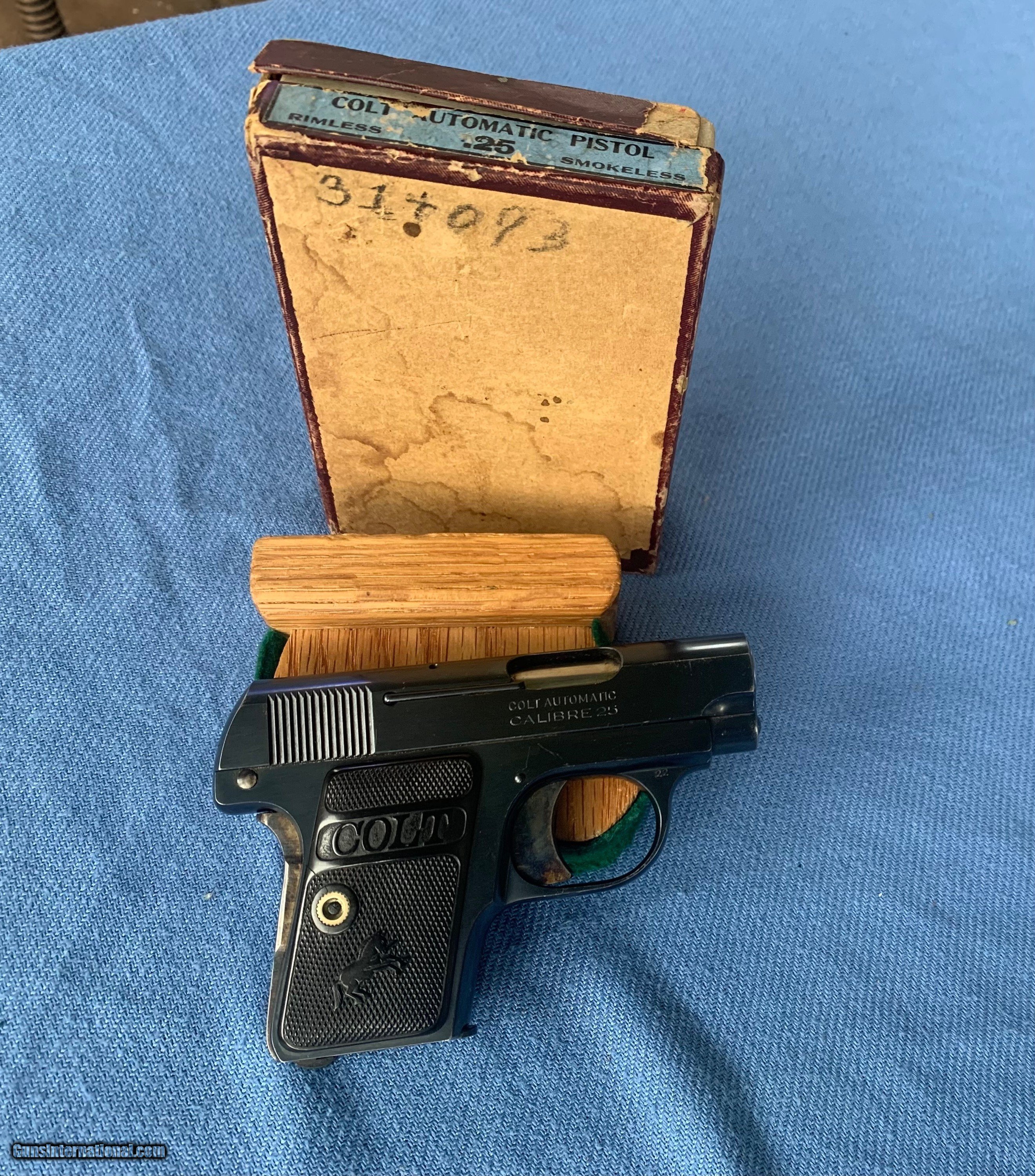 Description: Here's a Stunning Example of A Colt 25 Auto ! Serial number 314093. Comes with original colt box numbered to the gun ! Box is a little ruff and missing a few flaps. Gun is like new with some lite handling marks . Gun has all of its original solid blue finish still remaining! Hammer and grip safety have all of there vibrant case color hardening finish still remaining! Bore and mechanics are in excellent condition! Gun tight as a drum . Super nice gun with original box ! Please review my photos and please email me with any questions ? 3 day inspection as always ! Thank you for looking, Little Jo SOLD Antique: Yes Handgun Caliber: .25 ACP (6.35mm Browning, 6.35×16mmSR) Manufacturer: Colt Model: 25 auto Serial Number: 314093 Condition: Mint |