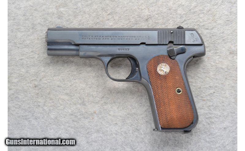 Description: This Colt Model Automatic Hammerless "1908" is a .380 Cal. semi-automatic pistol with a 3.75 inch barrel. In overall very good condition with excellent rifling it comes as is. No box. One magazine. SOLD Curio/Relic: Yes Manufacturer: 1927 - S/N 85697 Caliber Info: .380 Chambers: 7 shot magazine. Metal Condition: Very good. Minor handling marks. Wood Condition: Very good. Bore Condition: Excellent. Barrels: 3.75 inches. Triggers: Solid. Stock: Checkered hardwood grip panels with silver Colt medallions. Weight: 24 oz. Sights: Blade front. Notch rear. Item Location: Richfield, WI |