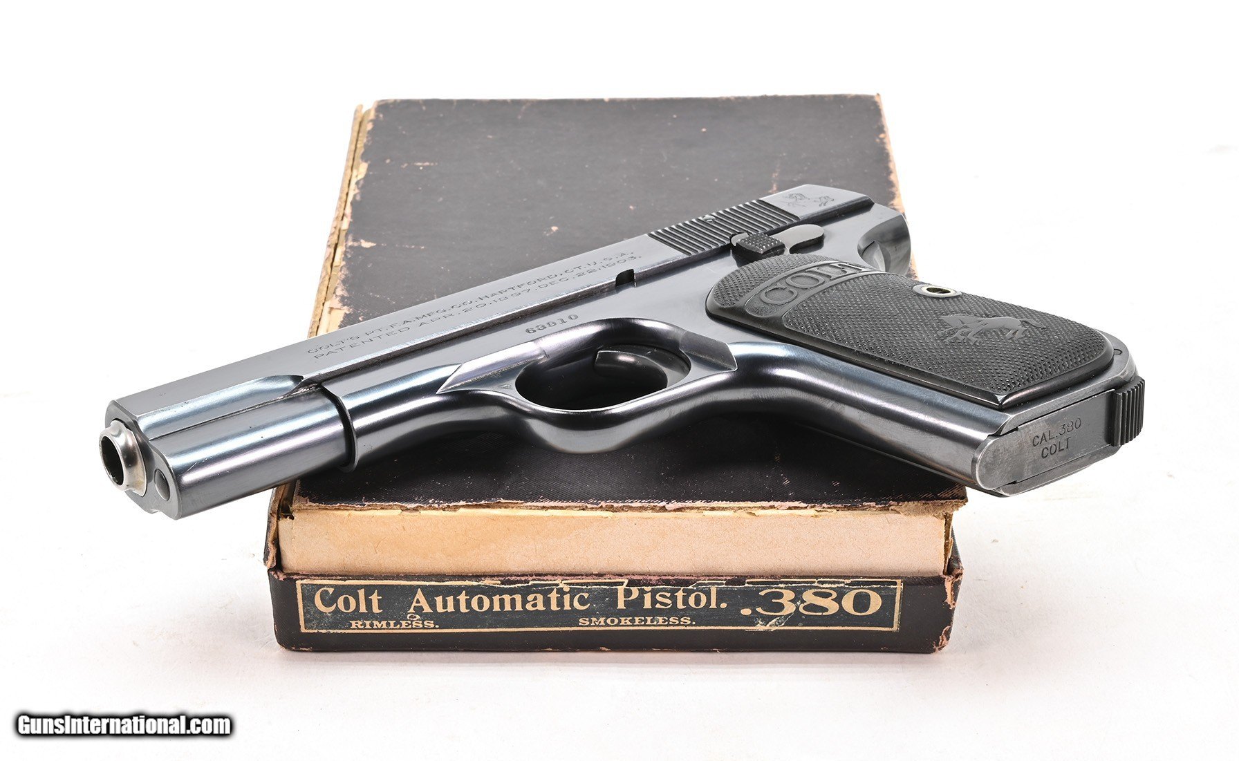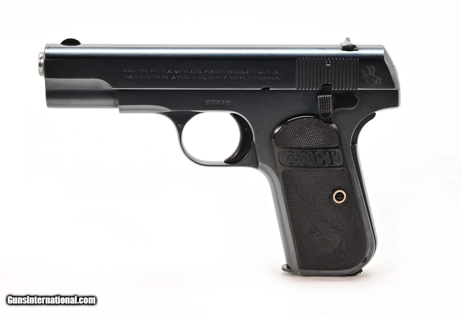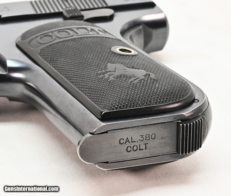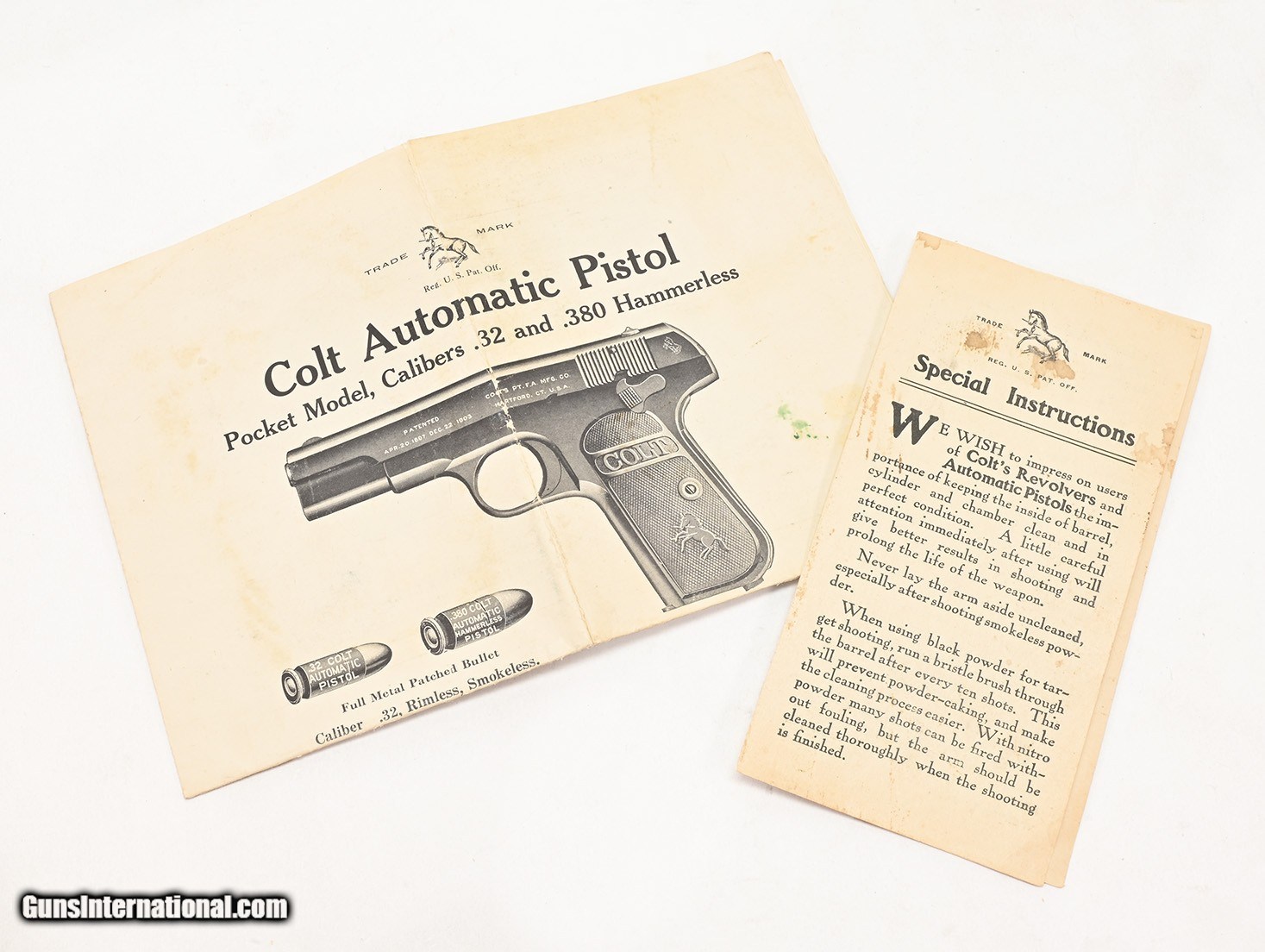 Description: Colt M 1908 Pocket Hammerless .380 ACP With Original Box And Extra Ivory Grips. Stunning Safe Queen! DOM 1923 AVAILABLE FOR PURCHASE AT OUR ON-LINE STORE The Model 1908 Pocket Hammerless is a compact, hammerless, striker-fired, semi-automatic single-action pistol. Manufactured by the Colt's Manufacturing Company from 1908 to 1948, it was marketed as a small concealable firearm which could be easily tucked into a vest pocket for unobtrusive carry. This Colt 1908 Pocket Hammerless .380 ACP comes with Colt factory original box, original factory grips, extra authentic ivory grips, original magazine and manual. Firearm is in incredible condition for its age. You'll never find one like this, a real unicorn! SPECIFICATIONS