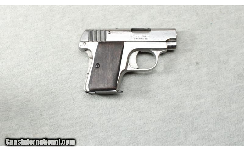 Description: Colt Model 1908 Hammerless Vest Pocket chambered in .25 Auto. This is a compact, hammerless, striker-fired, semi-automatic single-action pistol. It was manufactured by Colt's Manufacturing Company from 1908 to 1948. It was marketed as a small concealable firearm which could be easily tucked into a vest pocket for unobtrusive carry. It was designed by John Moses Browning. This pistol is nickel plated and was manufactured in 1917. No box. .25 ACP SOLD Curio/Relic: Yes Metal Condition: Good Wood Condition: Good Bore Condition: Bright Barrels: 2 inch Triggers: Factory Weight: .12 oz Sights: Fixed Item Location: La Vista, NE |