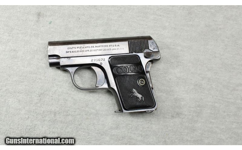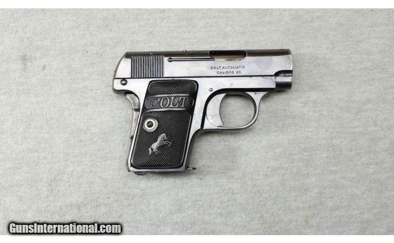 Description: Model M1908 Hammerless in .25 Auto. This is a compact, hammerless, striker-fired, semi-automatic single-action pistol. Manufactured by the Colt Manufacturing Company from 1908 to 1948, it was marketed as a small concealable firearm which could be easily tucked into a vest pocket for unobtrusive carry. This pistol was made in 1920 and includes the original box and 2 mags. .25 ACP SOLD Metal Condition: Very good Bore Condition: Bright Barrels: 2 Inches Triggers: Factory Weight: 12 Ozs. Sights: Fixed Item Location: La Vista, NE |