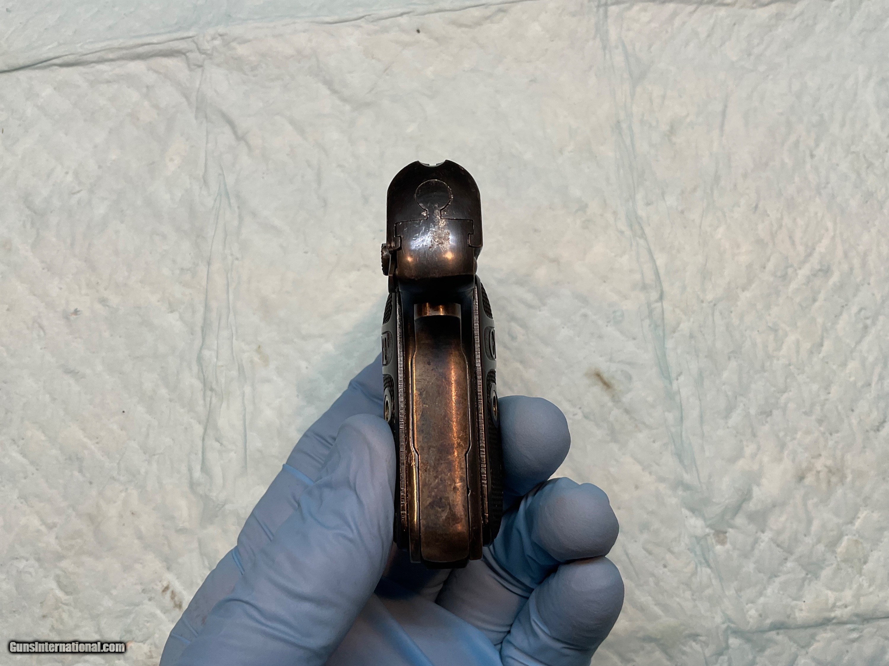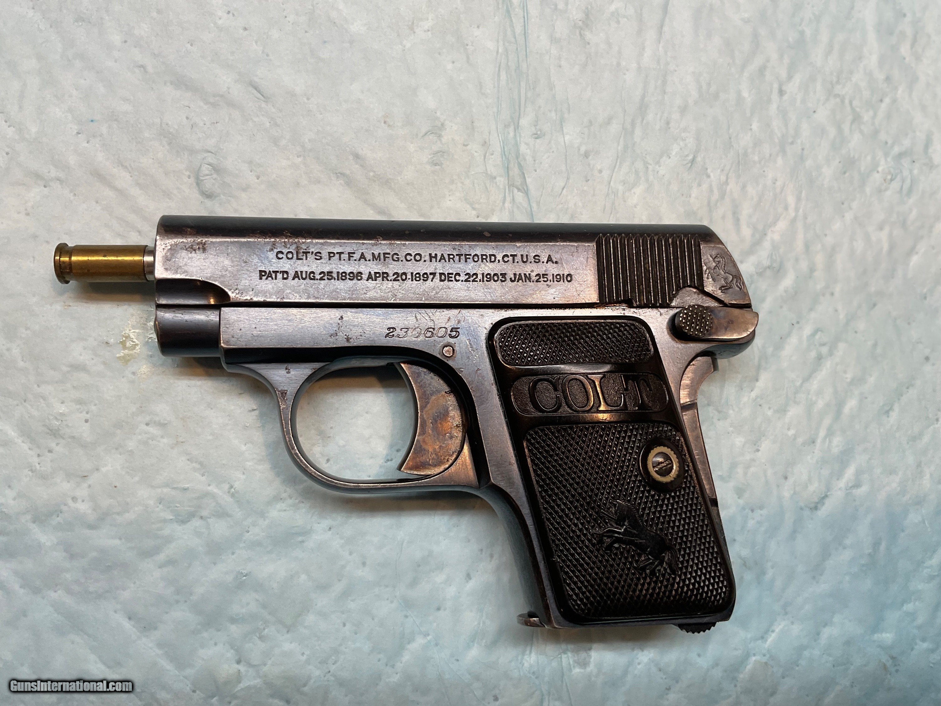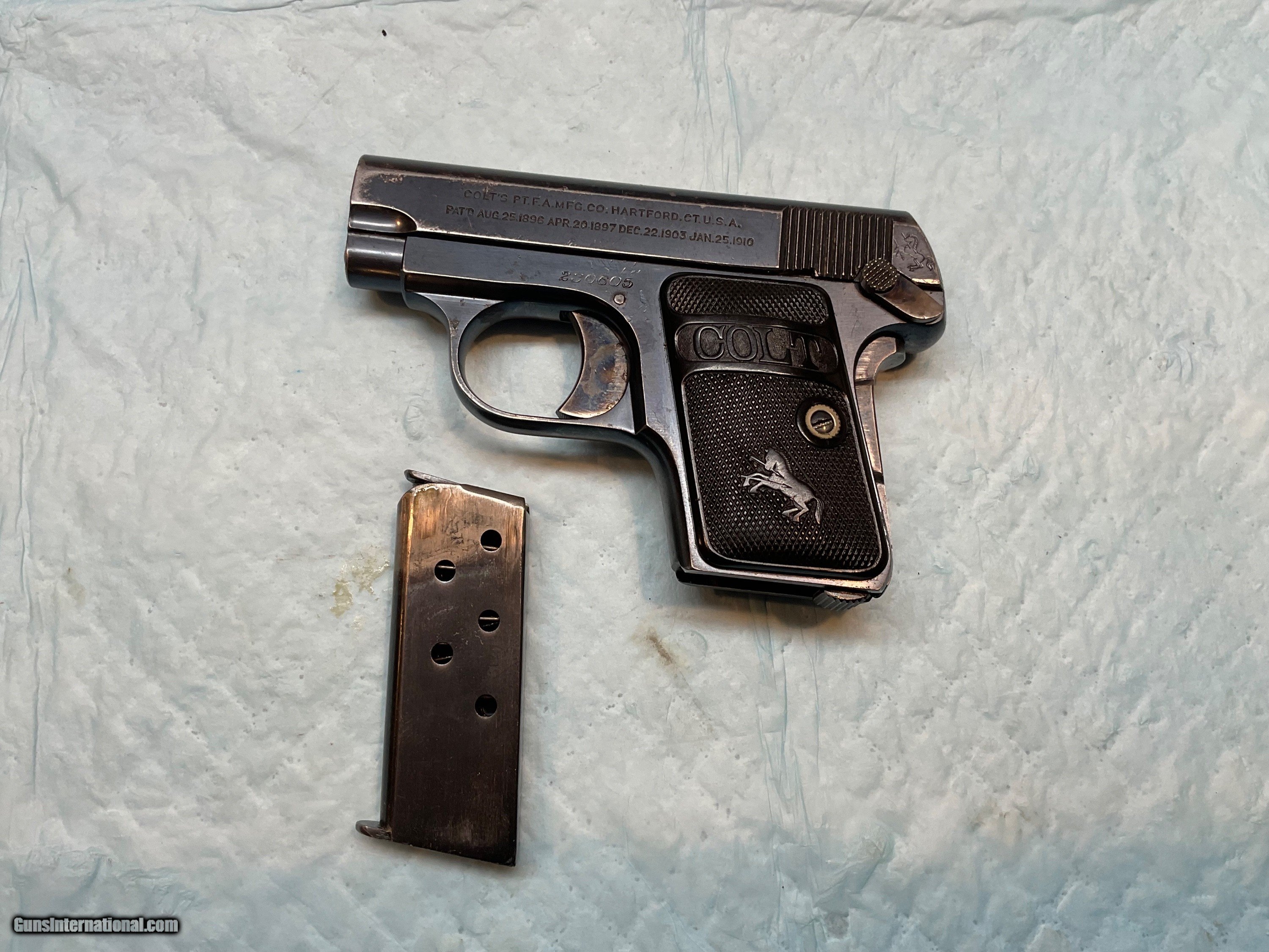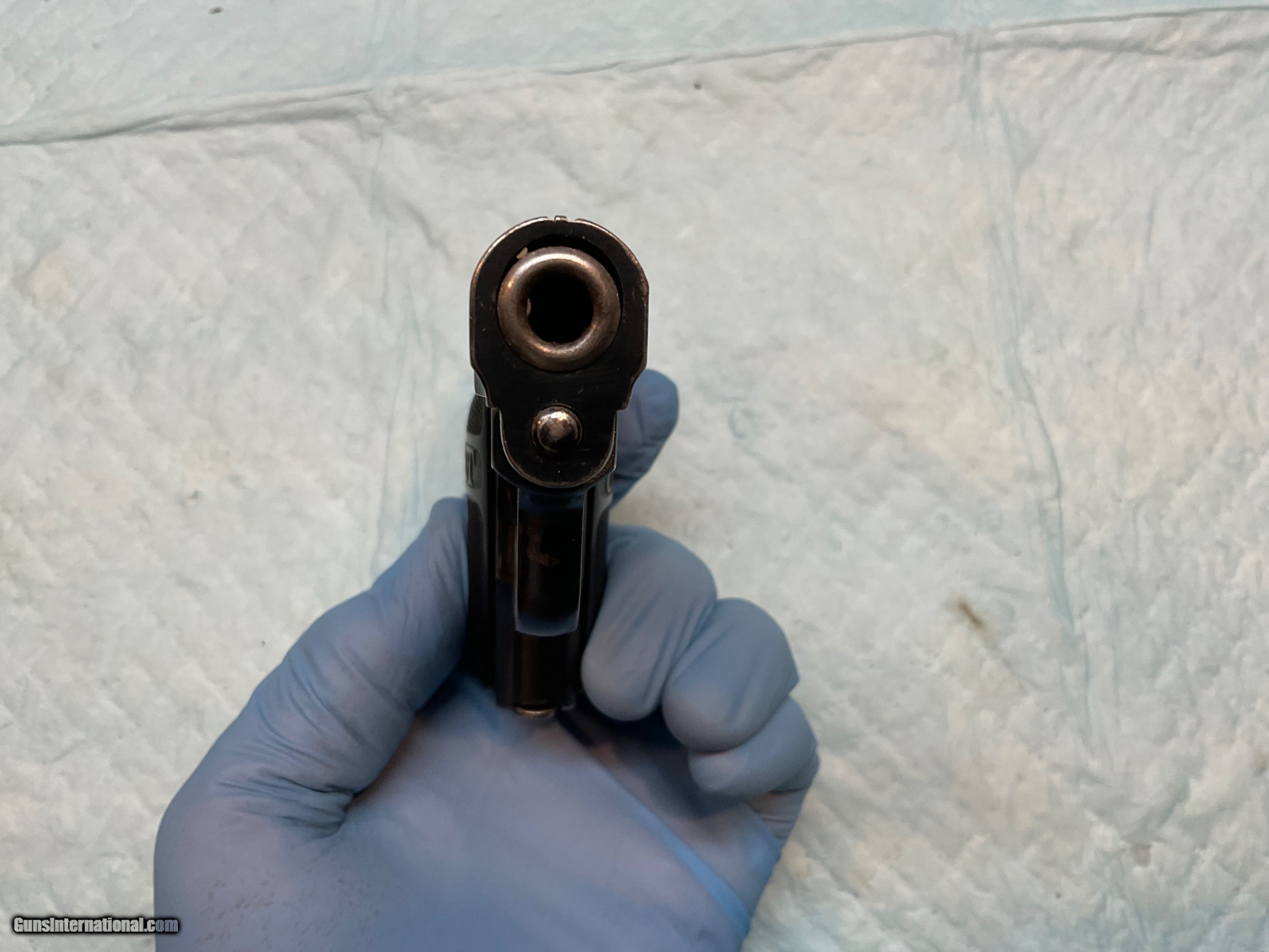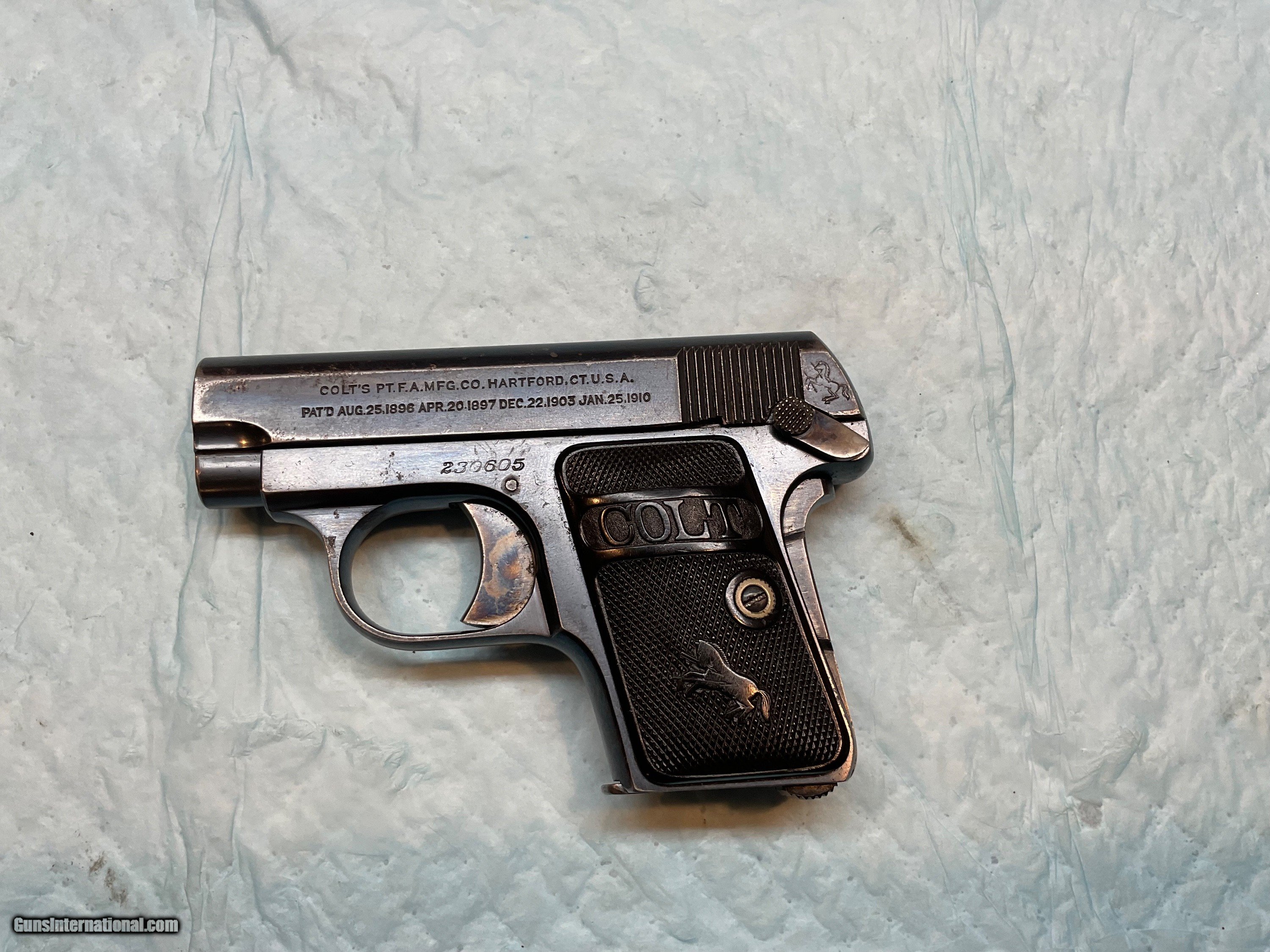 Description: Nice Colt 1908 pistol in .25 acp, manufactured in 1919. This pistol still retains about 85-90% of the original bluing. Nice case colors on the trigger and safety/slide lock. There is some very minor pitting and a few small scratches which can be seen in the pictures. The barrel has strong rifling with evidence of some pitting. However, as shown in the picture with a cartridge, the bore has little or no muzzle wear. No sales to any state or local jurisdiction that requires an FFL to FFL transfer. This pistol is eligible for a C&R transfer. It is the buyers responsibility to know the law in their jurisdiction. Sales only to the contiguous 48 States of the United States. No sales to Hawaii or Alaska. NO foreign sales. Please look closely at the pictures and ask questions. This pistol is 105 years old. It will show signs of use. I do not accept returns unless not as described. Payment by USPS MONEY ORDER, Certified Check, or Personal Check. I will hold shipping of pistol until a personal check clears my bank. PRICE DOES NOT INCLUDE SHIPPING. SOLD Curio/Relic: Yes Handgun Caliber: .25 ACP (6.35mm Browning, 6.35×16mmSR) Manufacturer: Colt Model: 1908 Serial Number: 230605 Condition: Very good Metal Condition: Very good Bore Condition: Good |