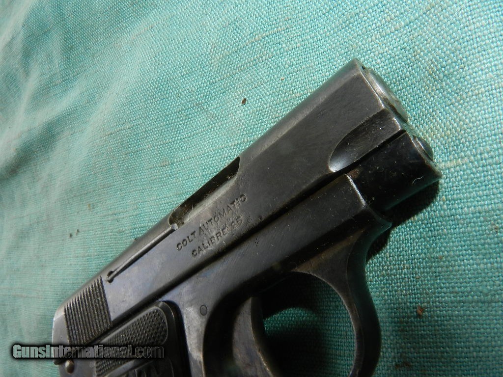 Description: <<<SOLD>>>A greart shooter this Model 1908 Colt .25 auto has a good bore, clean and strong rifling , madw with a gris safety likd most Cllt autos but no often found on foreign autos. Made from the John Browning blow back patent , these fine guns were mad from 1908 until 1941 , where the war production ended this 1908 model . A rugged trust worthy , wel made carry auto with very good Cllt fsctory black hard rubber grips in excellent condition, and comes with one mag. The exteror metal is full blue, but U see some inconsistencies under the blue like fine scratch marks , and along the top of the left side of the slide there are very small patches of shallow pits So this may have been reblued or touched -up . Still a worthy pocket companion when out on the town.When buying a gun always have it examined by a competent gunsmith before shooting. To buy a gun from me you must get a direct email for me, with details, and shipping cost. We don’t have a web site .I prefer money orders or a check. Item ships when funds come in. I try to keep guns affordable, which means I make less money than most dealers. You won’t get altitude sickness, or nose bleed, with my prices! I consistently have the best selection of older guns If you attempt to buy, you must still contact us for details . Best to email to buy. Sometimes a local person can stop buy and purchase before the gun is removed. Sometimes not home to get calls. Some guns are required shipment to a gun dealer near you for a transfer to you when it arrives. Otherwise many older or black powder guns ship to your door. With the widest selection of older guns at great prices, We don’t have a store, and sell on the internet only. I’m easy to get along with. Thank You. SOLD Curio/Relic: Yes |