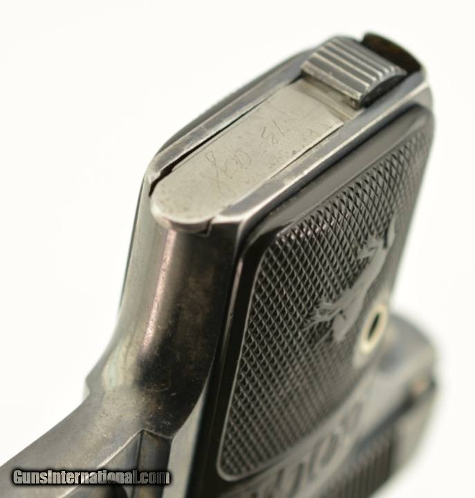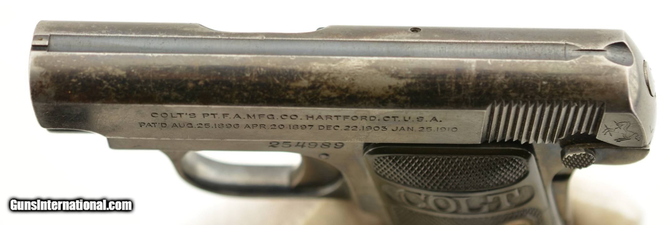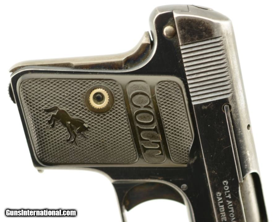 Description: Serial #254989, .25 ACP, 2 inch barrel with an excellent bore. This is the Colt model 1908 "Vest Pocket" auto pistol manufactured in 1920. The little pocket auto retains about 80-85% of the original blue with silvering on the high edges and thinning on the sides of the slide and curve of the trigger guard. The trigger and grip safety show vibrant case color. The hard rubber, checkered Colt grips rate about excellent. Mechanically it functions properly. Included is one 6 round magazine. FFL or C&R SOLD Curio/Relic: Yes |