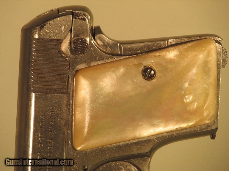 Description: COLT MODEL 1908 SEMI AUTO PISTOL, SN 2544XX, 25 cal., Mother of pearl grips, 96% nickel, VG bore. F.F.L. REQUIRED SOLD |