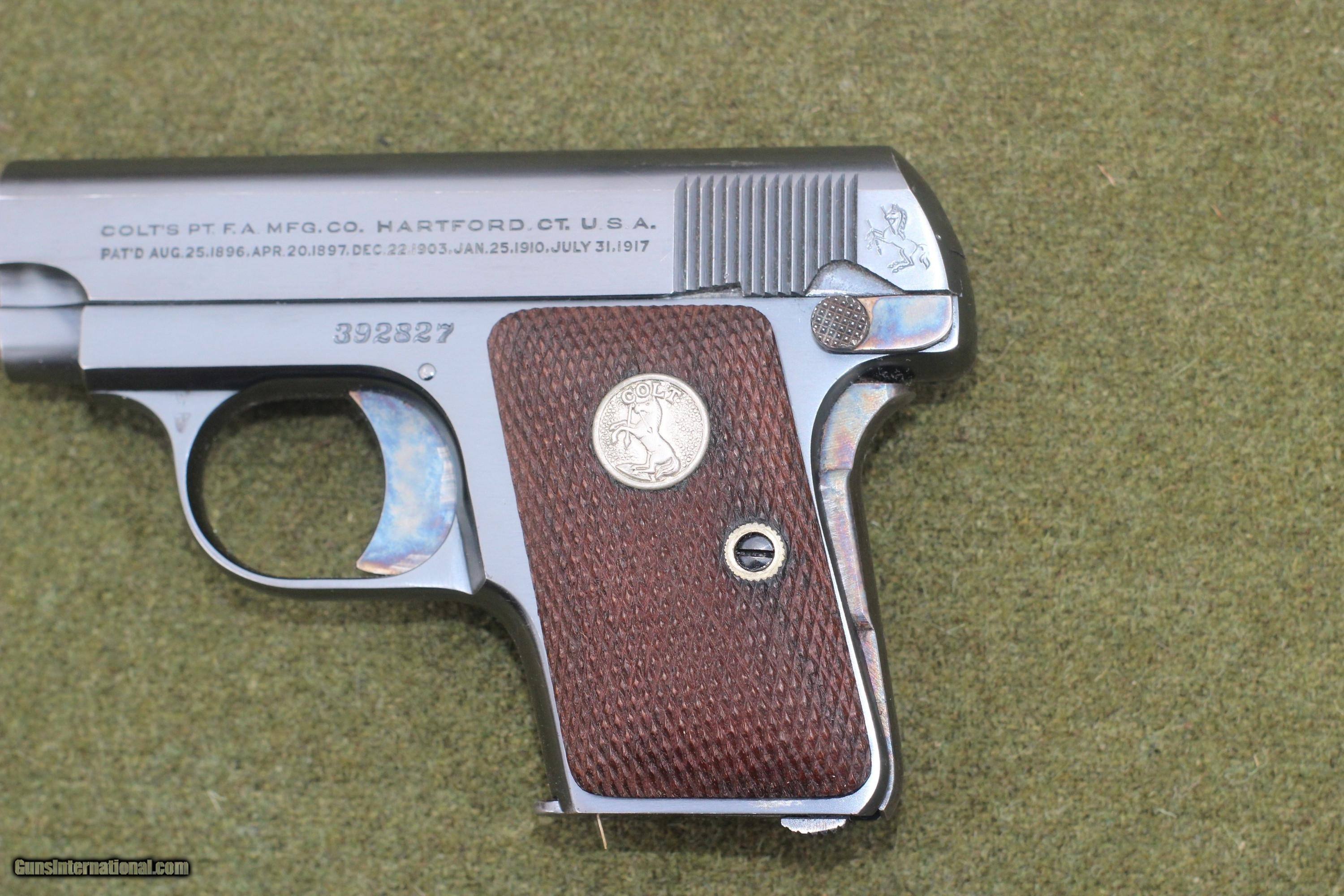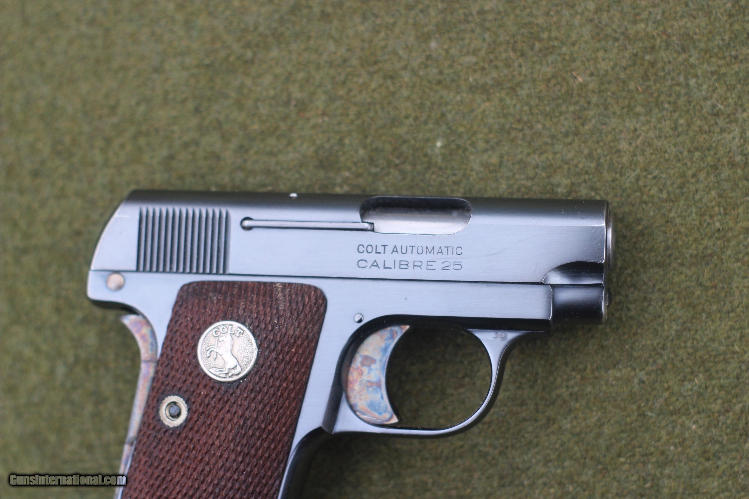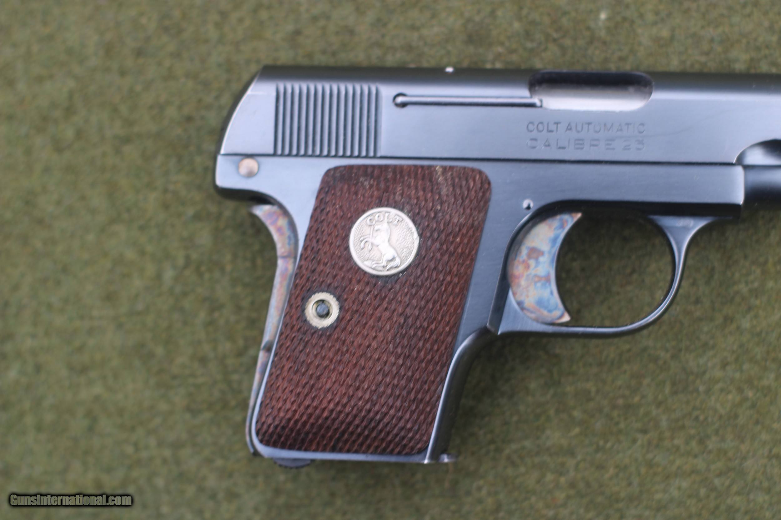 Description: Circa 1932 100 % original condition 99% + factory charcoal bluing Beautiful factory case colored small parts Walnut Colt grips Factory two-tone magazine Perfect bore Holster included Collector quality , would by difficult to find one in nicer condition $ 1159 + Shipping SOLD |