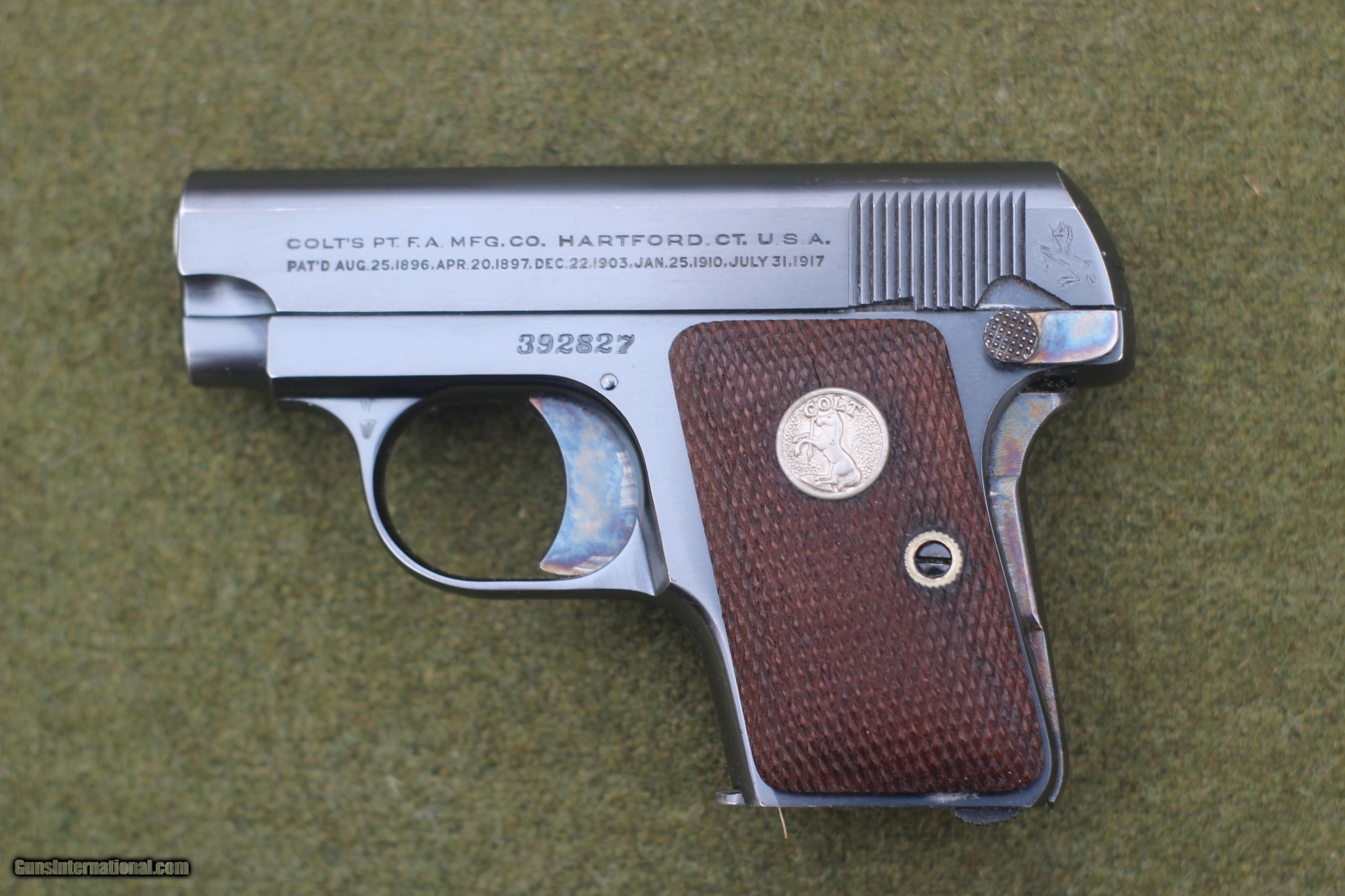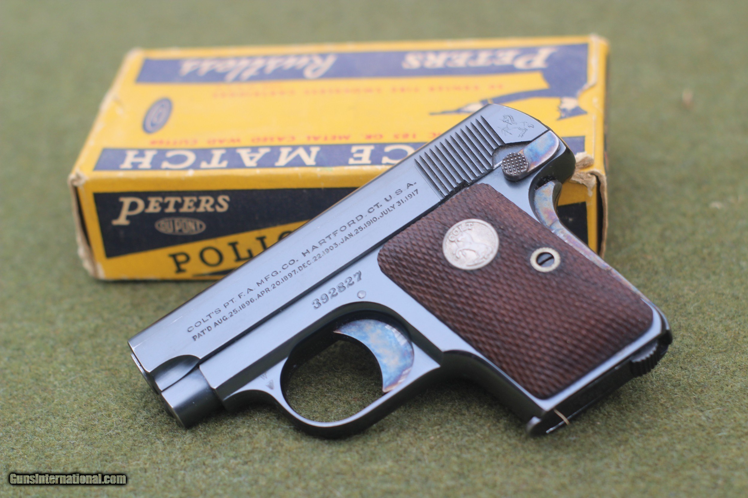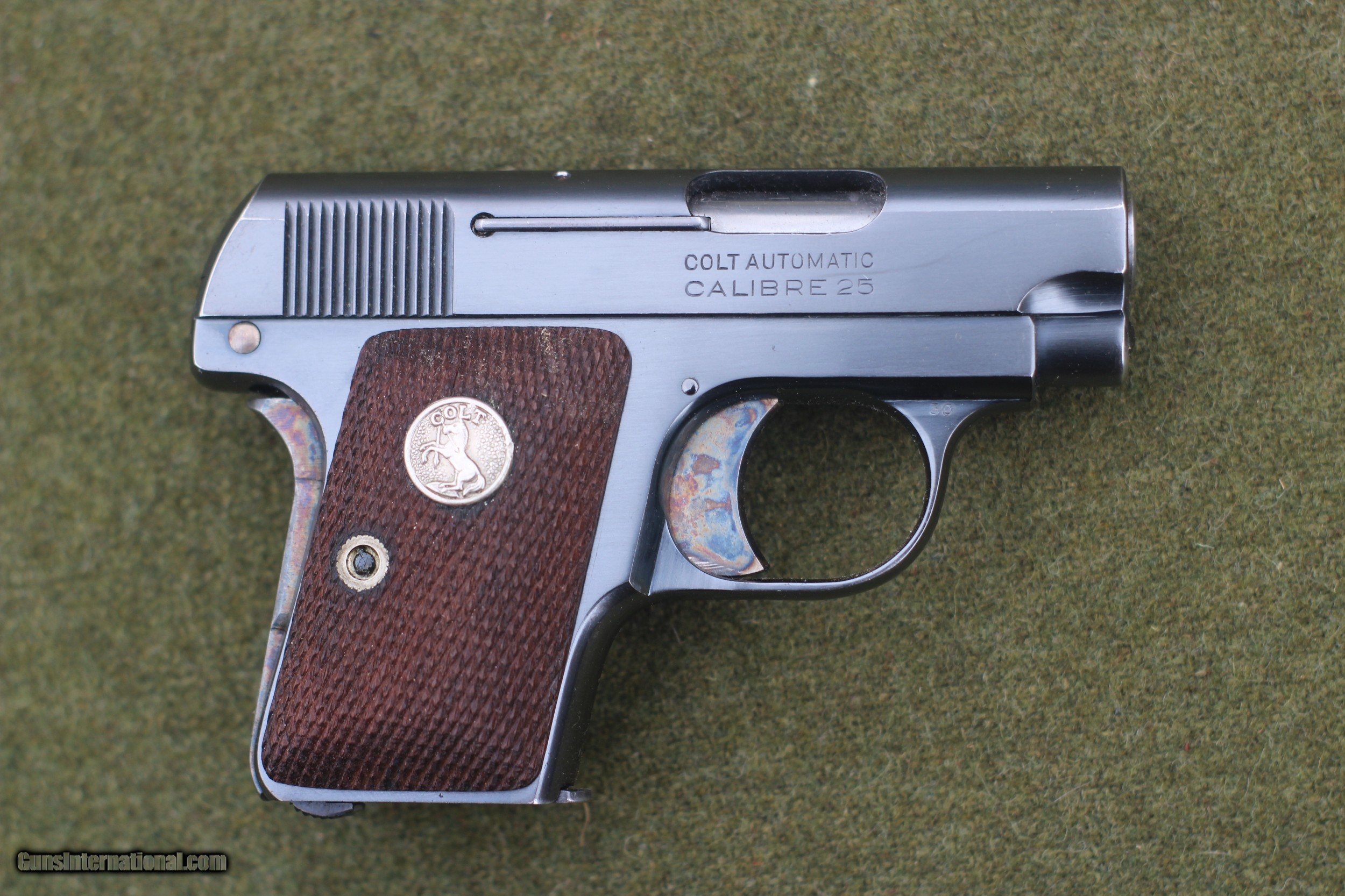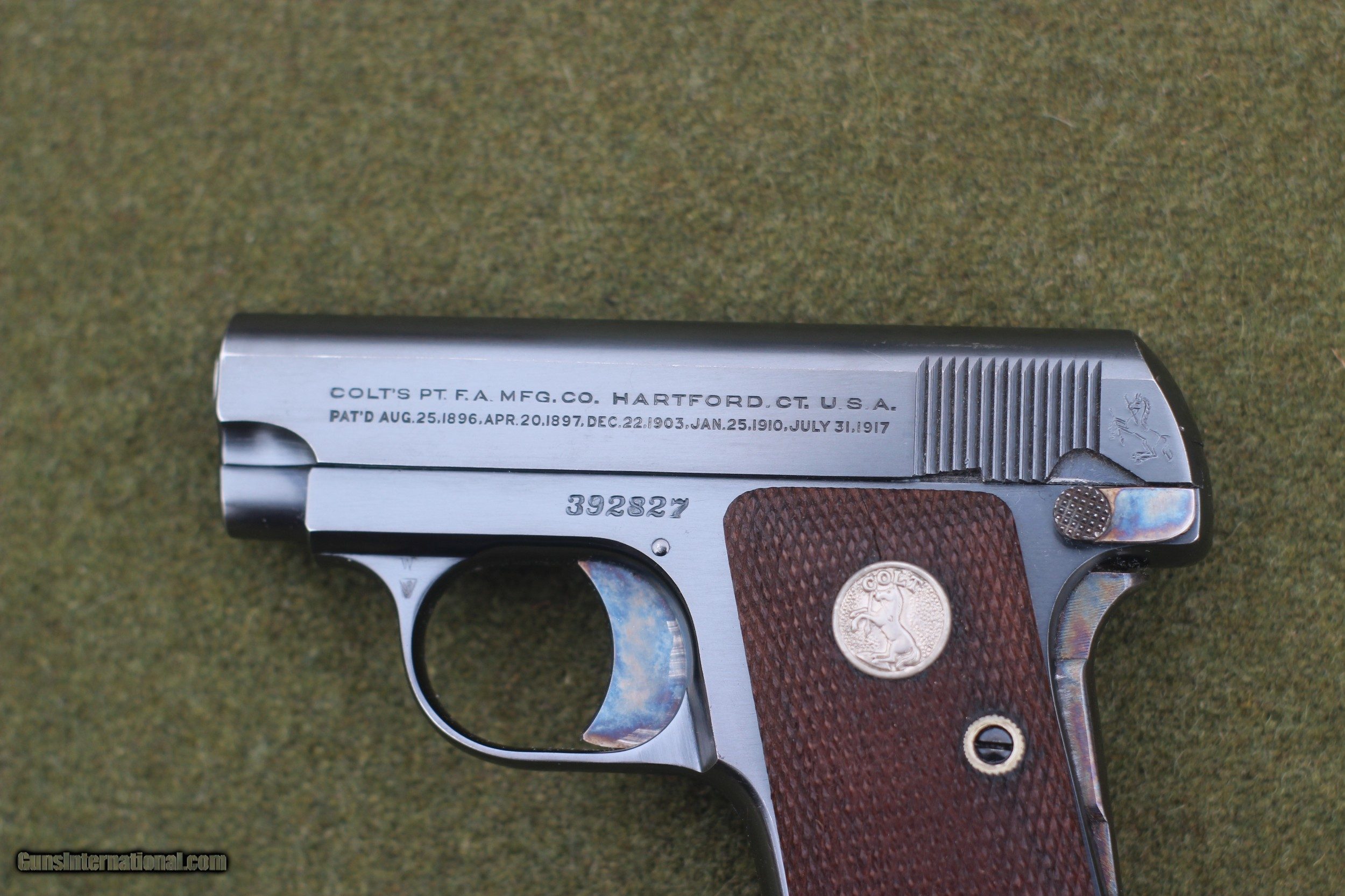 Description: Circa 1932 100 % original condition 99% + factory charcoal bluing Beautiful factory case colored small parts Walnut Colt grips Factory two-tone magazine Perfect bore Holster included Collector quality , would by difficult to find one in nicer condition $ 1159 + Shipping SOLD |