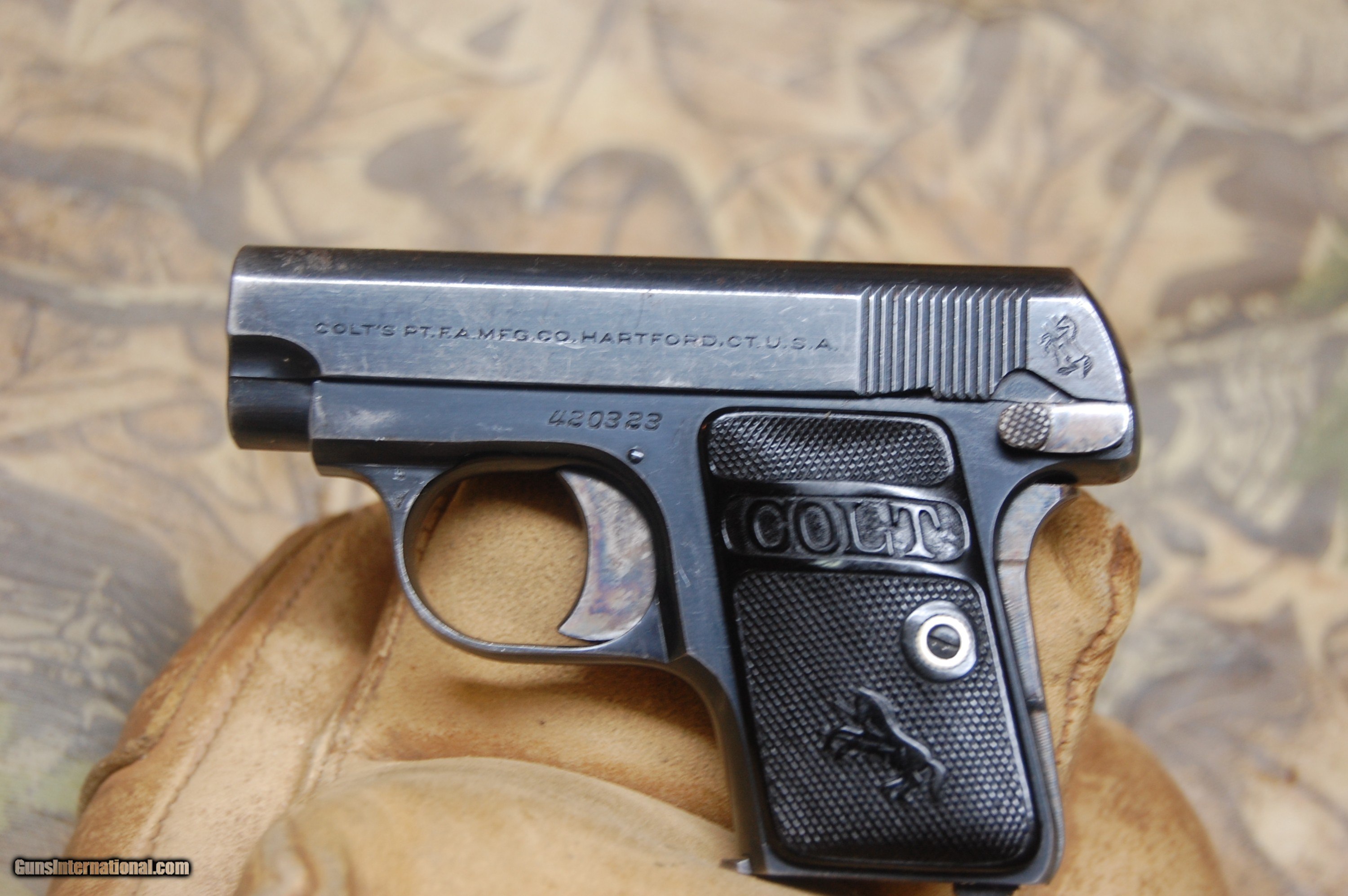 Description: Colt Model 1908 Vest Pocket in 25 ACP. It has a 2” barrel, fix sights, blue finish, checkered hard rubber Colt grips, and a six shot magazine. This pistol is in good working condition and retains about 80% of the bluing. $695.00 SOLD Manufacturer: Colt Model: 1908 Serial Number: 420323 Barrel Length: 2 Condition: Very Good Metal Condition: Good |