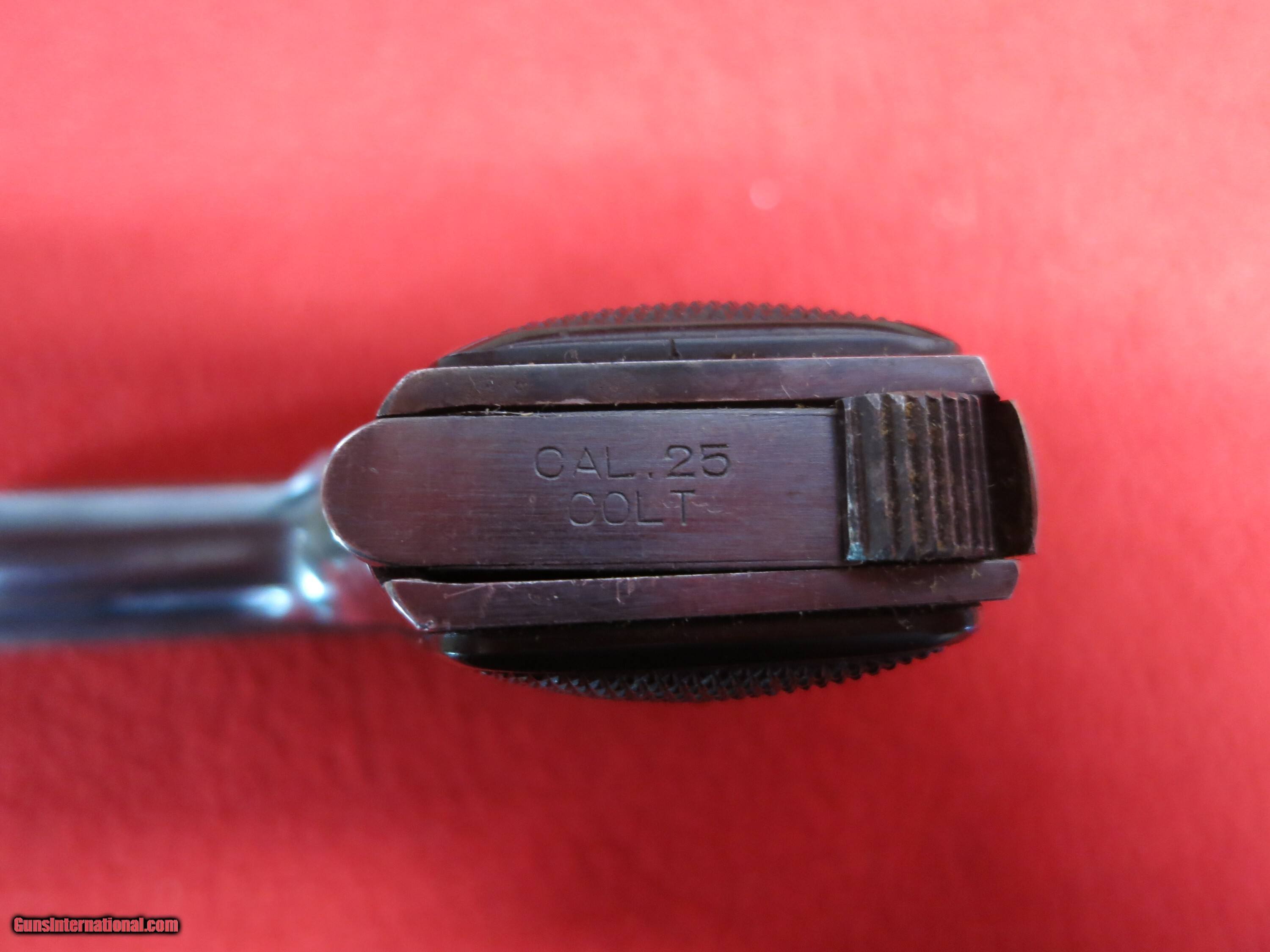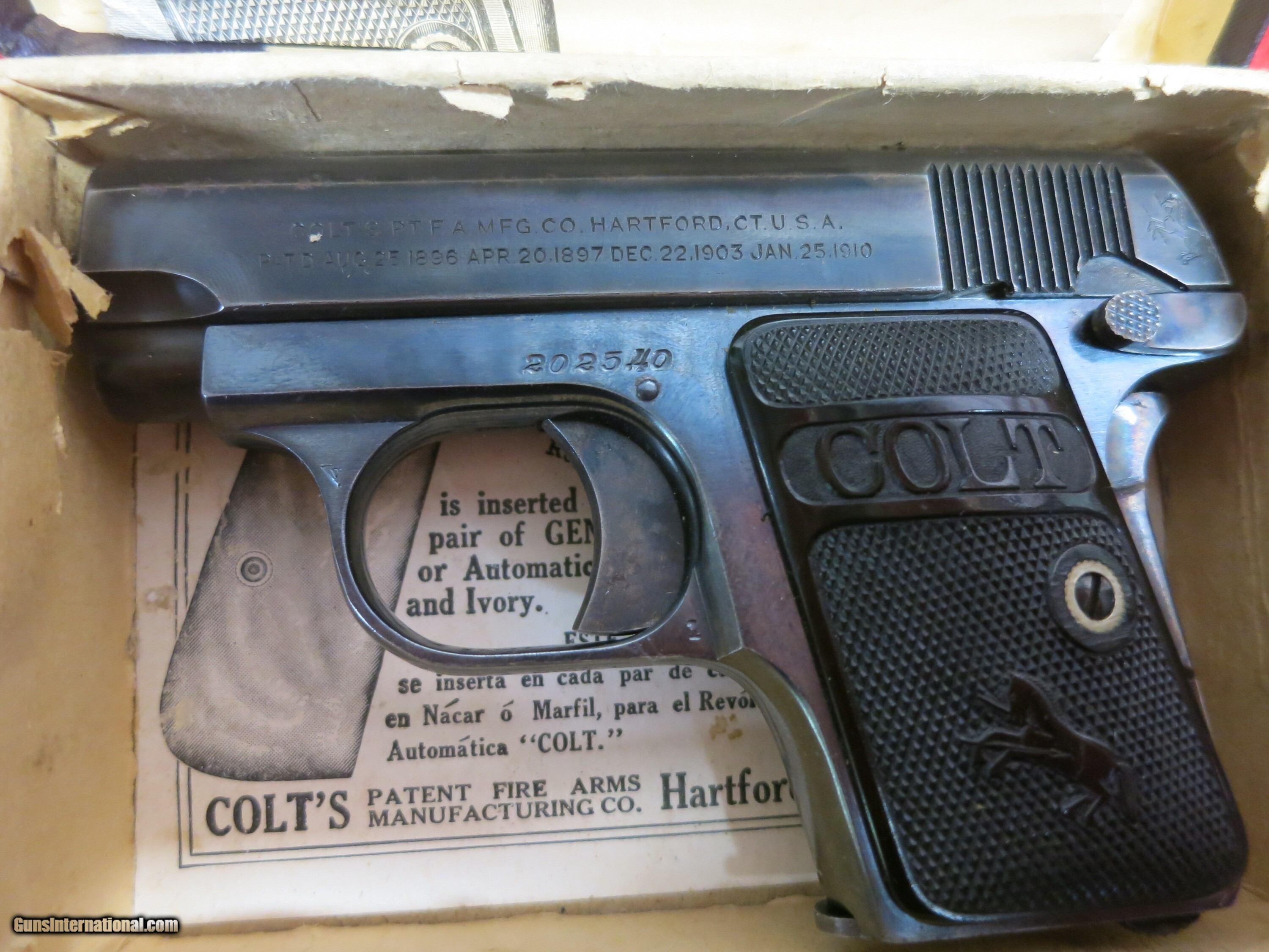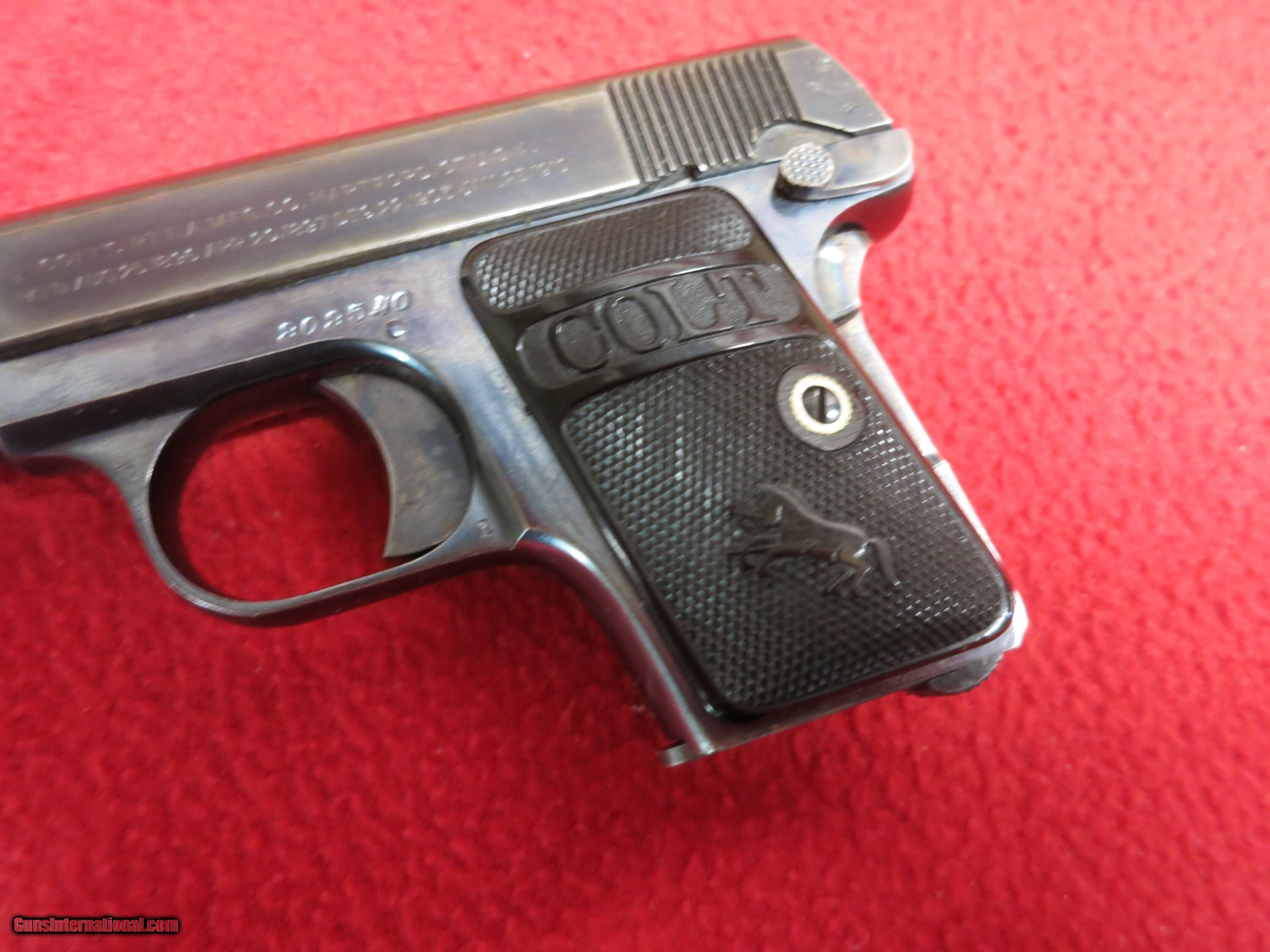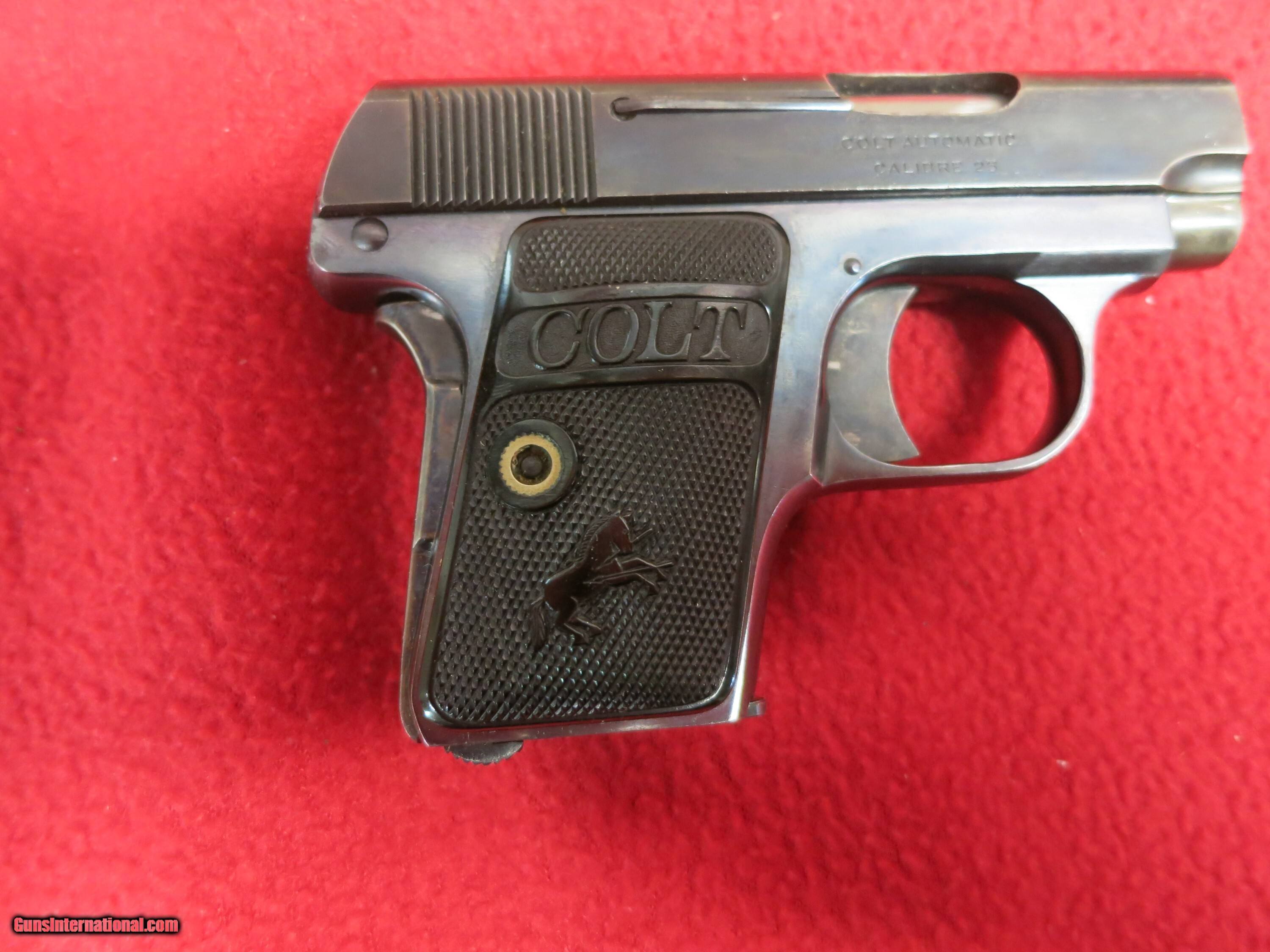 Description: COLT MODEL 1908 VEST POCKET PISTOL. CAL 25 AUTOMATIC. THE BLUE IS DEEP COLT CARBONA BLUE OR CHARCOAL BLUEING & STILL VERY GOOD. CASE HARDENING ON TRIGGER & BACK STRAP. THE COLT HARD RUBBER GRIPS ARE NEAR PERFECT. TWO TONE CLIP. MARKED CALBER 25 OVER COLT STAMPED ON THE BOTTOM OF MAG. COMES WITH BOX & PAPER WORK. REALLY NICE MODEL 1908. SN 202540. mfg. 1919. CALL OR E-MAIL WITH QUESTIONS; Price: $1,200.00 Contact Seller |