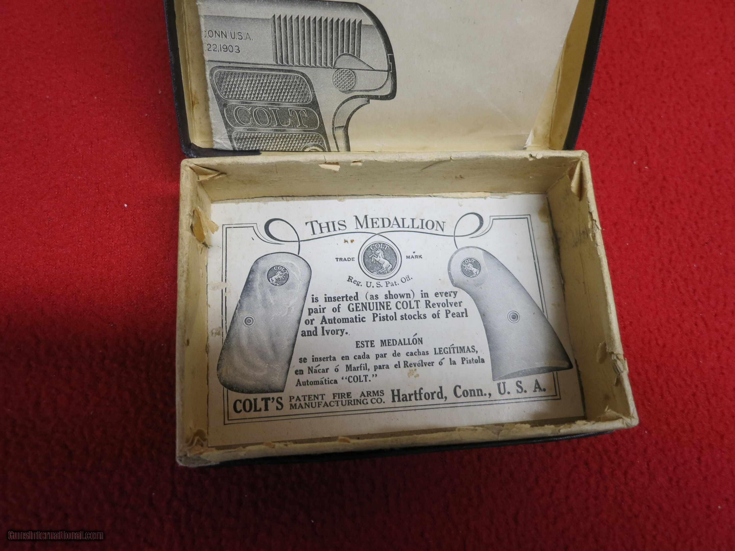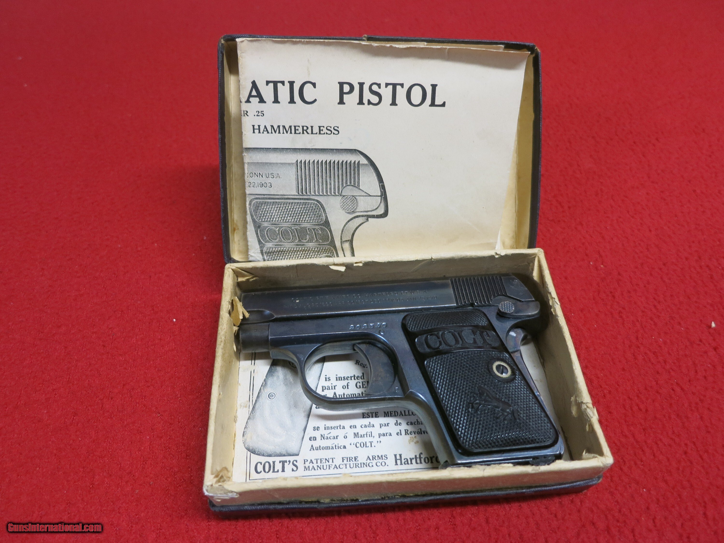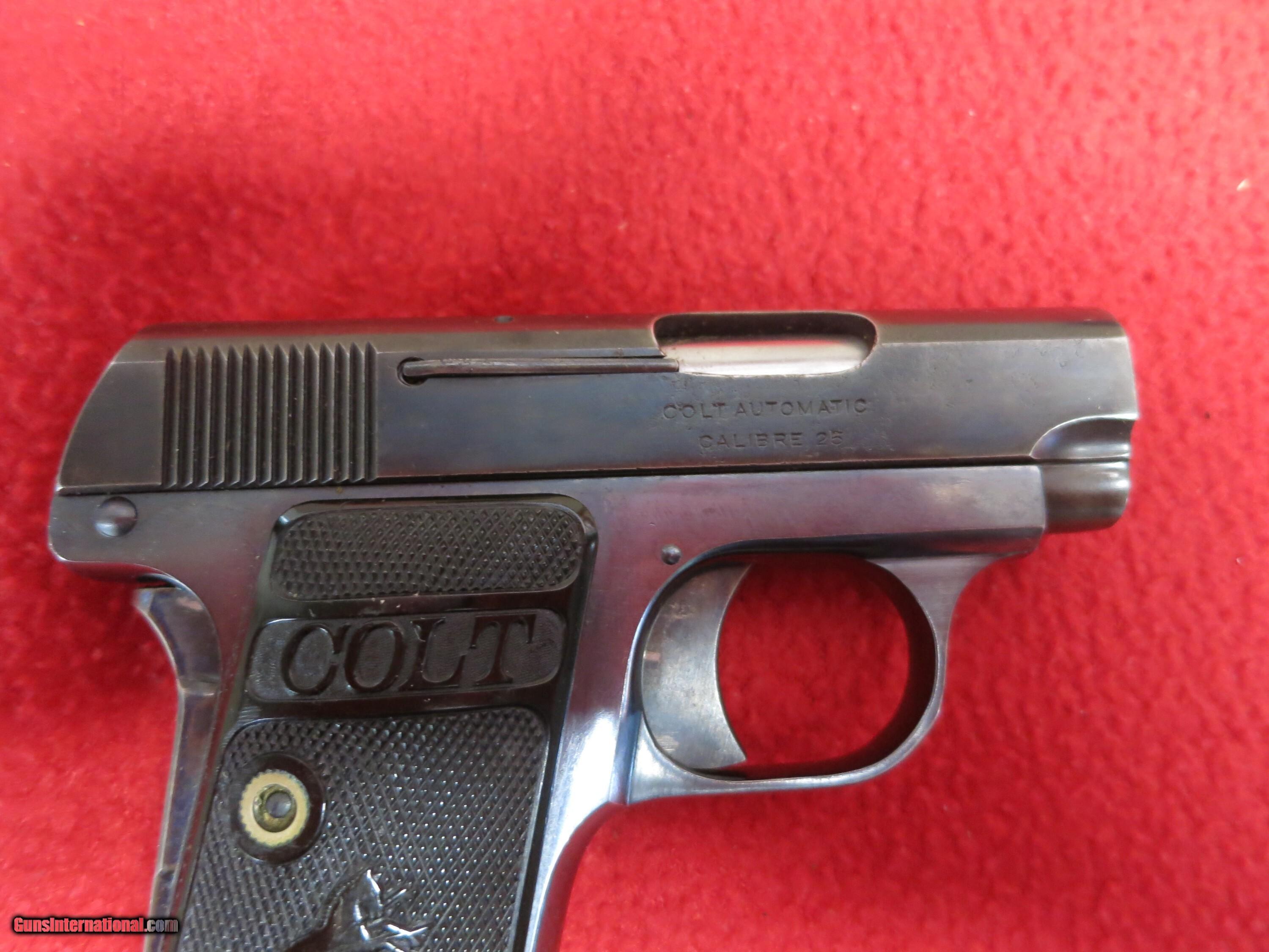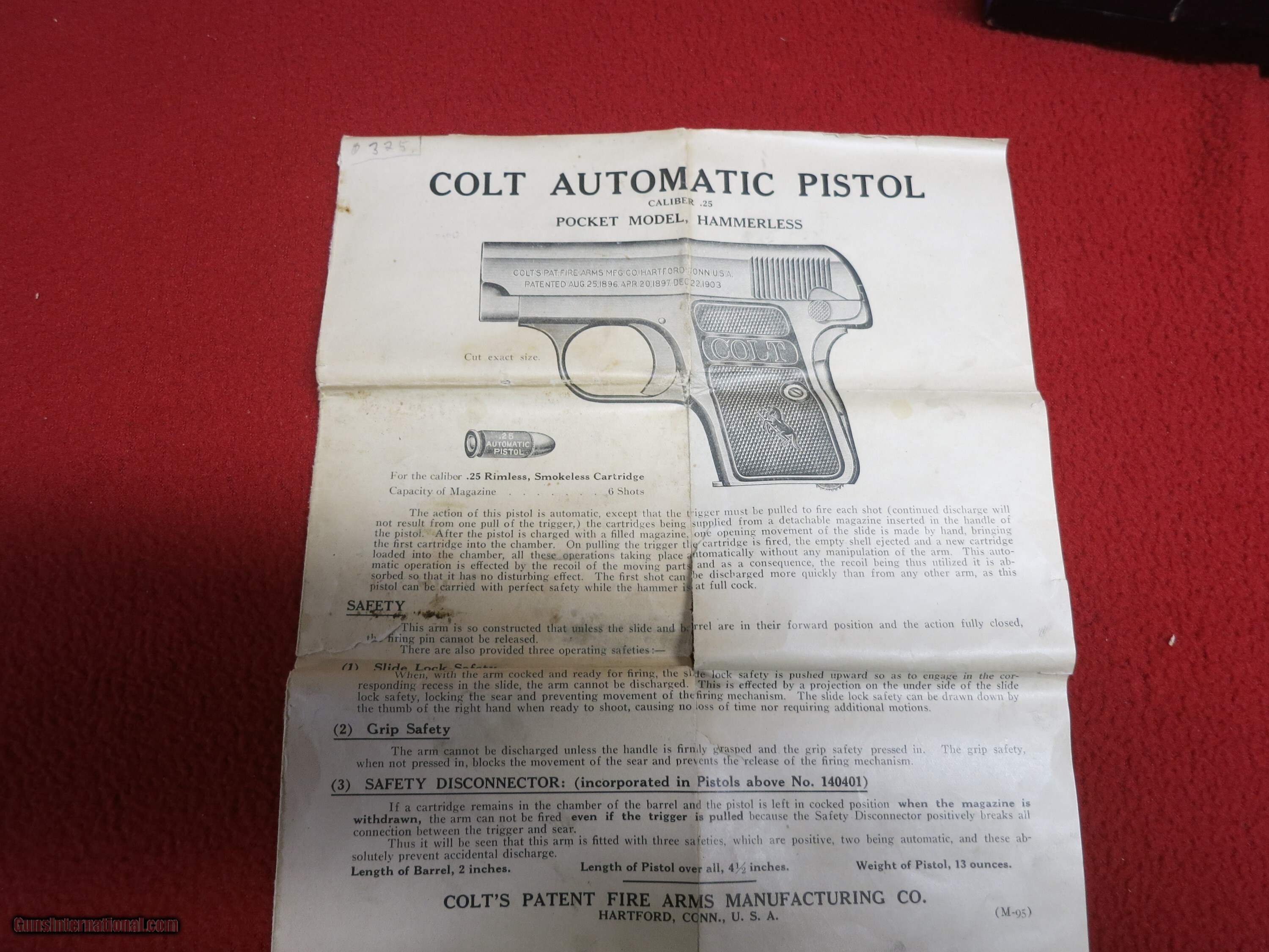 Description: COLT MODEL 1908 VEST POCKET PISTOL. CAL 25 AUTOMATIC. THE BLUE IS DEEP COLT CARBONA BLUE OR CHARCOAL BLUEING & STILL VERY GOOD. CASE HARDENING ON TRIGGER & BACK STRAP. THE COLT HARD RUBBER GRIPS ARE NEAR PERFECT. TWO TONE CLIP. MARKED CALBER 25 OVER COLT STAMPED ON THE BOTTOM OF MAG. COMES WITH BOX & PAPER WORK. REALLY NICE MODEL 1908. SN 202540. mfg. 1919. CALL OR E-MAIL WITH QUESTIONS; Price: $1,200.00 Contact Seller |